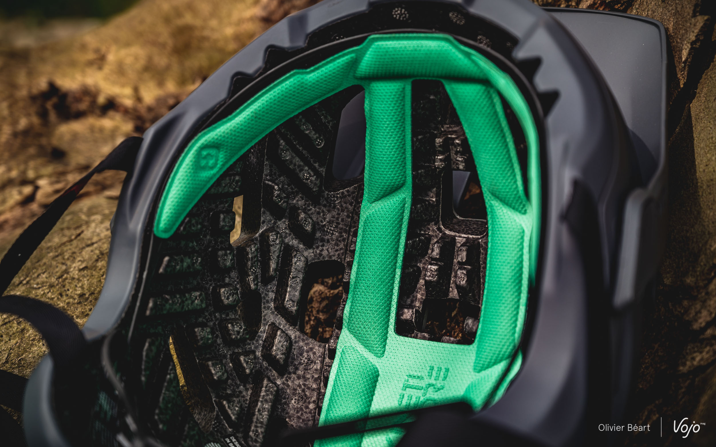 Contrairement à d’autres systèmes, le KinetiCore ne s’appuie pas sur un ajout de matériaux quelque part dans le casque mais sur un retrait. De l’extérieur, il n’y a aucune différence avec un casque classique mais lorsqu’on retourne le casque pour regarder à l’intérieur, cela saute aux yeux. A la place d’une coque uniforme classique, la tête repose sur des « picots » de mousse EPS, séparés par des canaux.