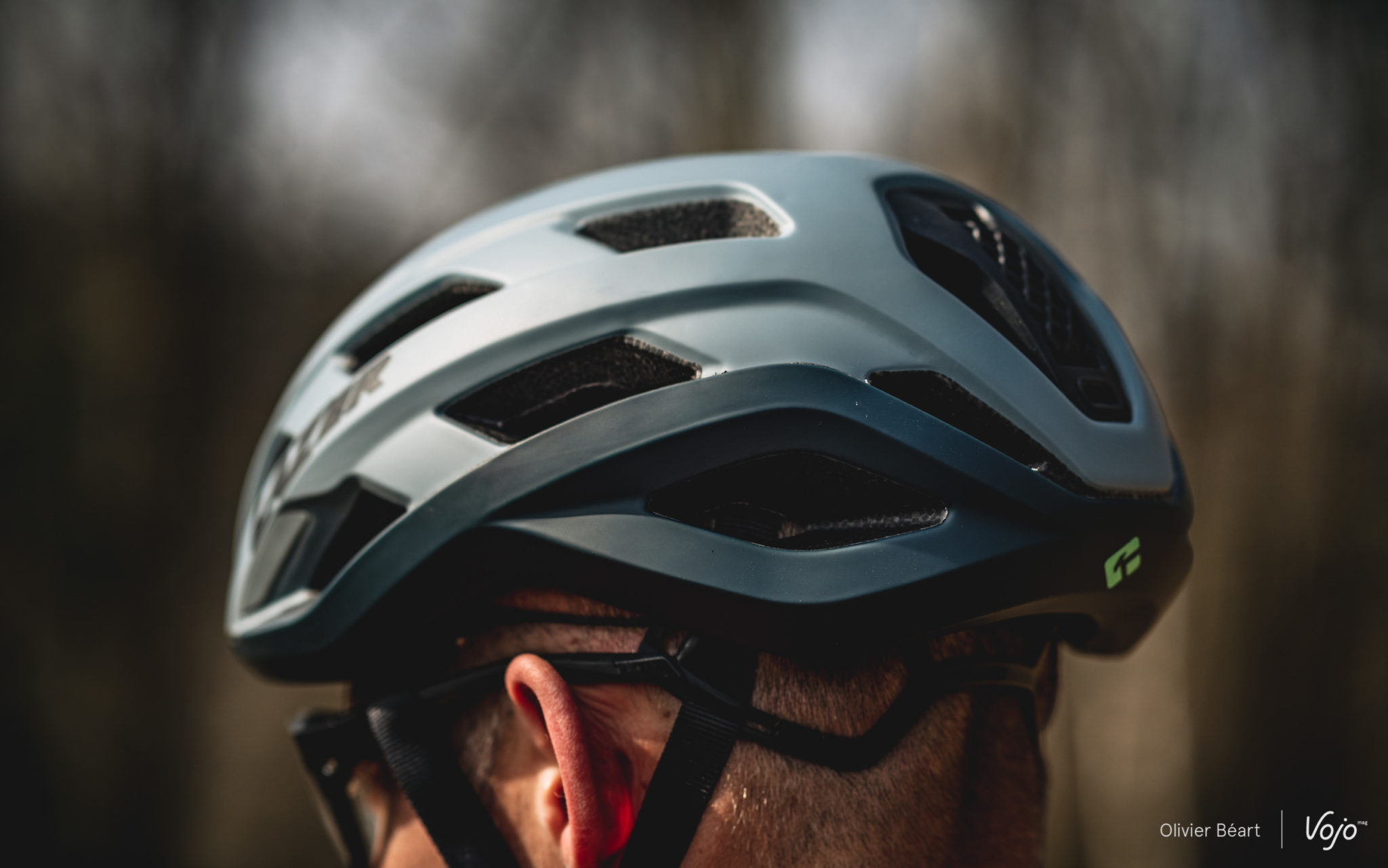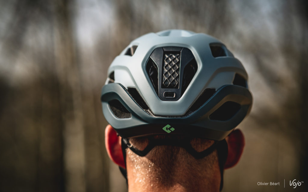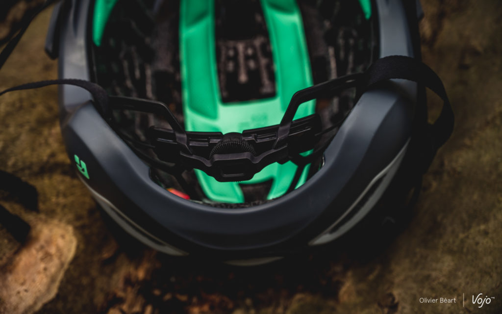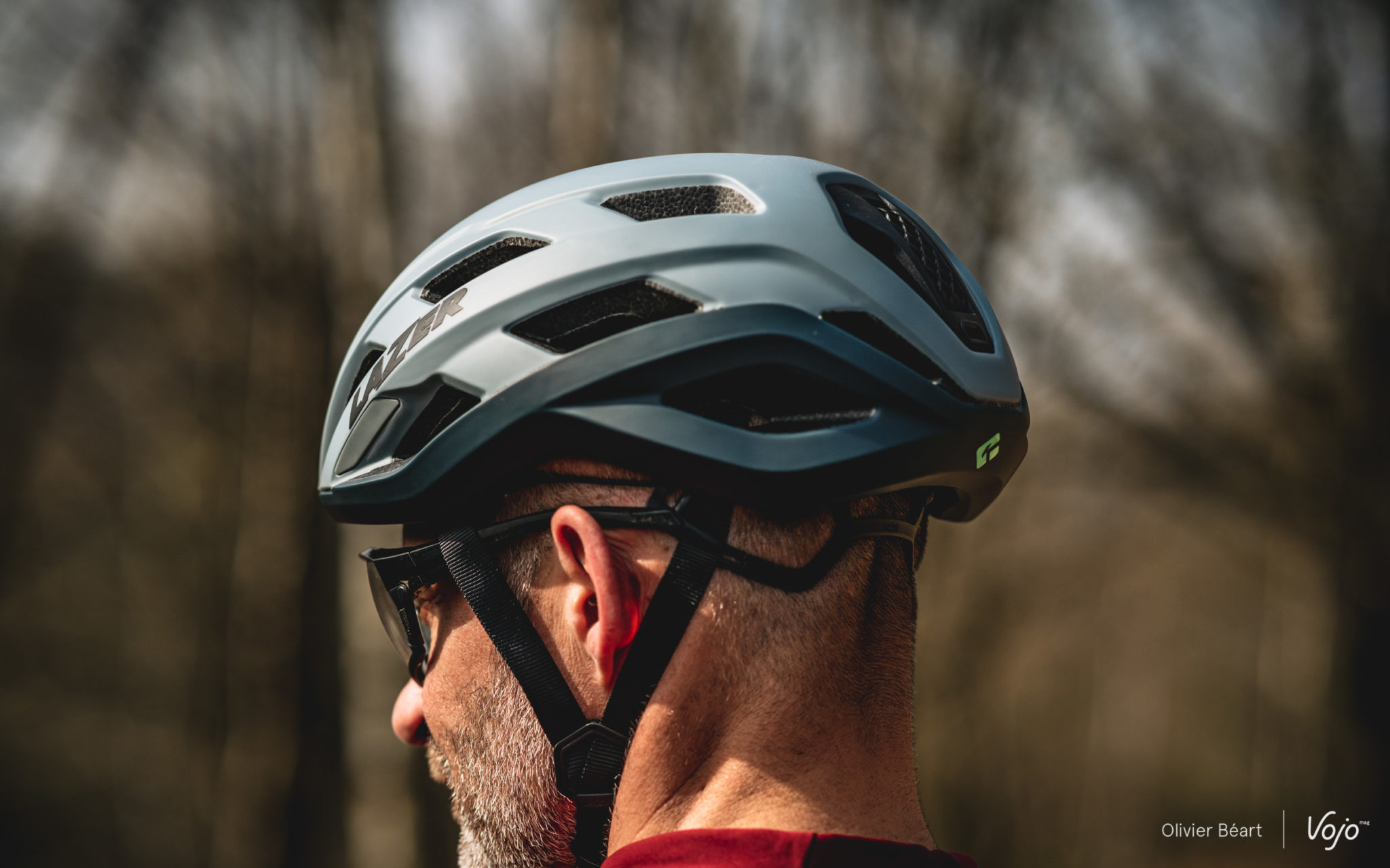 Commençons par le Strada, le modèle sans visière route/XC/gravel moyen de gamme. Contrairement au Jackal, nous ne connaissions pas sa version précédente et cela a donc été une découverte. La première chose qui frappe, c’est son système de serrage innovant par une sorte de bande en caoutchouc souple, très large mais bien intégrée sur l’arrière du casque. Et ça fonctionne : le maniement est simple et efficace, avec un maintien très convaincant.
