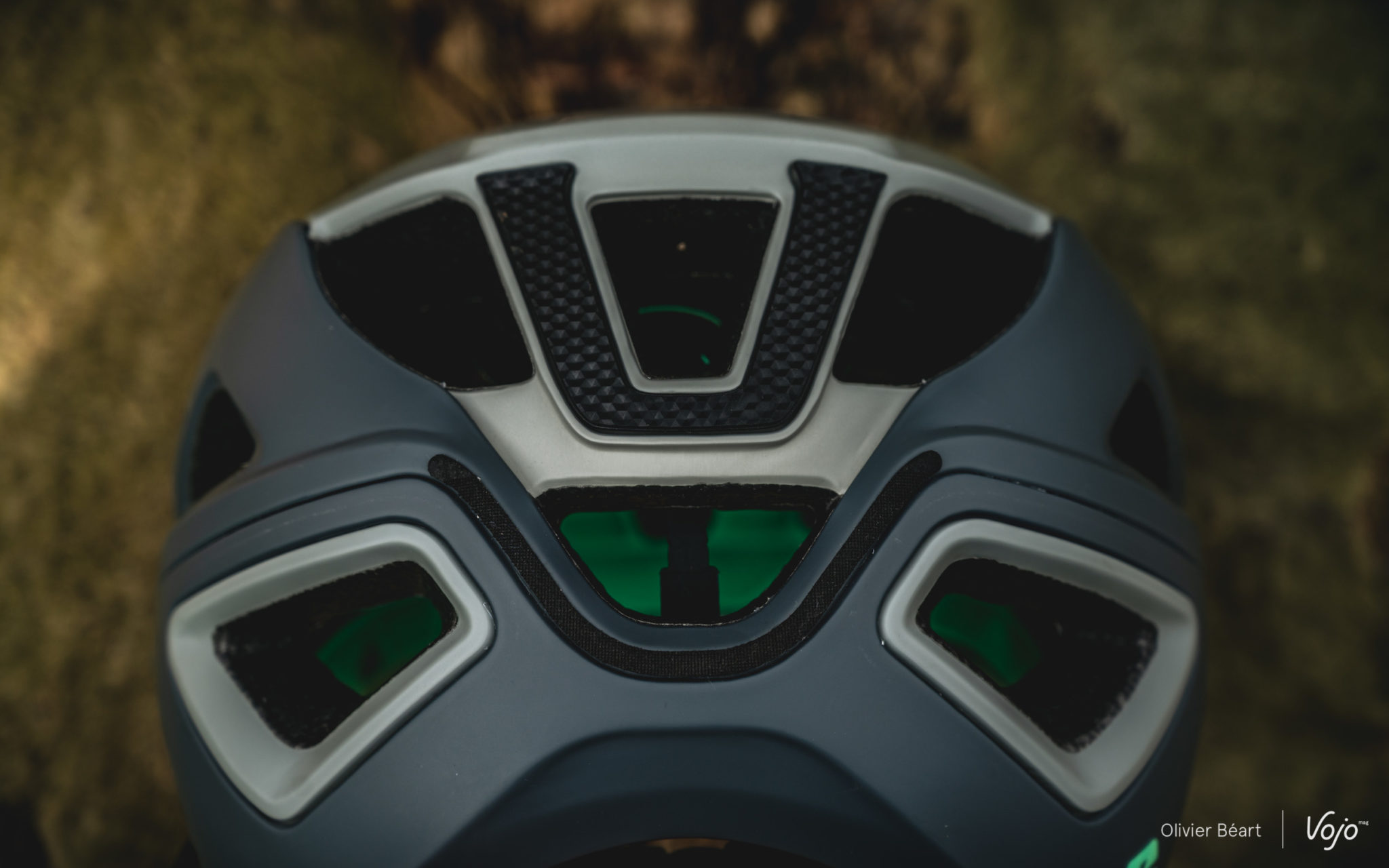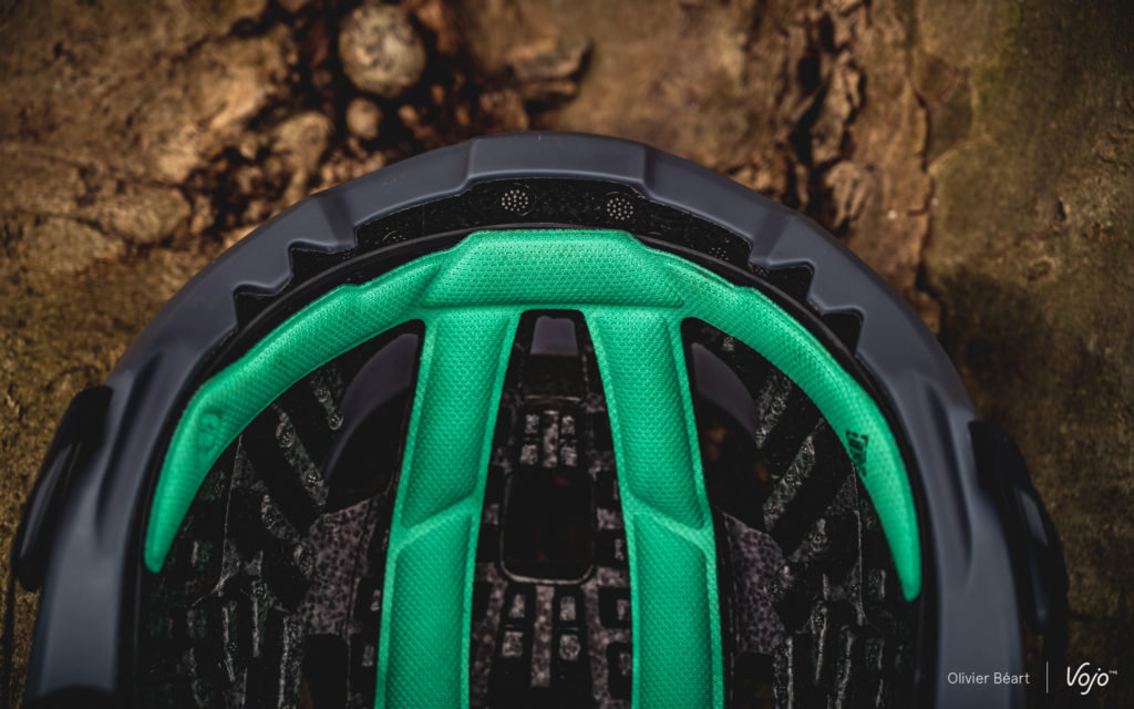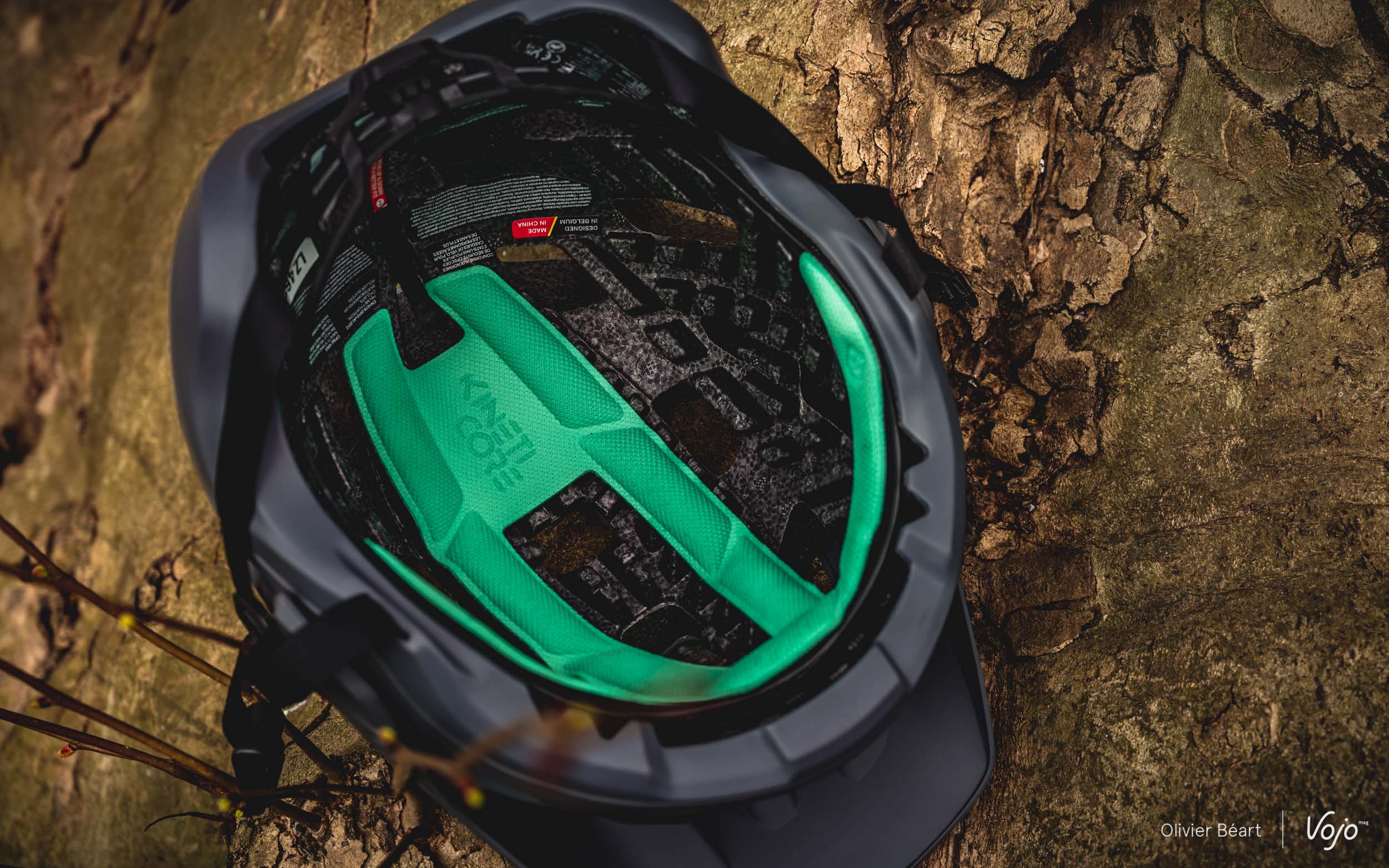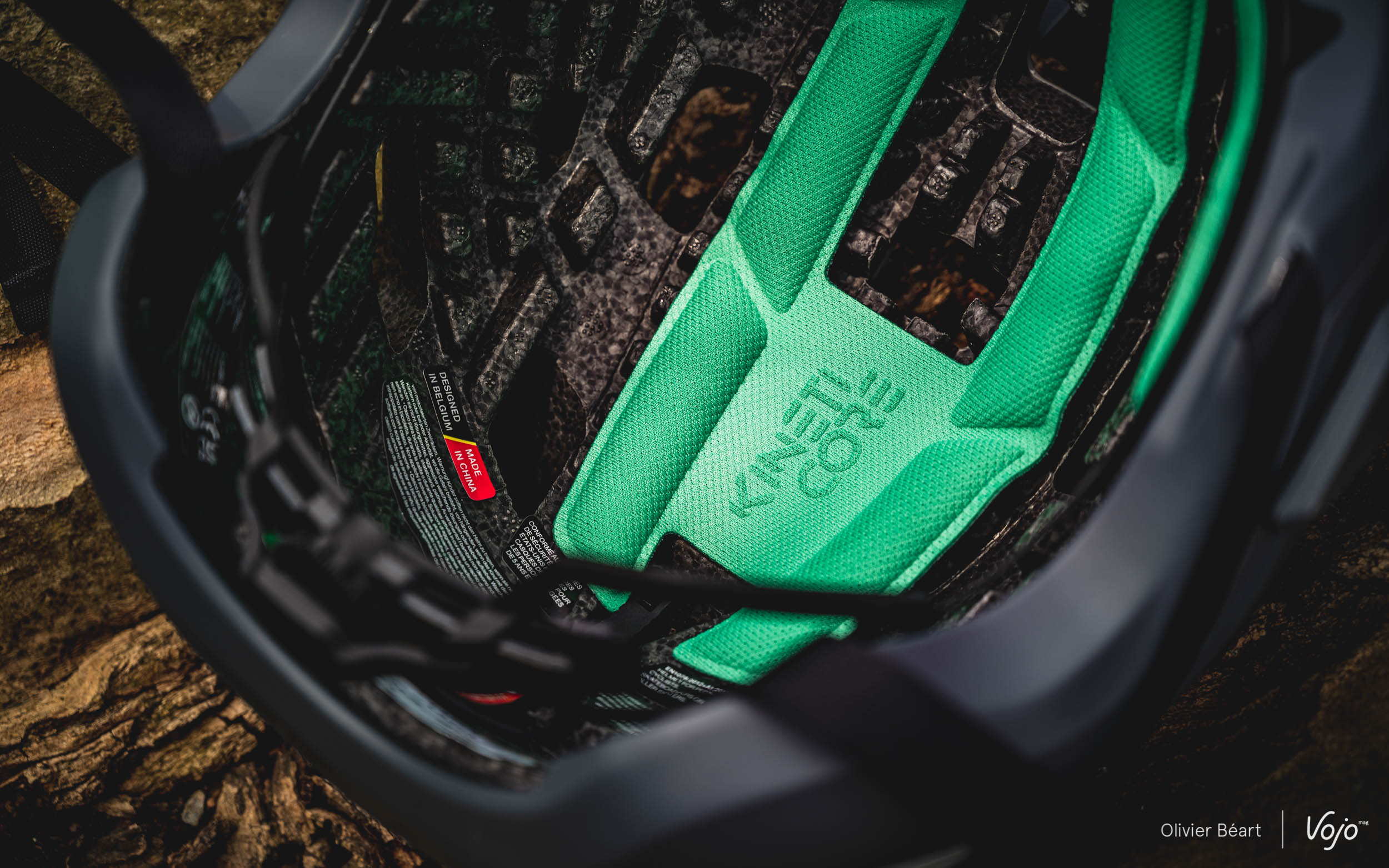 Contrairement à d’autres systèmes, le KinetiCore ne s’appuie pas sur un ajout de matériaux quelque part dans le casque mais sur un retrait. De l’extérieur, il n’y a aucune différence avec un casque classique mais lorsqu’on retourne le casque pour regarder à l’intérieur, cela saute aux yeux. A la place d’une coque uniforme classique, la tête repose sur des « picots » de mousse EPS, séparés par des canaux.