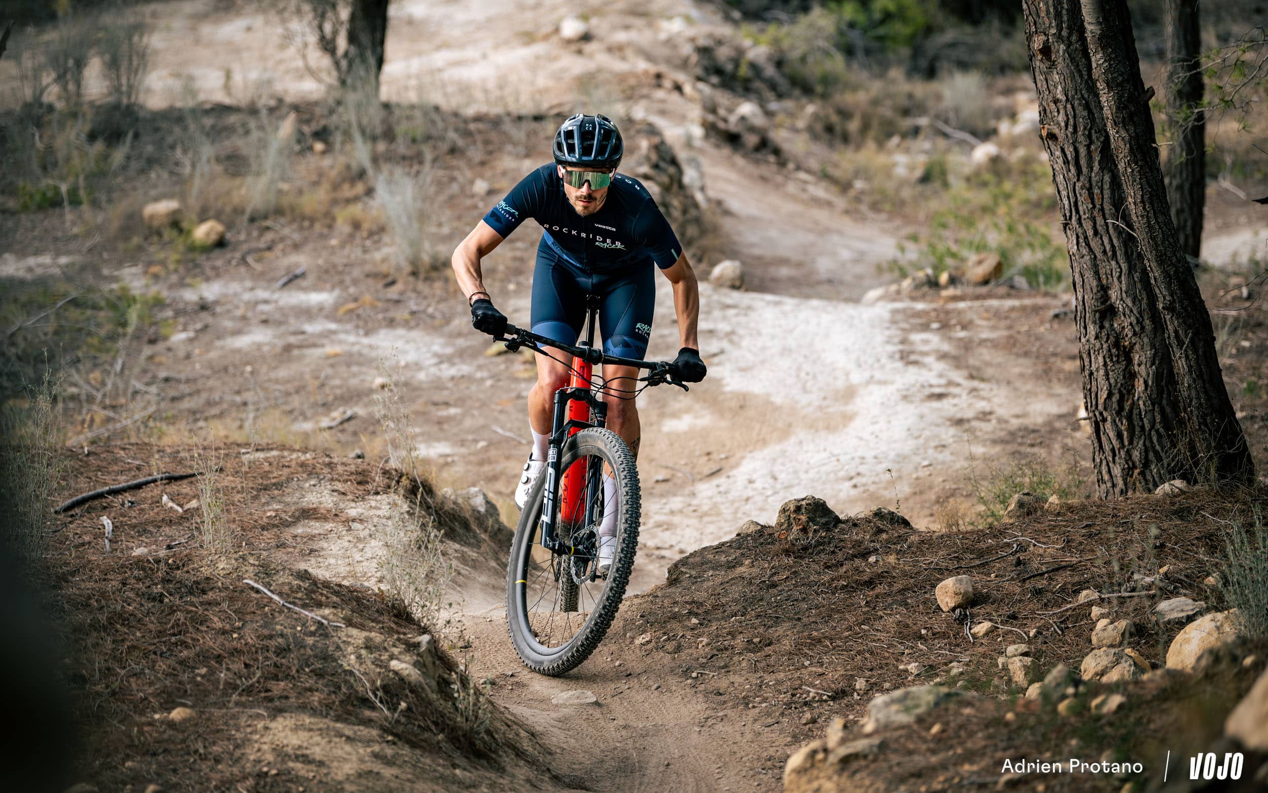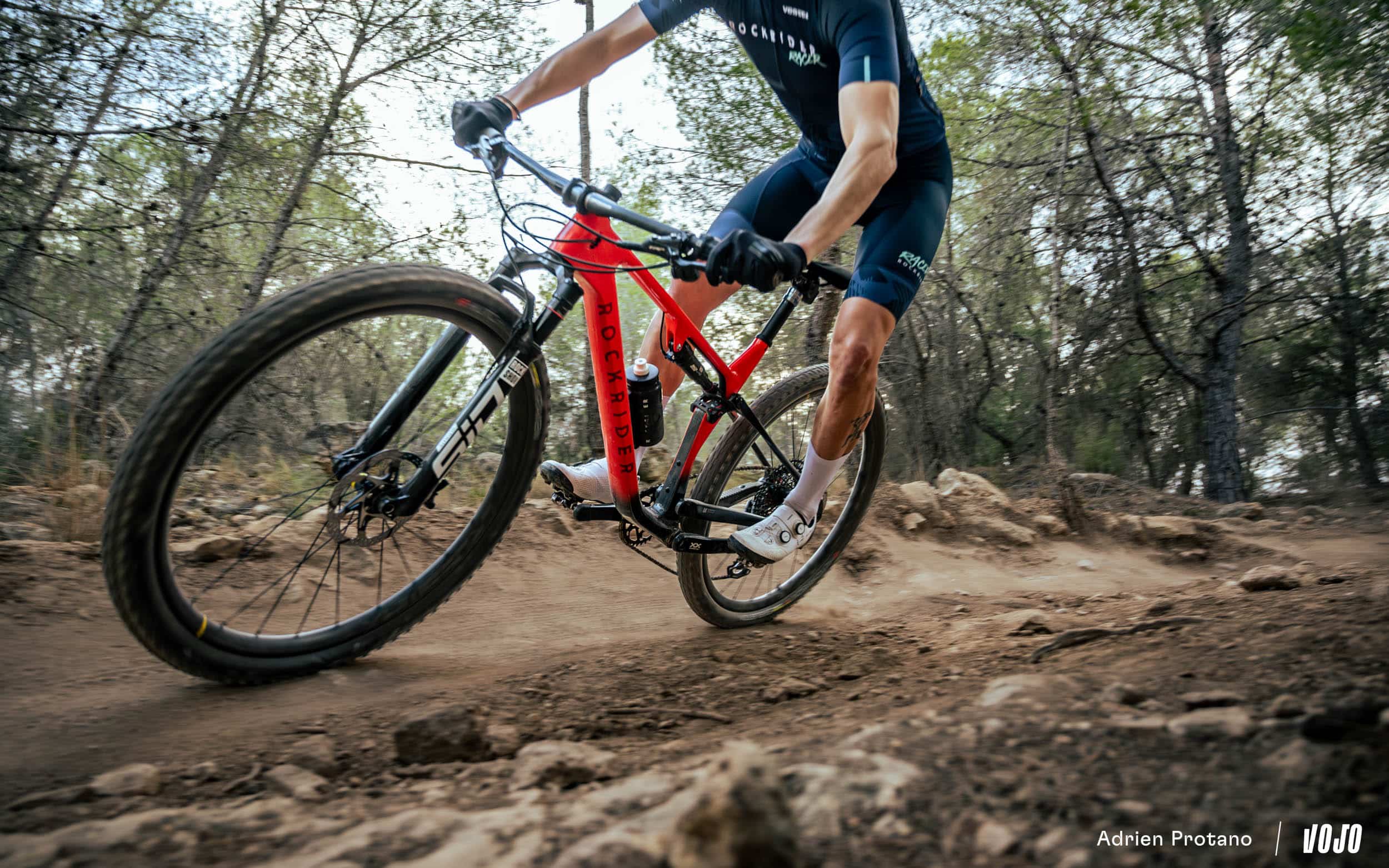 Avant toute chose, il nous faut rappeler qu’il ne s’agit pas ici d’un test en bonne et due forme comme on l’entend traditionnellement sur Vojo, c’est-à-dire réalisé pendant plusieurs semaines sur nos circuits d’essai habituels, mais bien seulement d’une prise en main en amont de la sortie du vélo. Si une telle entrevue avec le vélo ne nous permet évidemment pas de fournir des conclusions précises et poussées sur ce Rockrider Race 940 S, cela offre toutefois la possibilité de cerner les traits de caractère principaux du châssis et de pouvoir aiguiller sur le type d’usage et de pratiquants auquel ce nouveau Rockrider s’adresse.