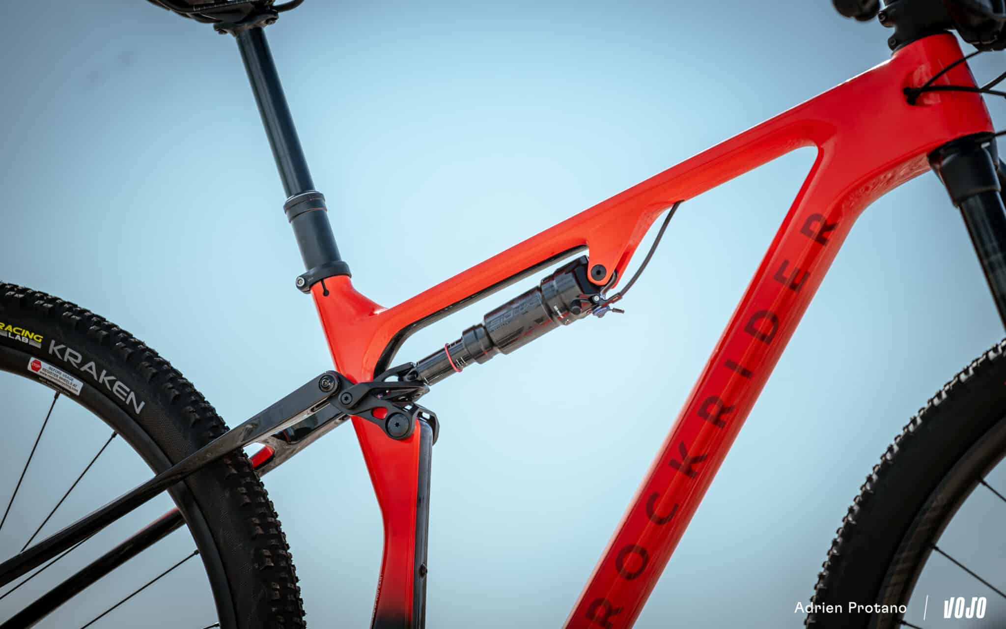 Si le niveau de gamme des suspensions diffère entre les deux versions au catalogue de la marque, toutes deux sont construites sur base d’une classique architecture type monopivot + biellette, largement éprouvée sur de nombreux modèles de cross-country. Les deux versions de ce Rockrider Race 940 S développent 120 mm de débattement avant/arrière, choix qui tend à s’imposer en cross-country selon Rockrider.