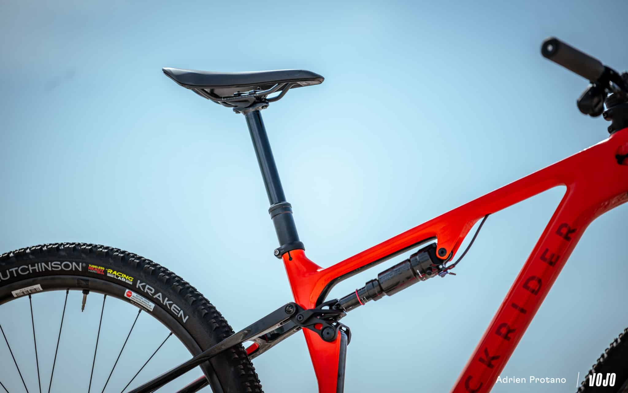 On se contentera ici de rappeler que le cadre est entièrement construit en carbone et affiche 1,655 kg sans amortisseur en taille M, et 1,9 kg une fois équipé de la suspension arrière. Au-delà d’une question de poids en tant que tel, c’est surtout le ratio poids/rigidité que la marque explique avoir optimisé pour obtenir un châssis offrant la meilleure réactivité possible.