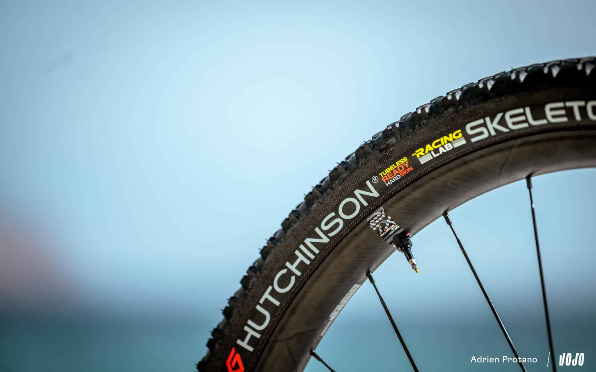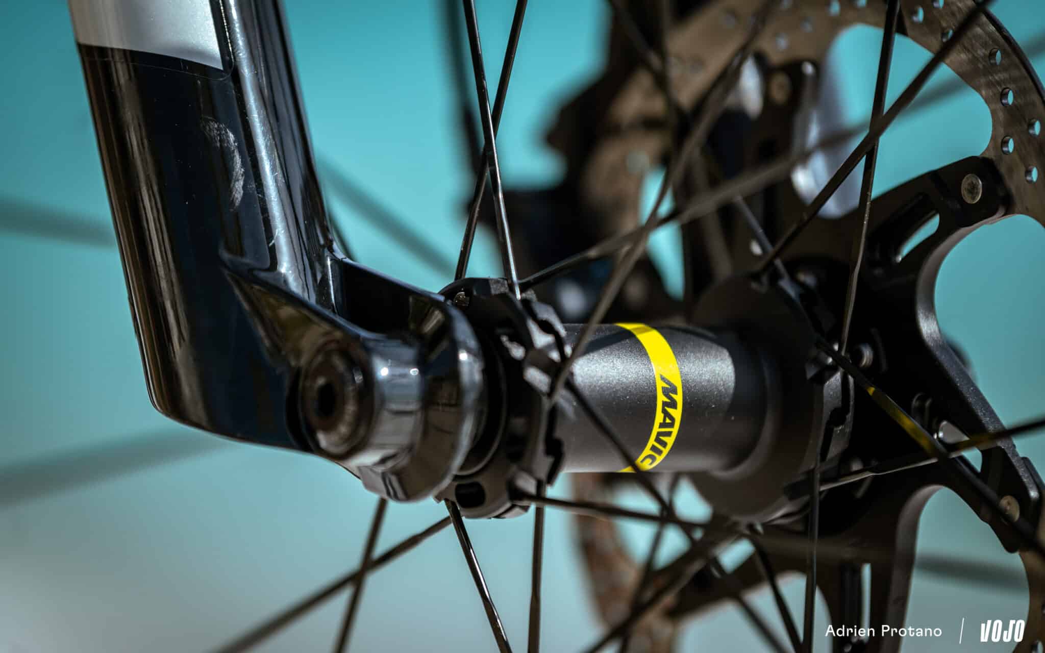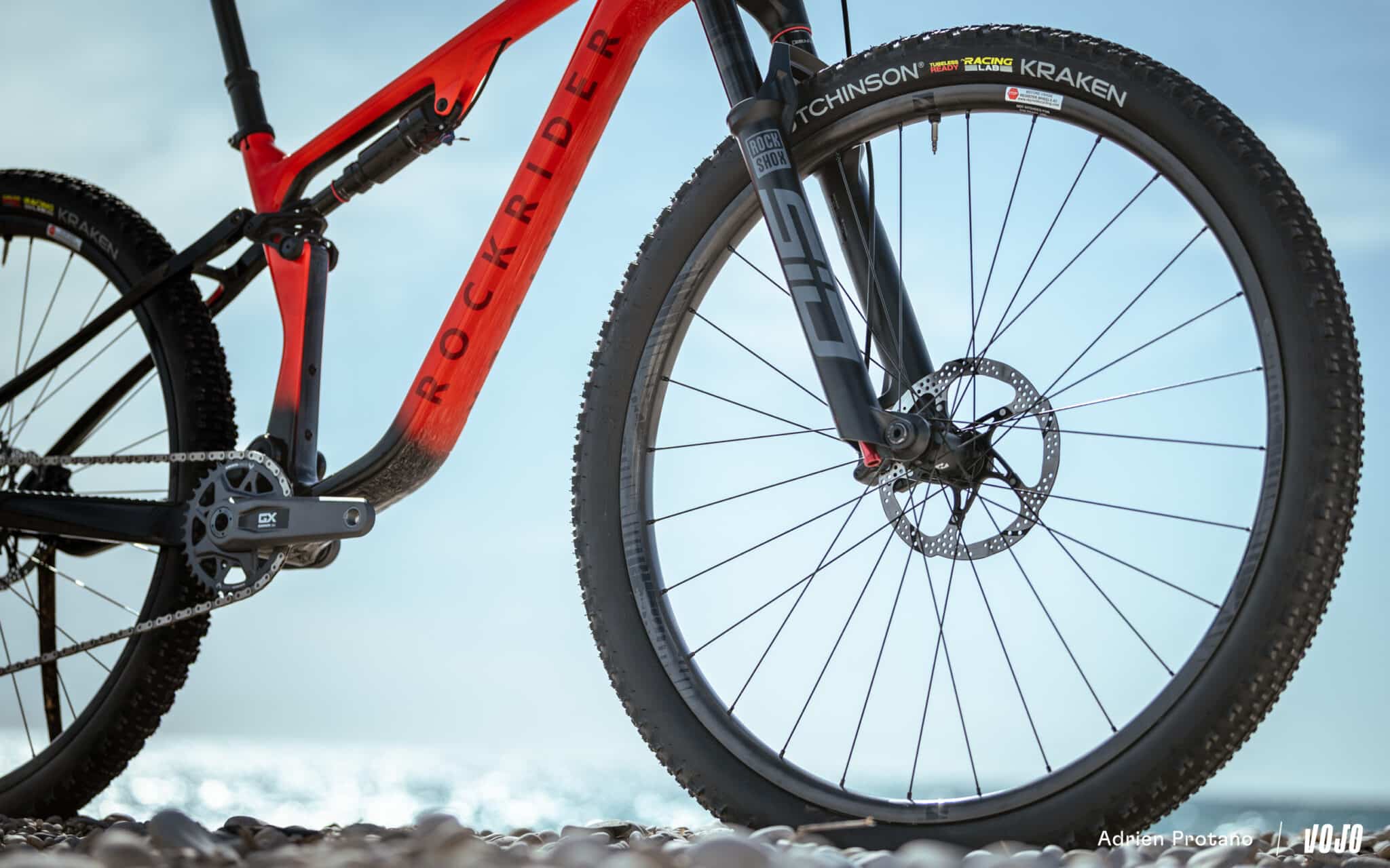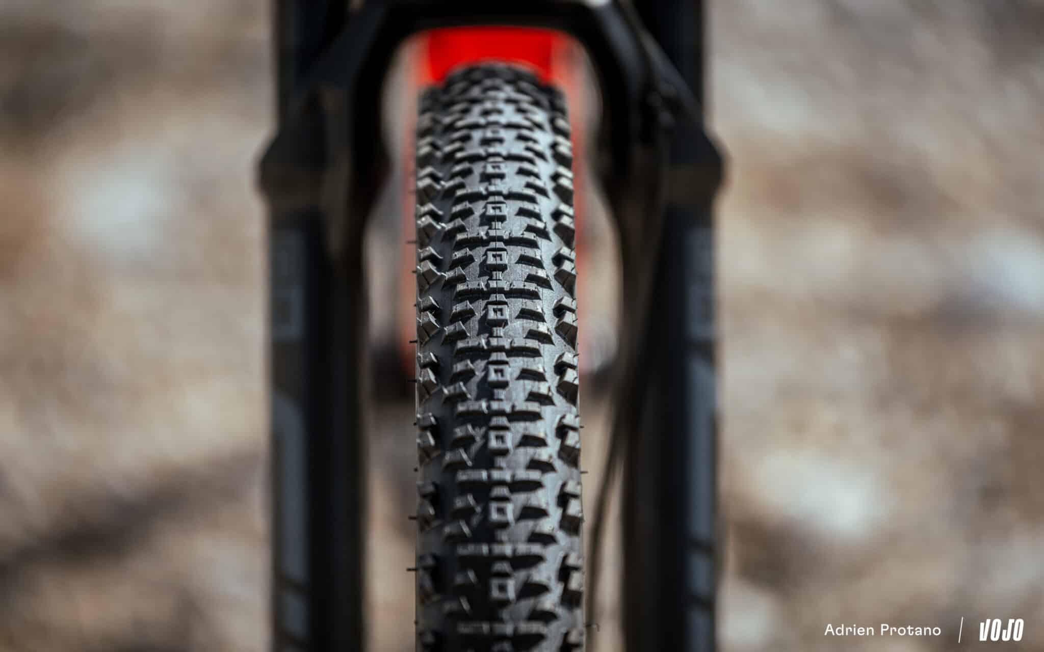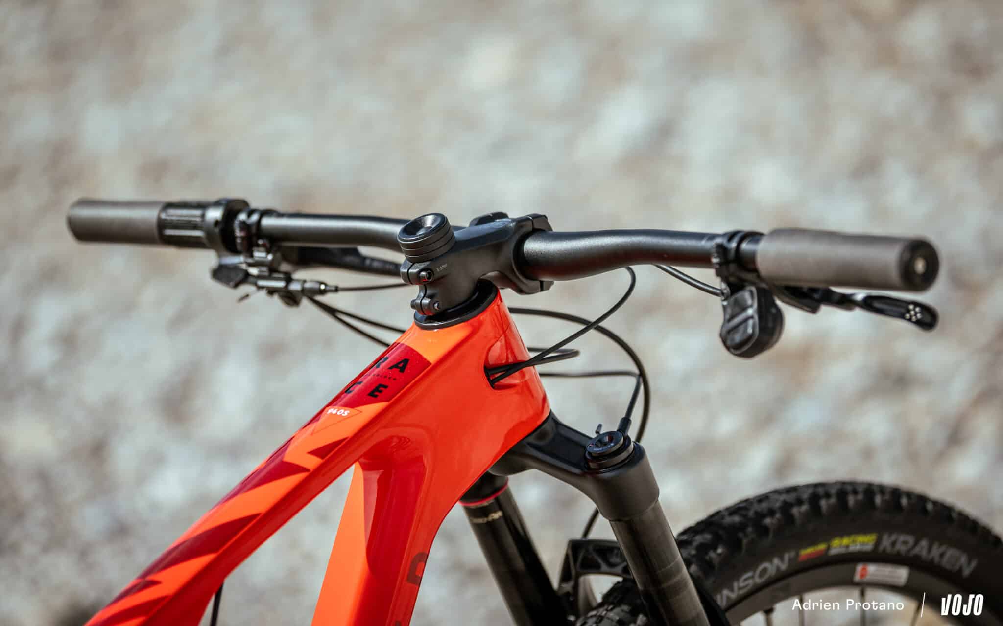 Cocorico du côté du train roulant puisque l’on retrouve une association de roues Mavic et de pneus Hutchinson. Les roues sont des Mavic Crossmax XLR, et celles-ci affichent une largeur interne de 30 mm pour un poids de 1595 g. « La question s’est posée par rapport aux Crossmax Ultimate, mais c’est le facteur du prix qui a été décisif. Pour rester en dessous de 6500€, il fallait opter pour les Crossmax XLR. C’est peut-être le seul « compromis » que l’on a dû faire sur cette version », nous explique la marque. Pour les pneus, c’est un Hutchinson Kraken Racing Lab en 2,30 qui chausse la roue avant et un Hutchinson Skeleton Racing Lab (carcasse Hardskin) en 2,30 que l’on retrouve à l’arrière.