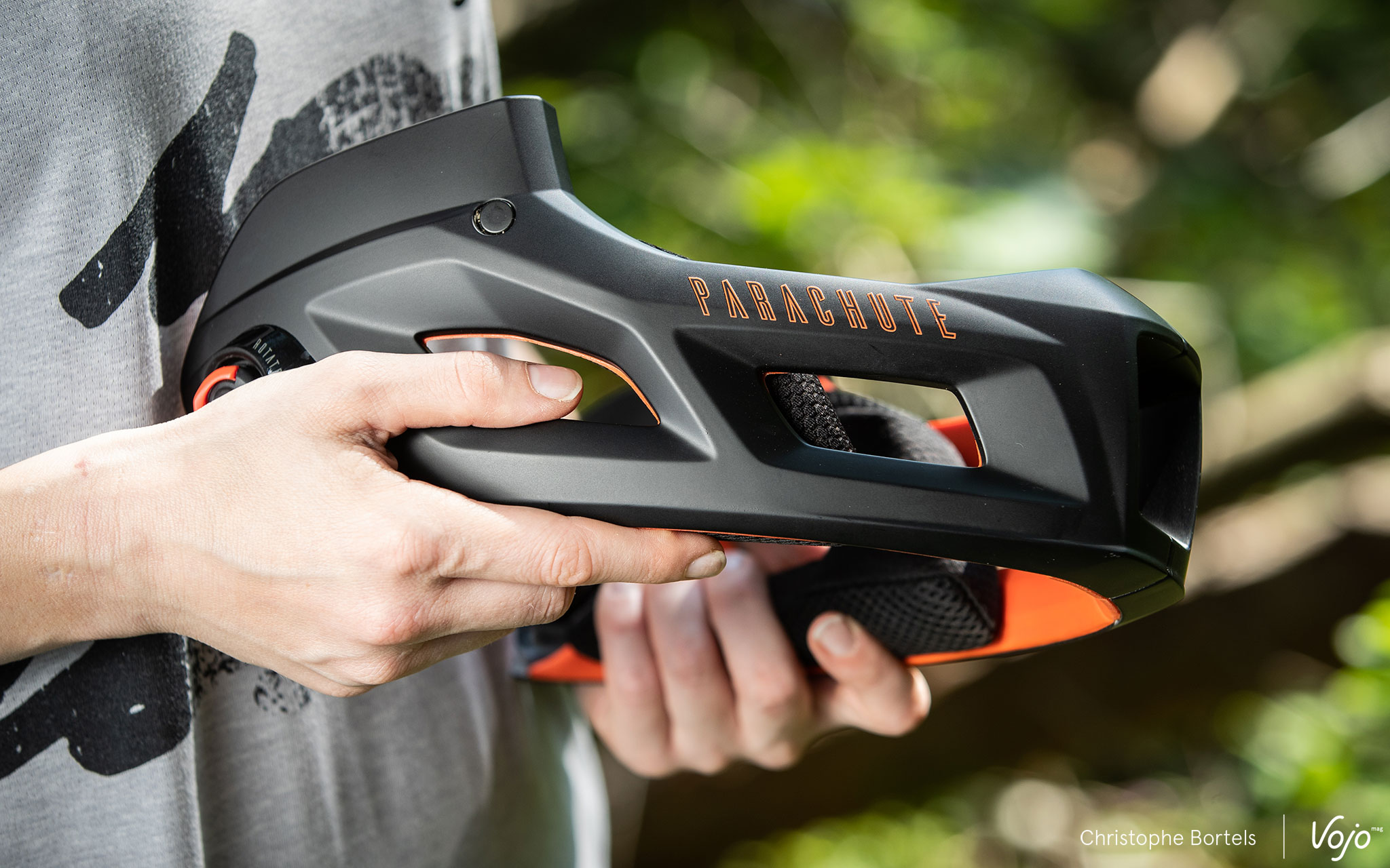 On constate également que l’ouverture à l’avant à été agrandie. Résultat, le champ de vision est élargi, un masque se fait une place sans problème (y compris sous la penne quand on la relève), il est plus facile de boire et, évidemment, la ventilation s’en ressent, bien aidée aussi par les grandes ouvertures dans la mentonnière. En action, la tête est bien aérée et on oublie presque qu’on porte un intégral. Pour autant, la doublure plus généreuse et la surface de contact plus importante qui en résulte font qu’on a un peu plus vite chaud qu’avec le « vieux » Parachute lors des longs pédalages. Mais il faut dire que celui-ci avait placé la barre très haut en matière de ventilation ! C’est donc là qu’intervient la mentonnière amovible…