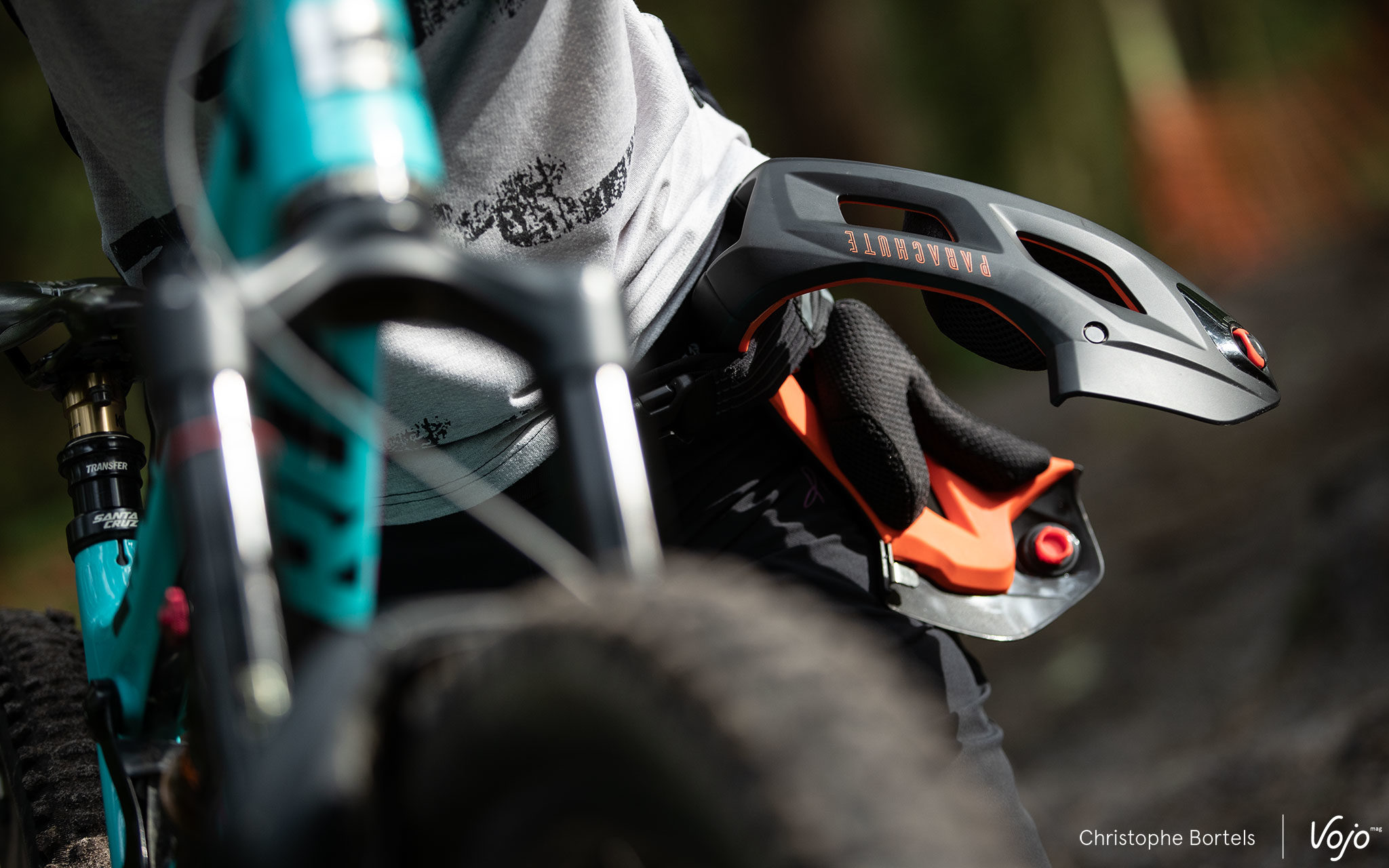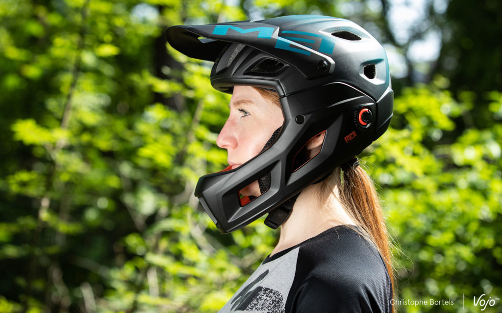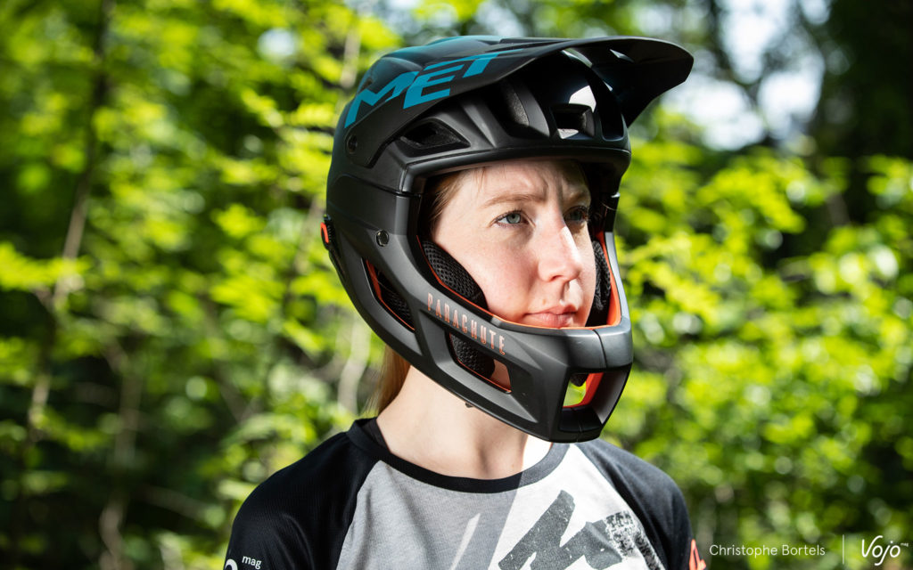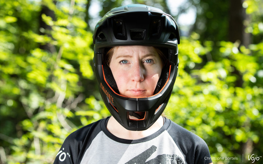 Une fois en mode « open face », on retrouve le confort de l’intégral, il faut toutefois veiller à placer le réglage occipital à la bonne hauteur pour assurer un bon maintien du casque. Sans être léger et ventilé comme un pur casque de XC, le Parachute s’en sort bien et fait le boulot pour un usage trail ou all-mountain qui ne nécessite pas la protection supplémentaire apportée par une mentonnière. Niveau look, il paraît un peu gros sur la tête, mais nos deux testeurs étaient pile entre deux tailles et ont opté pour la plus grande des deux – Medium – pour pouvoir au mieux comparer avec l’ancien Parachute, lui aussi utilisé en M. On pourrait donc sans doute retrouver une esthétique un peu plus fit avec un Small et des mousses de joues plus fines.