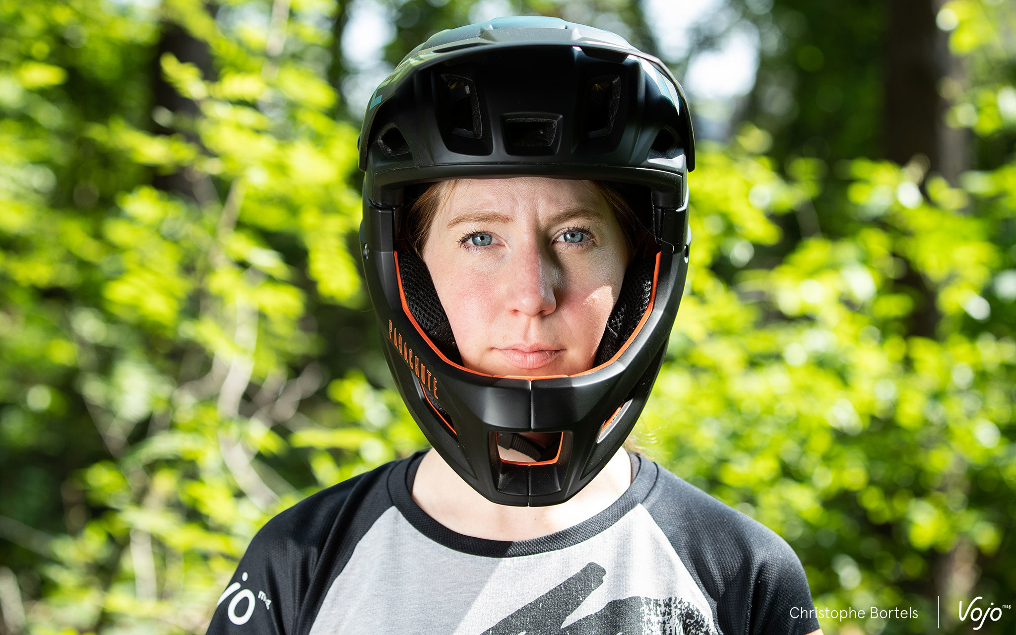 On constate également que l’ouverture à l’avant à été agrandie. Résultat, le champ de vision est élargi, un masque se fait une place sans problème (y compris sous la penne quand on la relève), il est plus facile de boire et, évidemment, la ventilation s’en ressent, bien aidée aussi par les grandes ouvertures dans la mentonnière. En action, la tête est bien aérée et on oublie presque qu’on porte un intégral. Pour autant, la doublure plus généreuse et la surface de contact plus importante qui en résulte font qu’on a un peu plus vite chaud qu’avec le « vieux » Parachute lors des longs pédalages. Mais il faut dire que celui-ci avait placé la barre très haut en matière de ventilation ! C’est donc là qu’intervient la mentonnière amovible…
