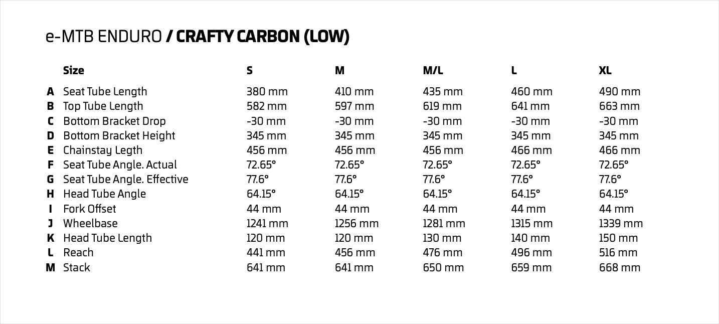 Véritable marque de fabrique de Mondraker et signature des châssis de la marque, le Crafty répond évidemment à la « Forward Geometry ». Pour rappel, et en rapide résumé, cette conception de géométrie se matérialise par un cadre au triangle avant (ou plus précisément au reach) important, associé à une potence (très) courte. Mais, pour ce nouveau Crafty, Mondraker a revu les tailles de ses vélos et introduit un nouveau M/L.