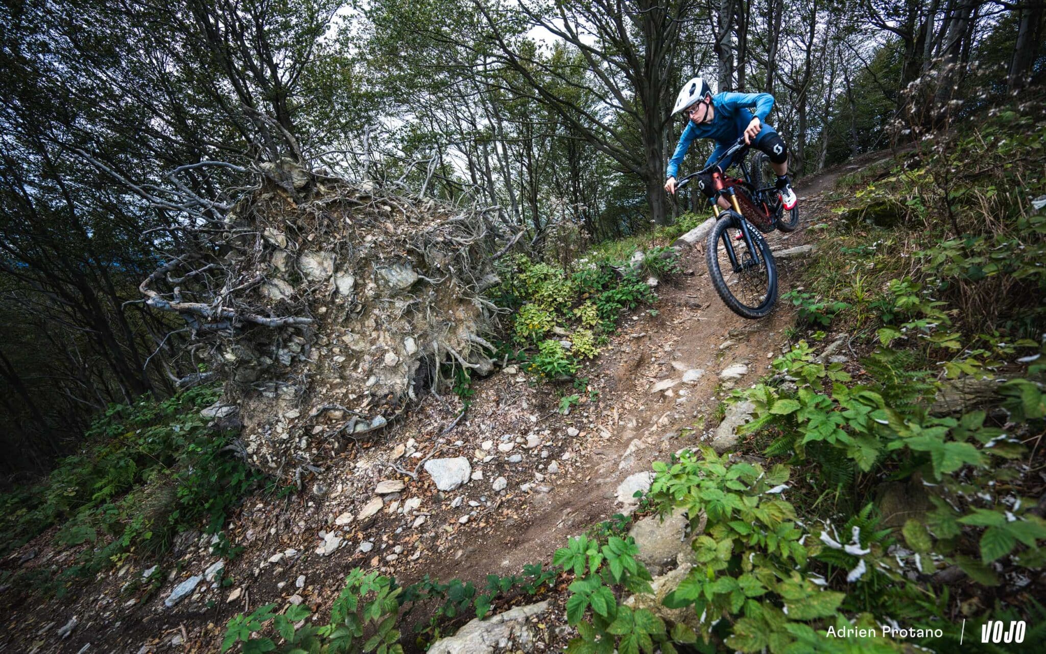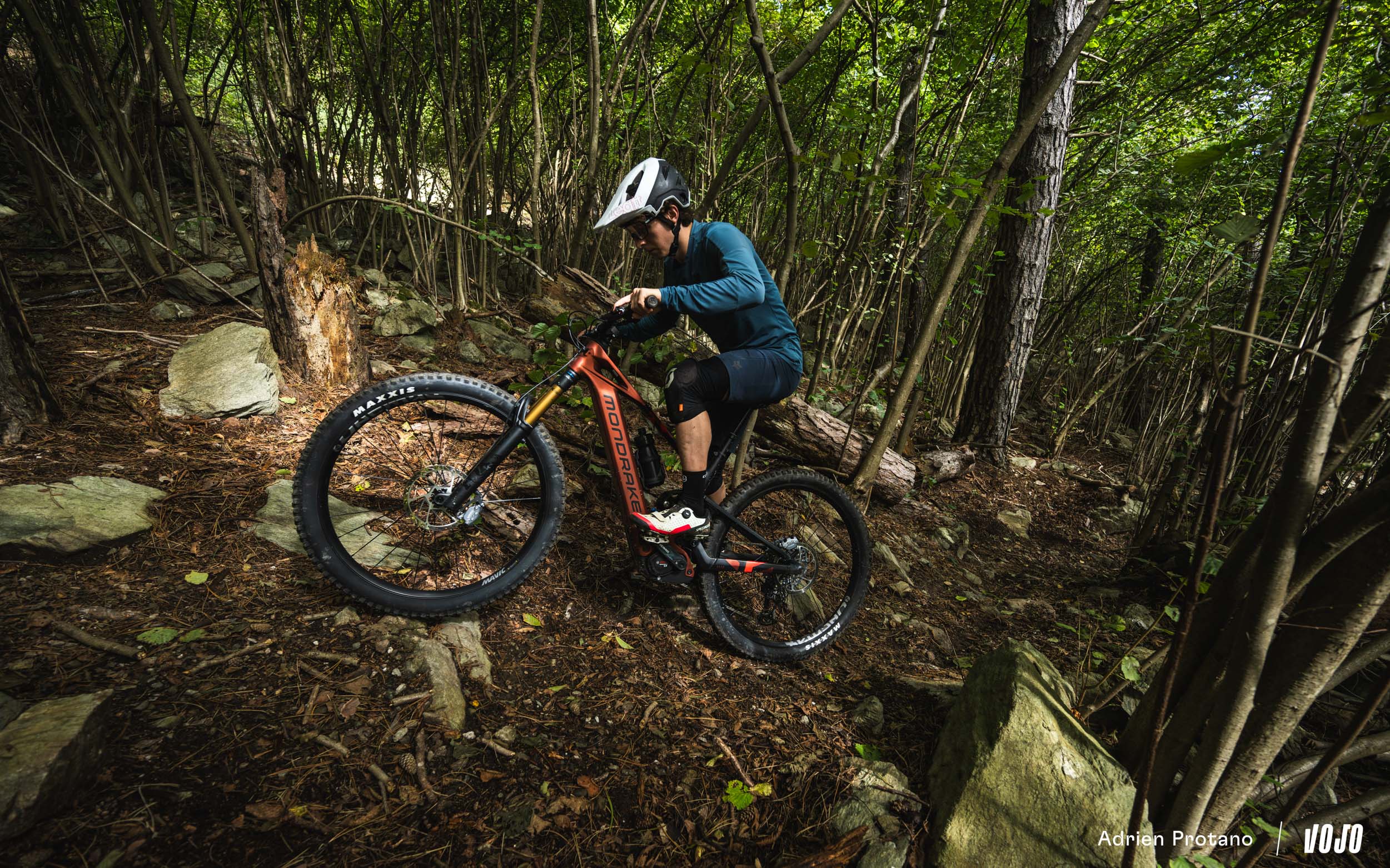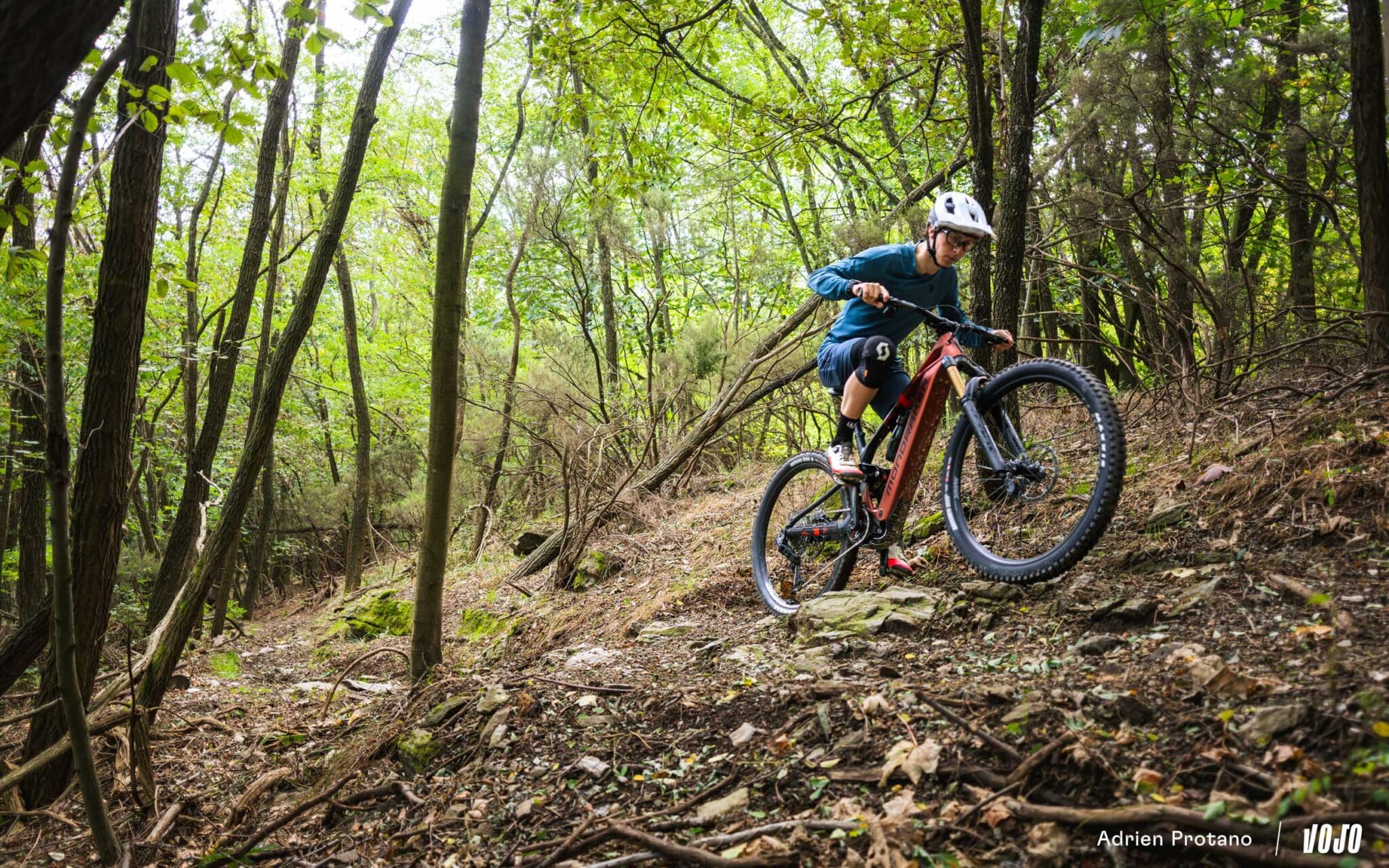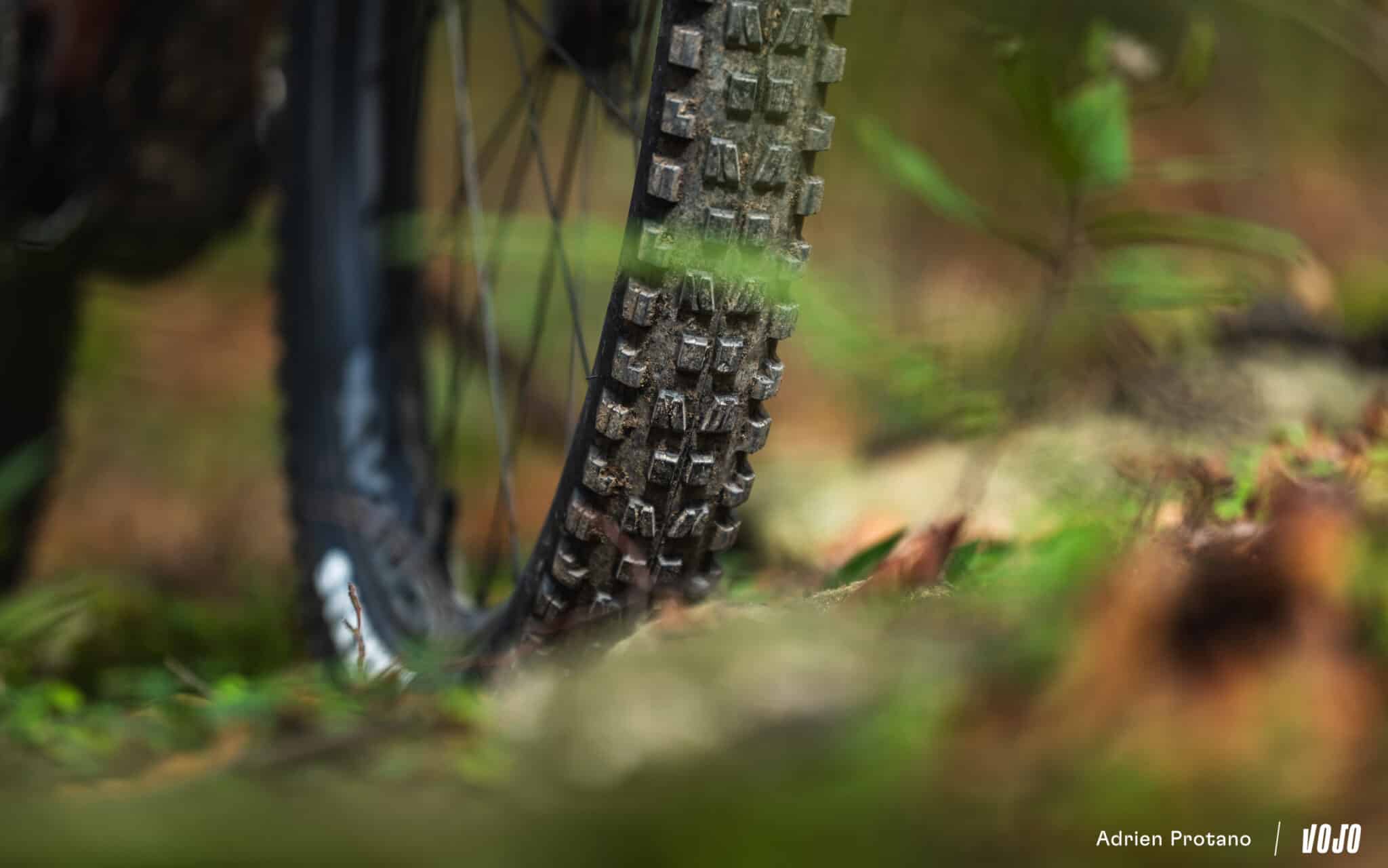 Nous n’avons pas eu l’occasion de les changer durant notre virée en Italie, mais les pneumatiques choisis par Mondraker nous ont par contre posé plus de soucis. Outre l’argument de la traction pour la roue arrière, nous n’arrivons pas à comprendre pourquoi la marque espagnole a opté pour une section de 2.6… Sur le terrain, cela s’est traduit par un sentiment de flou constant et de manque d’accroche. Bref, cela ne nous a pas empêchés d’emmener le vélo sur les spéciales italiennes, mais un remplacement par une monte à la section plus réduite nous semble tout indiqué. Dans la boue belge, où nous avons pu aussi le rouler un peu à notre retour, l’impression est la même et on recommande vraiment un changement.
