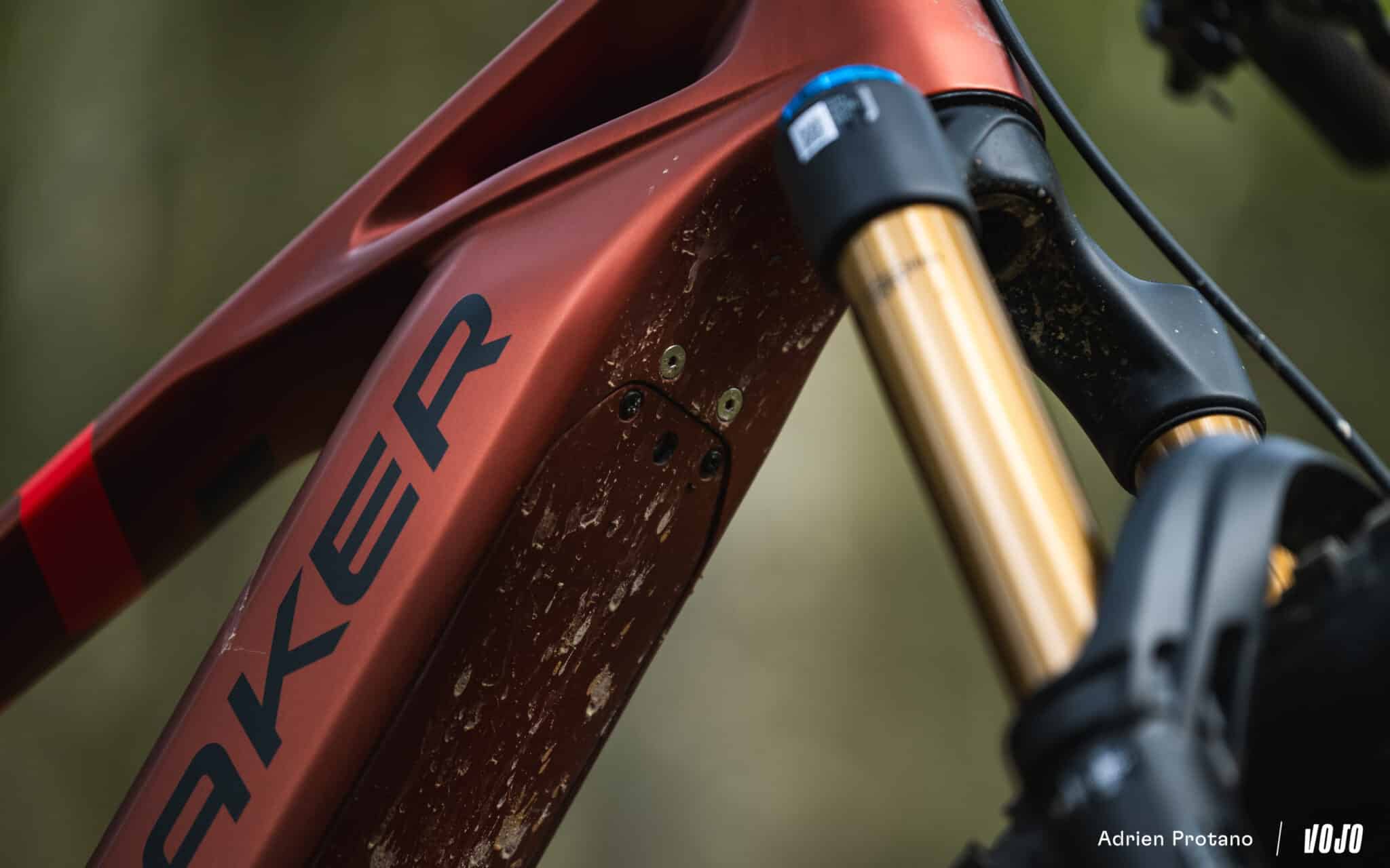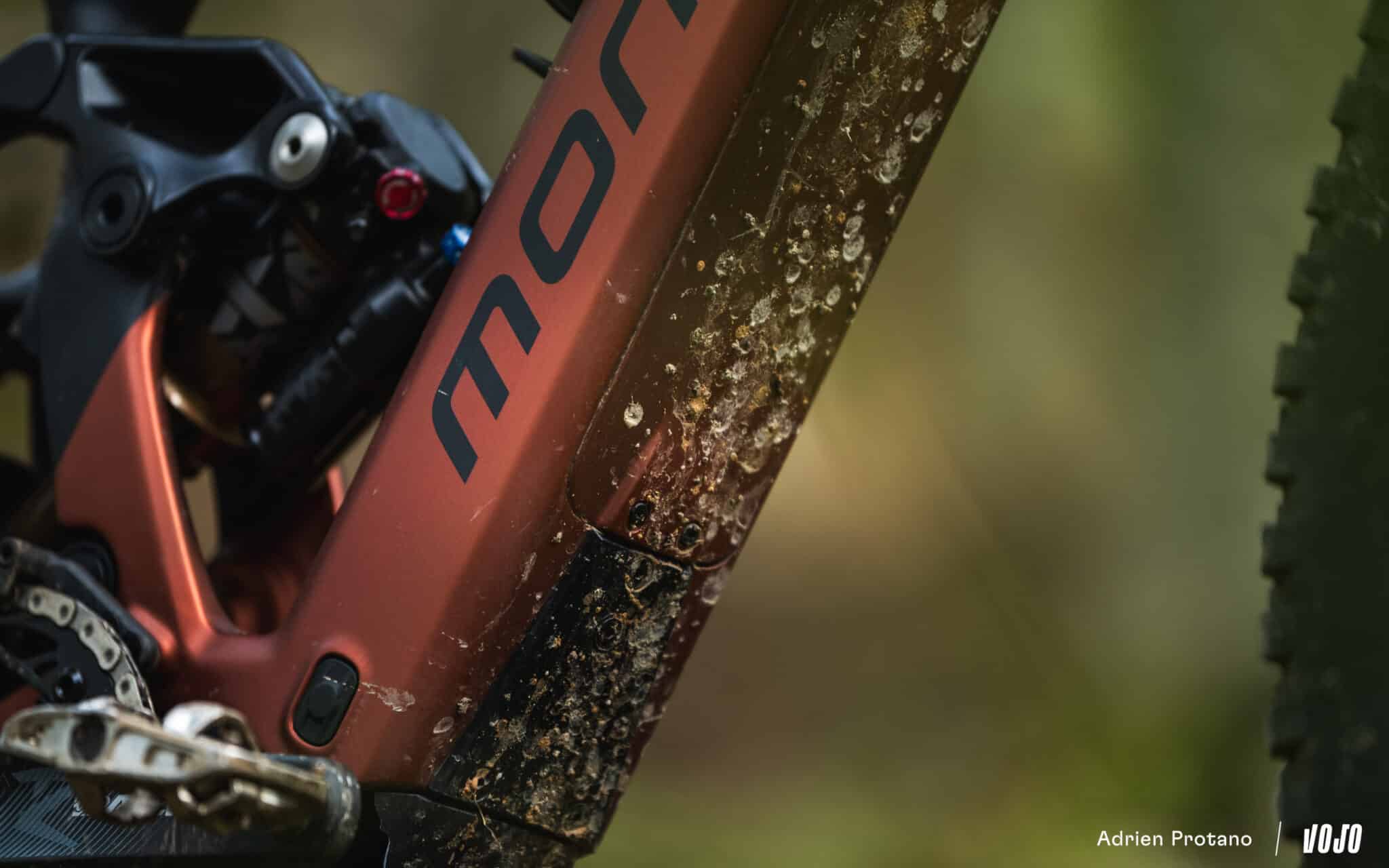 Mondraker explique également avoir porté une certaine attention à ce que son modèle soit le plus silencieux possible, et cela passe notamment par cette large protection de la base côté transmission. Le moteur/boîtier de pédalier/bas du tube diagonal est également doté d’une large protection en plastique dur. Remarque : les caches définitifs n’étant pas arrivés à temps pour la présentation, cette protection en plastique était en réalité imprimée en 3D sur nos modèles d’essai, et donc (très) fragile. Celui-ci a fini par casser lors d’une de nos sorties et vous pourrez peut-être l’apercevoir sur certaines photos. « Pas d’inquiétude, cette petite faiblesse sera corrigée par les caches en plastique définitifs », affirme la marque.