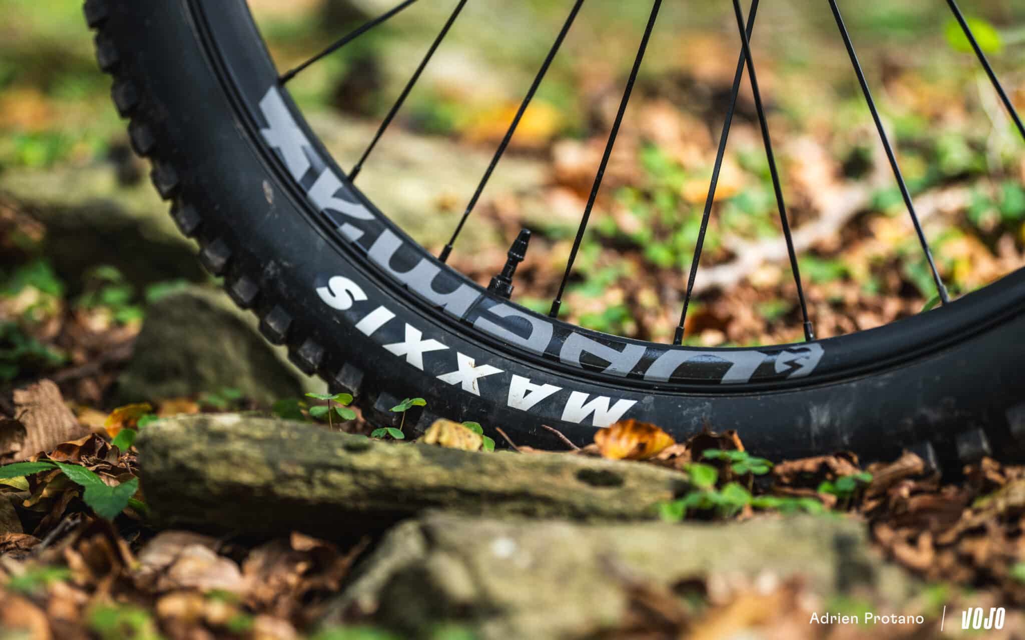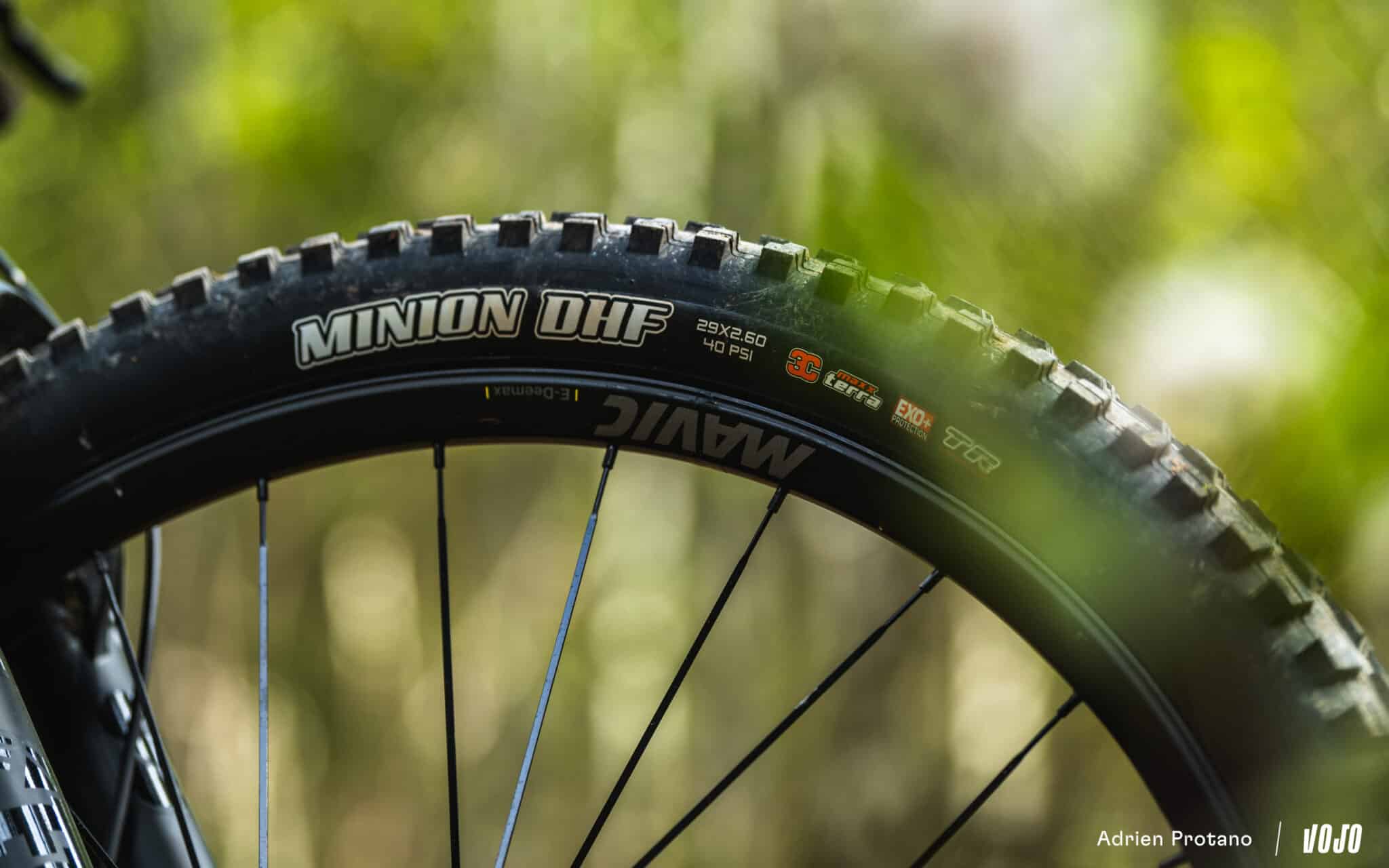 Le train roulant est bleu-blanc-rouge avec une paire de Mavic E-Deemax, chaussées d’un Maxxis Minion DHF (2.6, EXO+, Maxx Terra) à l’avant, et d’un Minion DHR II (2.6, EXO+, Maxx Terra). Crevons l’abcès dès le départ, nous n’avons pas compris le choix de la marque d’opter pour une section de pneu aussi importante… On vous explique en détail dans le test terrain.