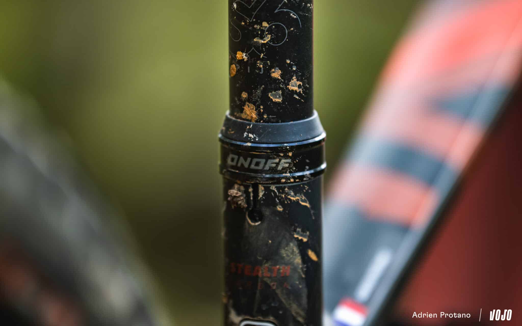 Le reste des périphériques est maison, avec un poste de pilotage OnOff en aluminium (potence de 30mm, cintre de 800 mm avec un rise de 25 mm). La tige de selle télescopique est une OnOff Pija avec un débattement ajustable entre 180 et 155 mm. Celle-ci est surmontée d’une très bonne selle Ergon SM10 qui nous a beaucoup plu ! Mention moins bien pour les grips par contre qui nous ont semblé manquer de confort (épaisseur trop fine ? Matériau trop dur ?) et qui se sont avérés glissants une fois mouillés.