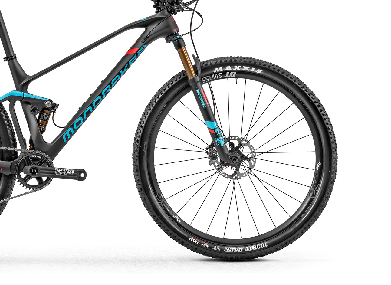 Les roues sont au format Boost, en 25 mm de largeur interne. Tous les modèles seront fournis avec des pneus Maxxis Rekon Race Exo Tubeless Ready en 2.25. S’ils sont vite limités sur terrain gras, on salue néanmoins l’effort de Mondraker qui a choisi des vrais pneus tubeless et renforcés, quitte à rajouter quelques grammes sur la balance.