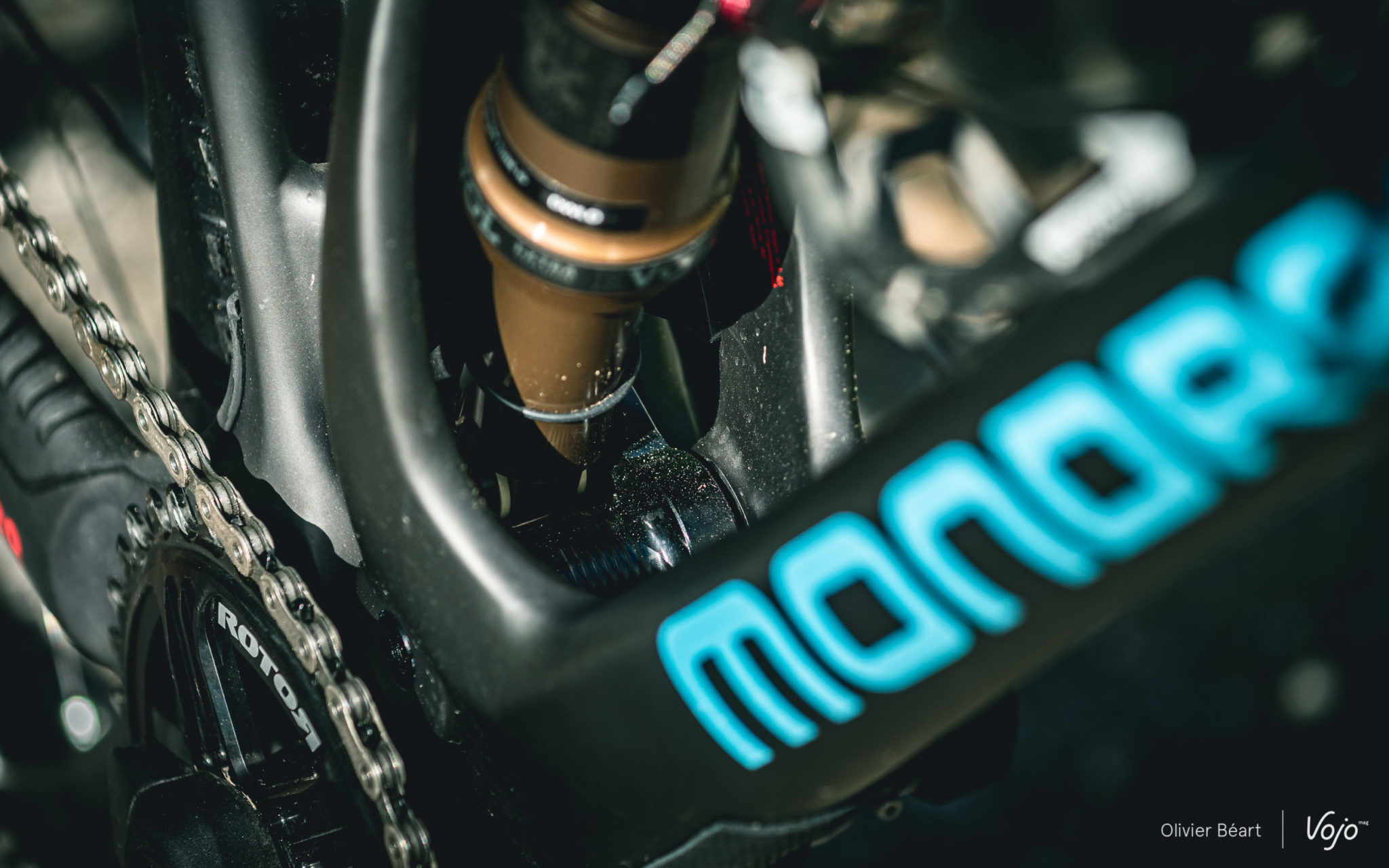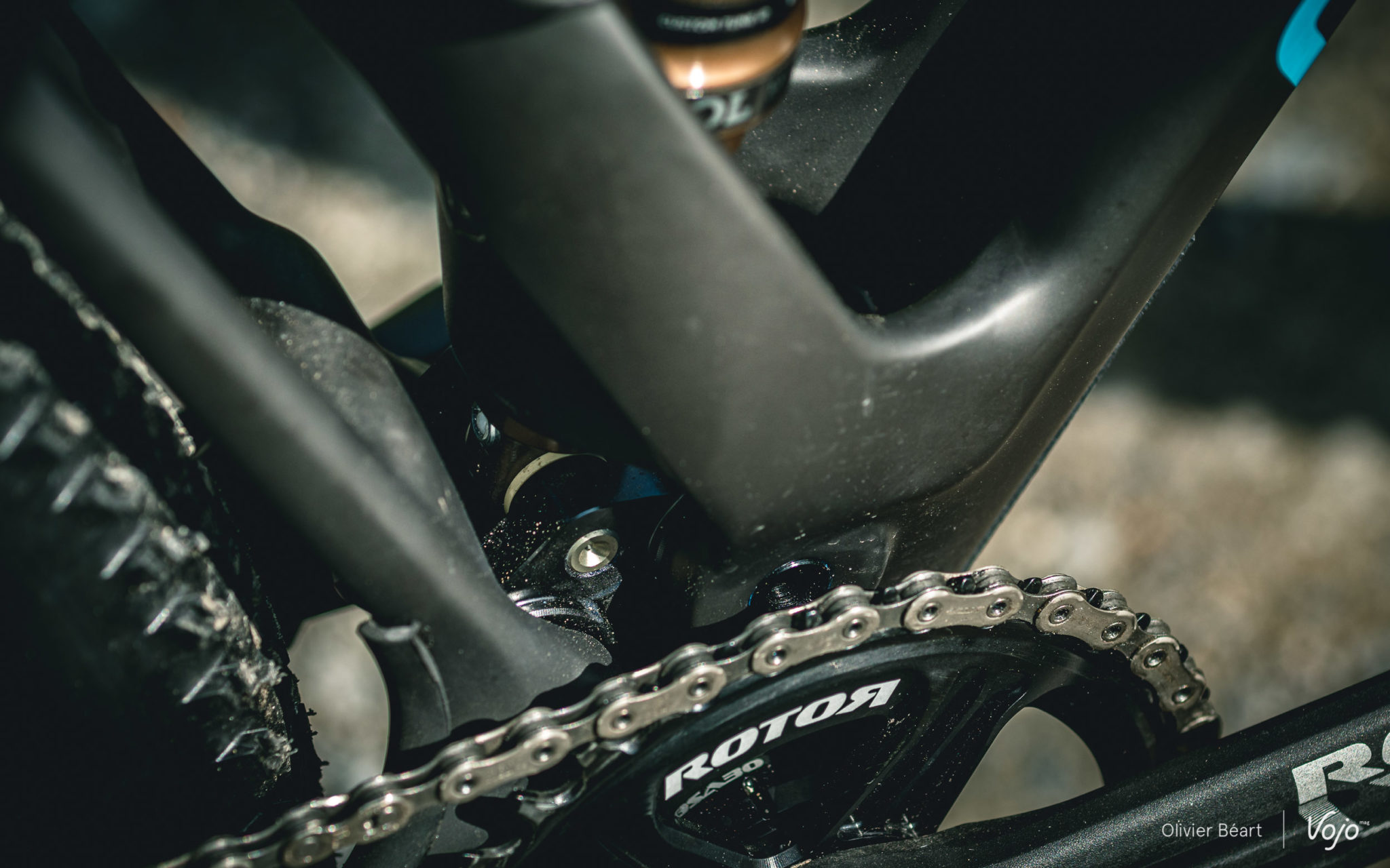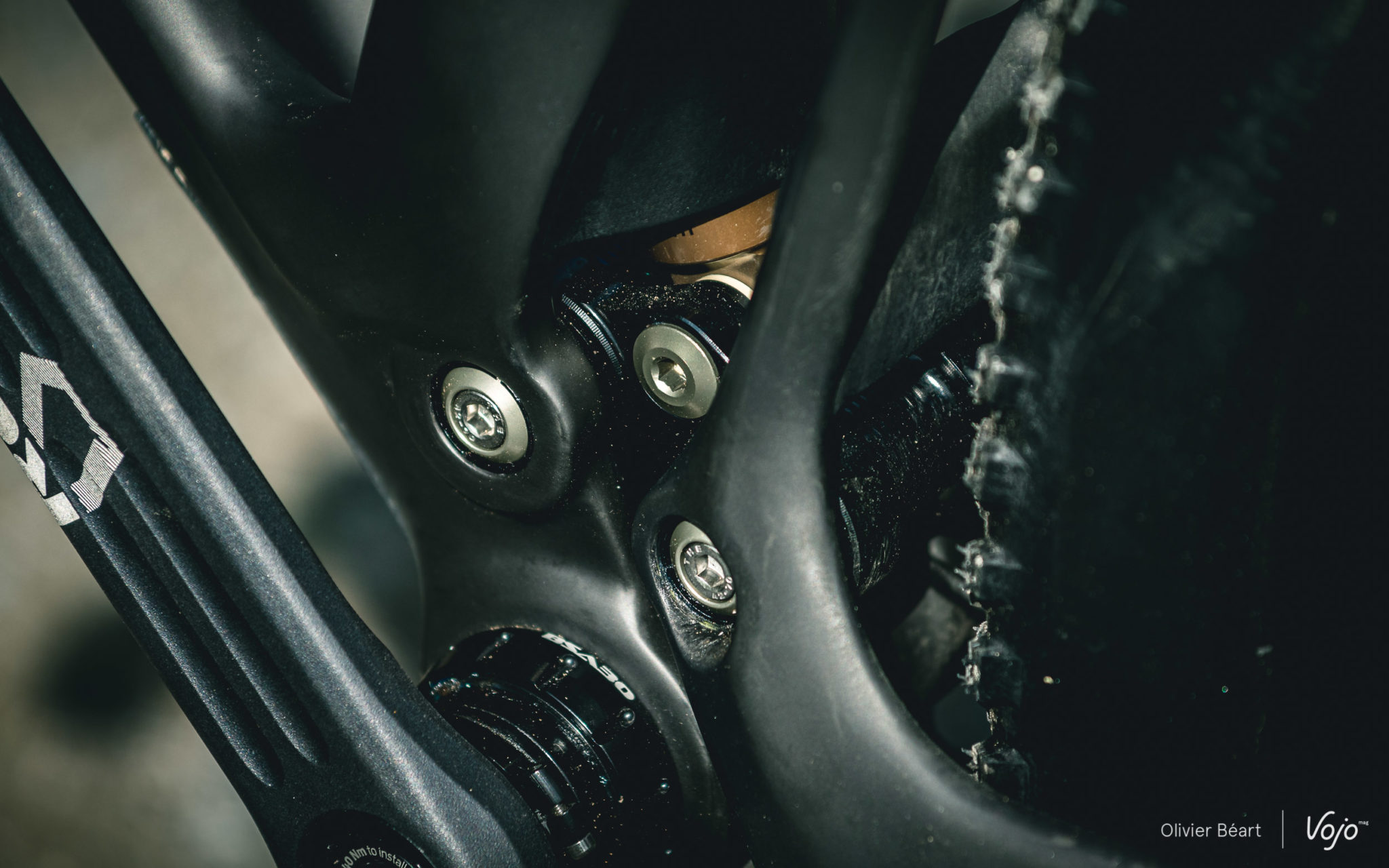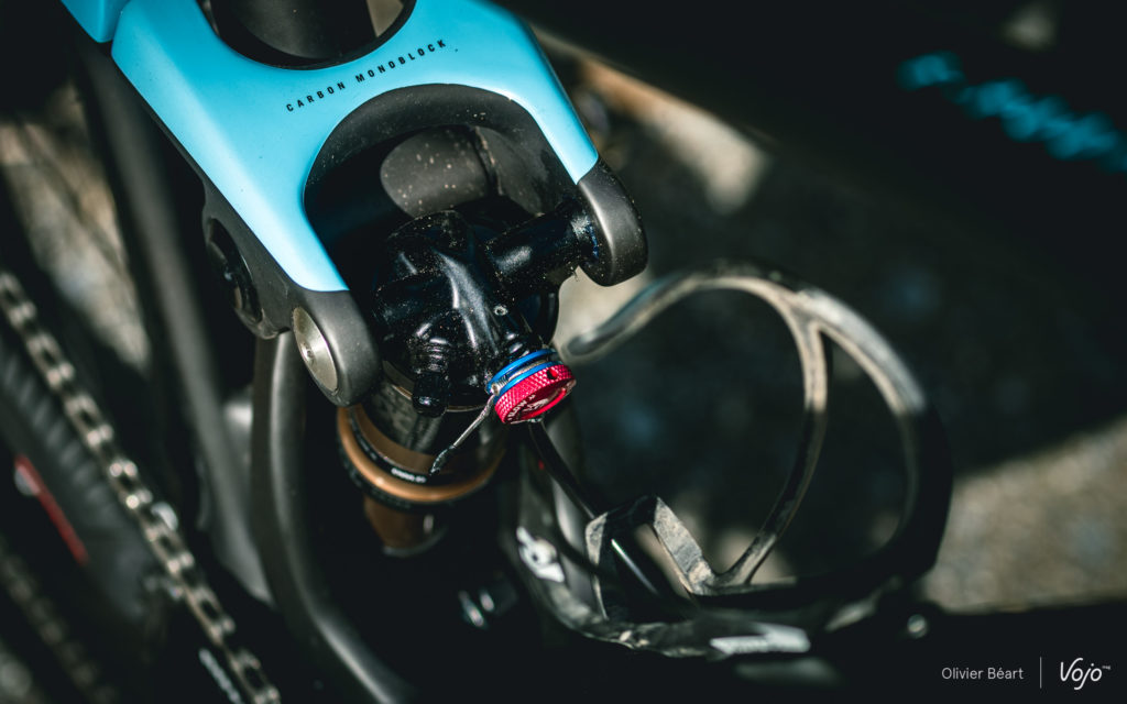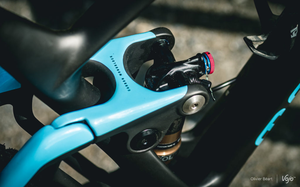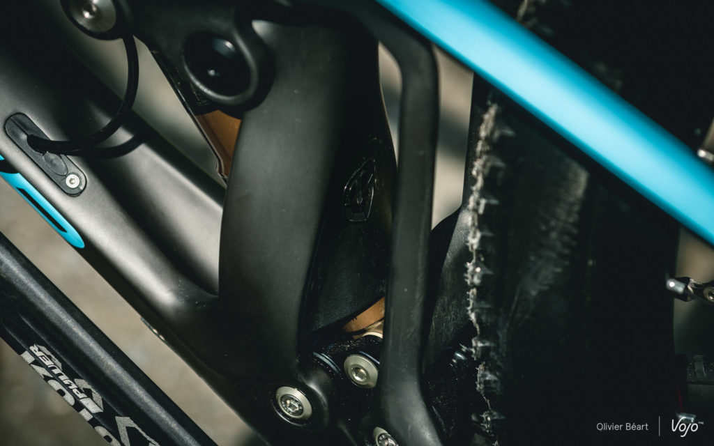 La cinématique développe 100 mm de débattement et utilise une biellette supérieure monobloc en carbone pour garantir la rigidité de l’ensemble, souvent un point faible sur les systèmes à point de pivot virtuel. Dans le même esprit, les axes sont surdimensionnés (15 mm contre 12 mm sur les autres modèles de la marque). La biellette inférieure est en aluminium.
