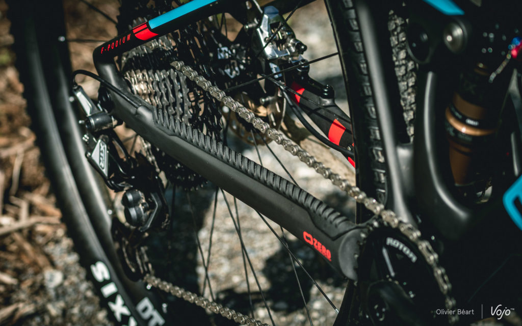 La base est protégée des mouvements de la chaîne par une feuille de caoutchouc particulièrement travaillée. Cette forme, qu’on retrouve de plus en plus souvent sur les vélos de DH, est censée être plus efficace et surtout plus silencieuse.