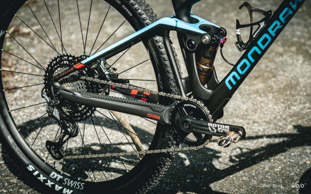 Au pédalage au train, le vélo répond bien mais sans plus. On n’a pas la même impression de rendement qu’avec un Specialized Epic par exemple. En revanche, avec 25 % de SAG (valeur recommandée par Mondraker), la suspension Zero ne pompe absolument pas et filtre bien les irrégularités du terrain, les racines… On ne bute pas sur les obstacles.
