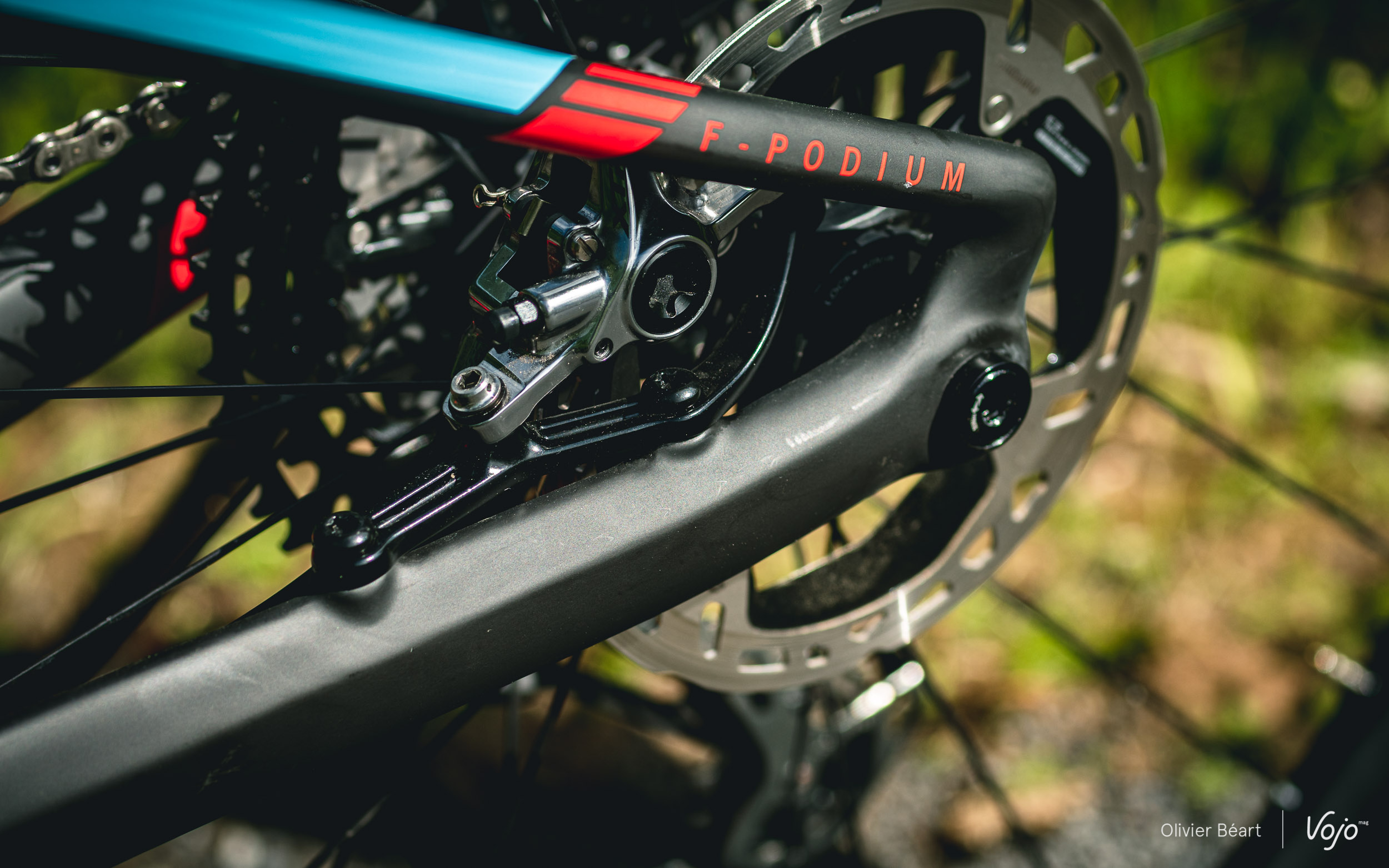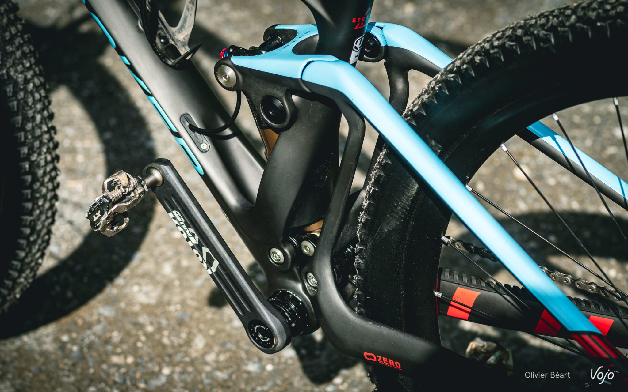 A l’arrière, le F-Podium reprend la Zero Suspension qu’on retrouve sur tous les vélos de la marque. Sur ce système à point de pivot virtuel, l’amortisseur est monté flottant entre les deux biellettes. L’objectif de cette architecture est de réduire le pompage. Zero signifie d’ailleurs zéro pompage, zéro kick back et zéro verrouillage au freinage. De belles promesses à vérifier sur le terrain.