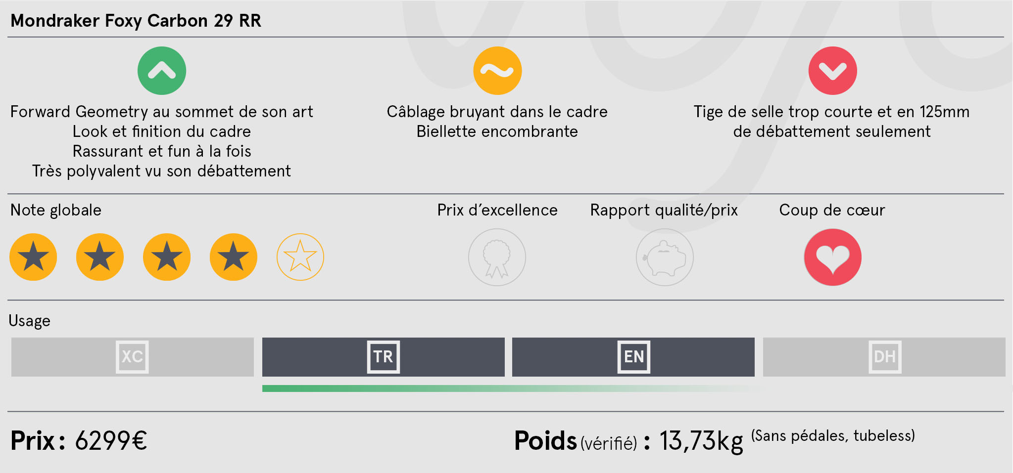 Le Mondraker Foxy Carbon 29 est proposé en trois montages, tous basés sur le même cadre : Foxy Carbon R29 comme première version en GX Eagle et suspensions Fox Performance, RR29 comme testé ici et XR29 en guise de tout haut de gamme avec des roues DT 1501, fourche Fox F36 Grip2 et amortisseur DHX2. Les poids annoncés vont de 13,94kg à 13,42kg et les tarifs de 4999 à 8499€. Le Mondraker Foxy Carbon 29 est aussi disponible en cadre seul à 3499€ en DPX2 et 3699€ en DHX2.
