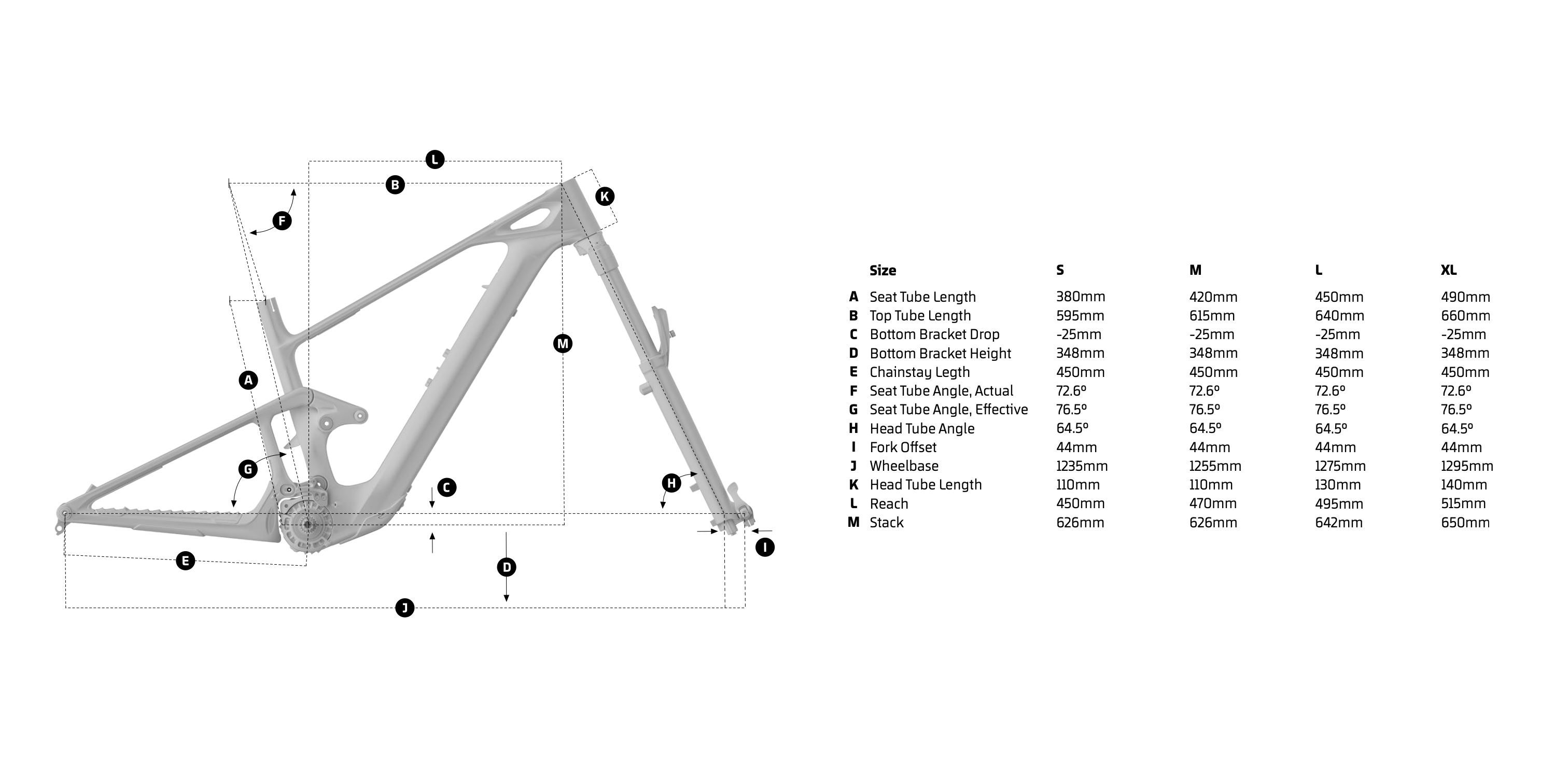 Le Mondraker Neat se dote d’une géométrie certes inspirée des Foxy et Crafty Carbon, mais spécifique à cette nouvelle plateforme et à la pratique de l’e-bike léger. Elle se caractérise par un angle de direction de 64,5°, un angle de tube de selle de 76,5°, des bases de 450 mm (soit 5 mm de plus que le Foxy, et 5 mm de moins que le Crafty) ainsi que d’un reach de 470 mm en taille M.