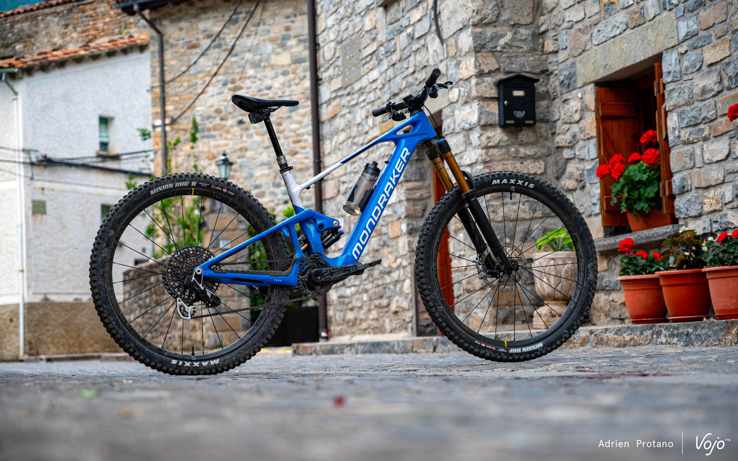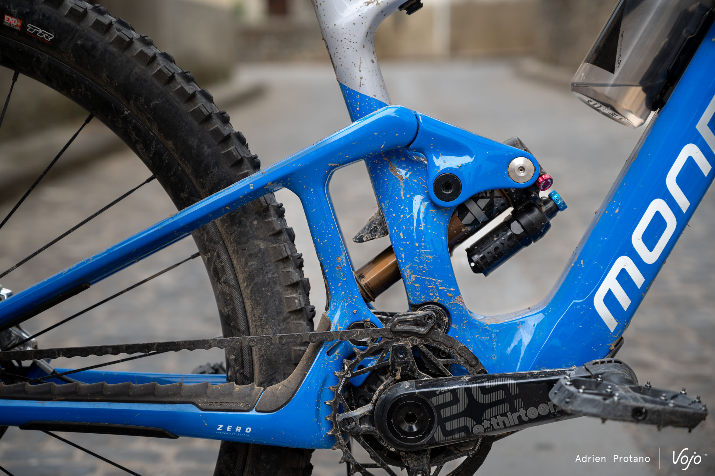 Un important travail de prototypage et d’essai a été réalisé par les équipes de la marque, pour s’approcher au maximum des sensations que Mondraker désirait que sa nouvelle plateforme procure au pilote. La marque d’Alicante a mis au point un vélo mule destiné à développer la cinématique et pouvoir tester différentes cotes de géométrie. Celui-ci est réalisé à base d’un cadre usiné CNC sur lequel la marque a monté un système de télémétrie en collaboration avec une équipe directement venue des QG de chez Fox.