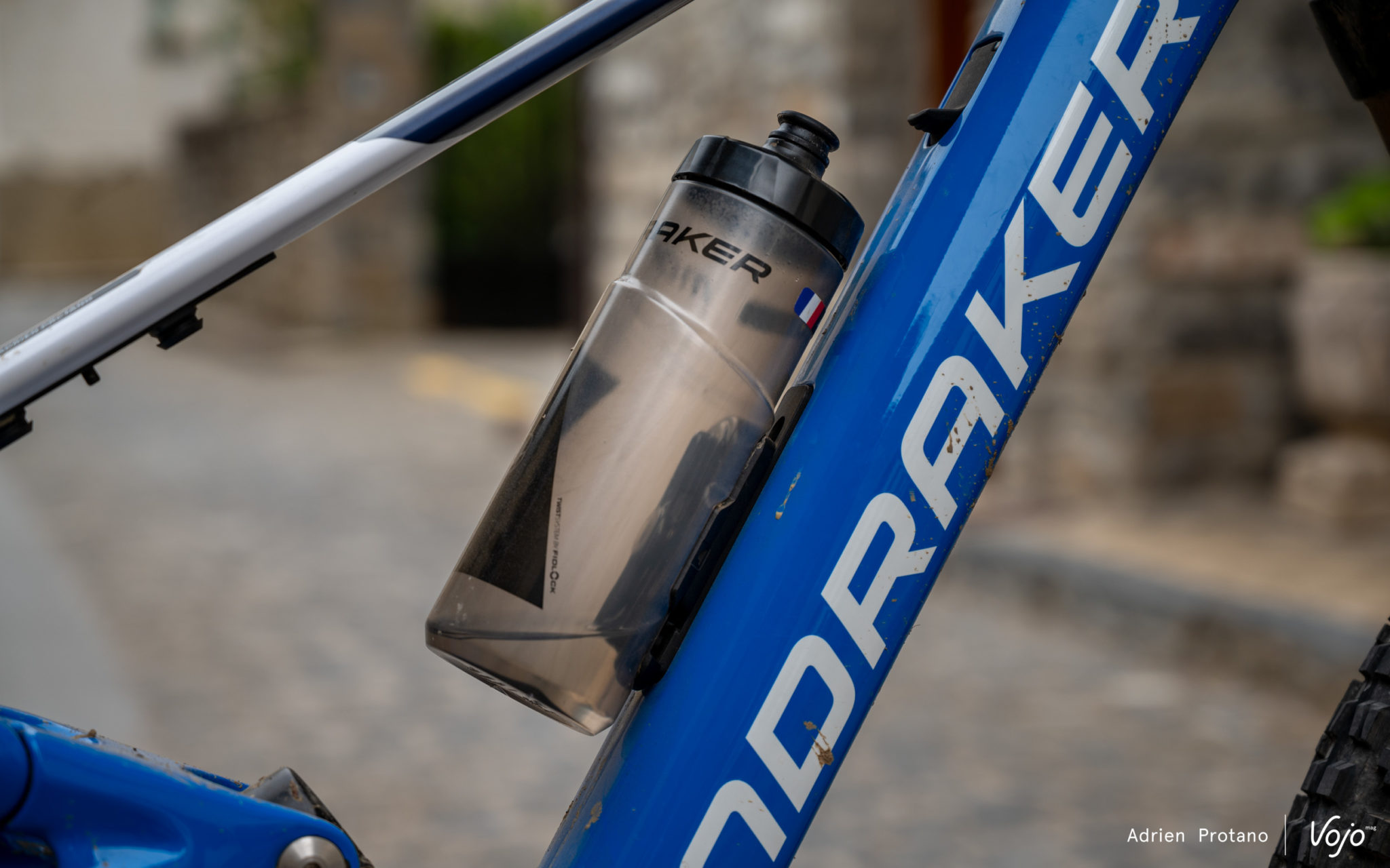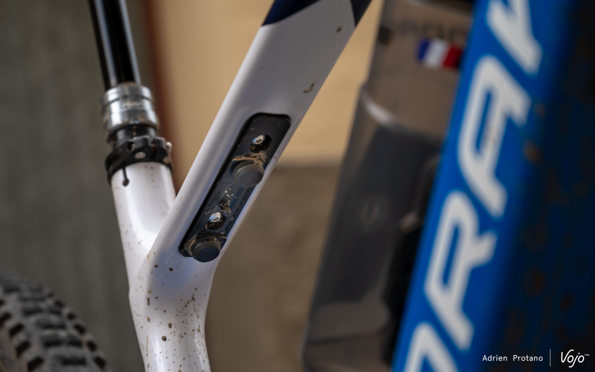 Deux portes-bidons Fidlock sont prévus au sein du triangle avant de ce Mondraker Neat. Celui placé sur le tube diagonal est également prévu pour accueillir le Range extender, dont on vous parle plus bas, puisque le port de branchement se situe juste au-dessus.