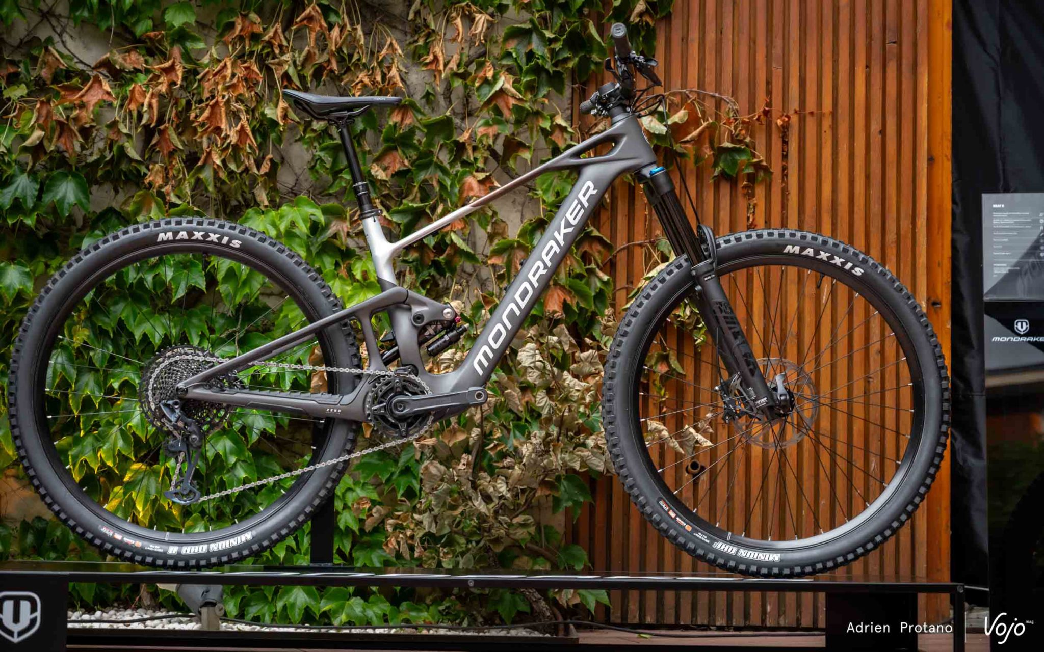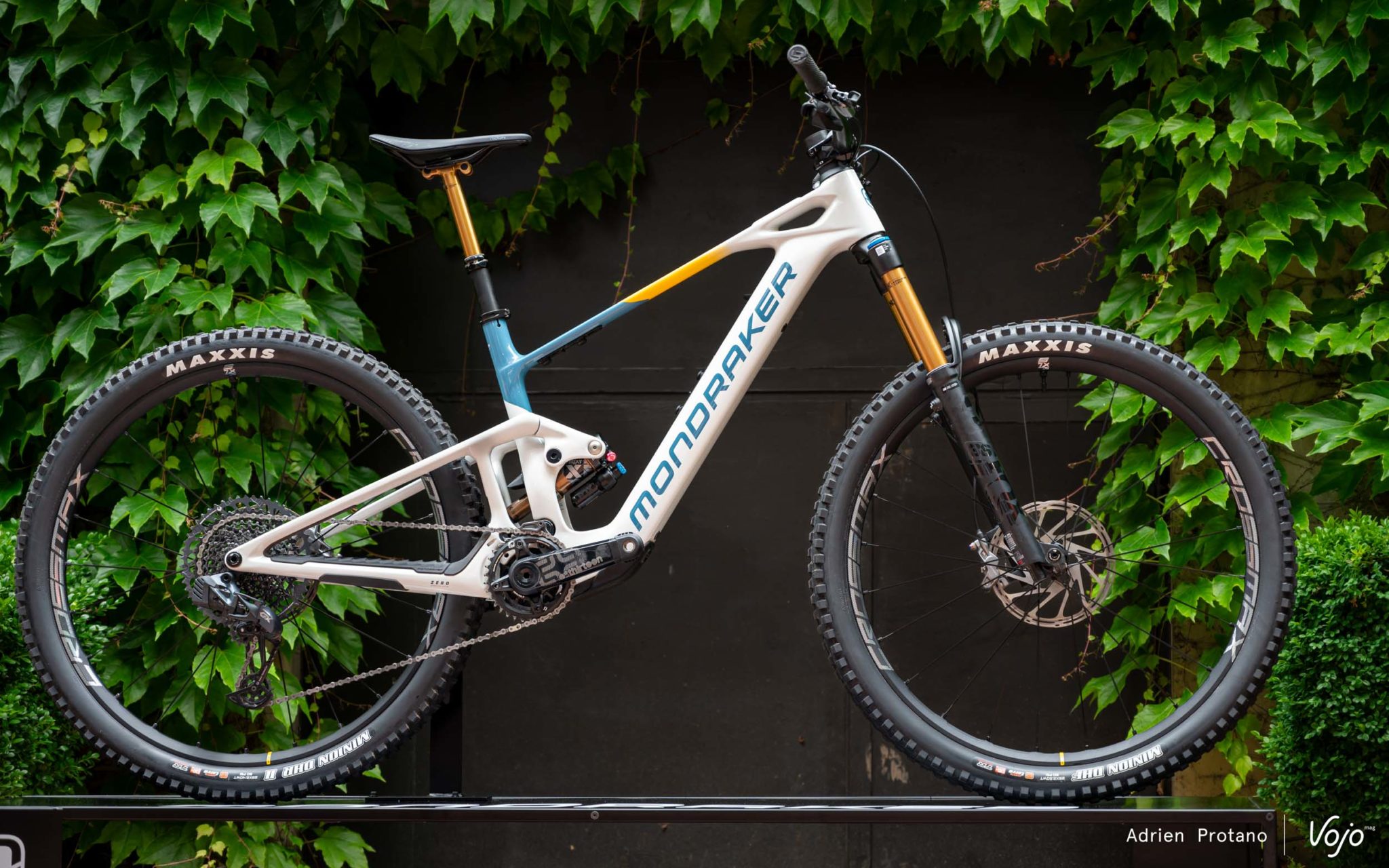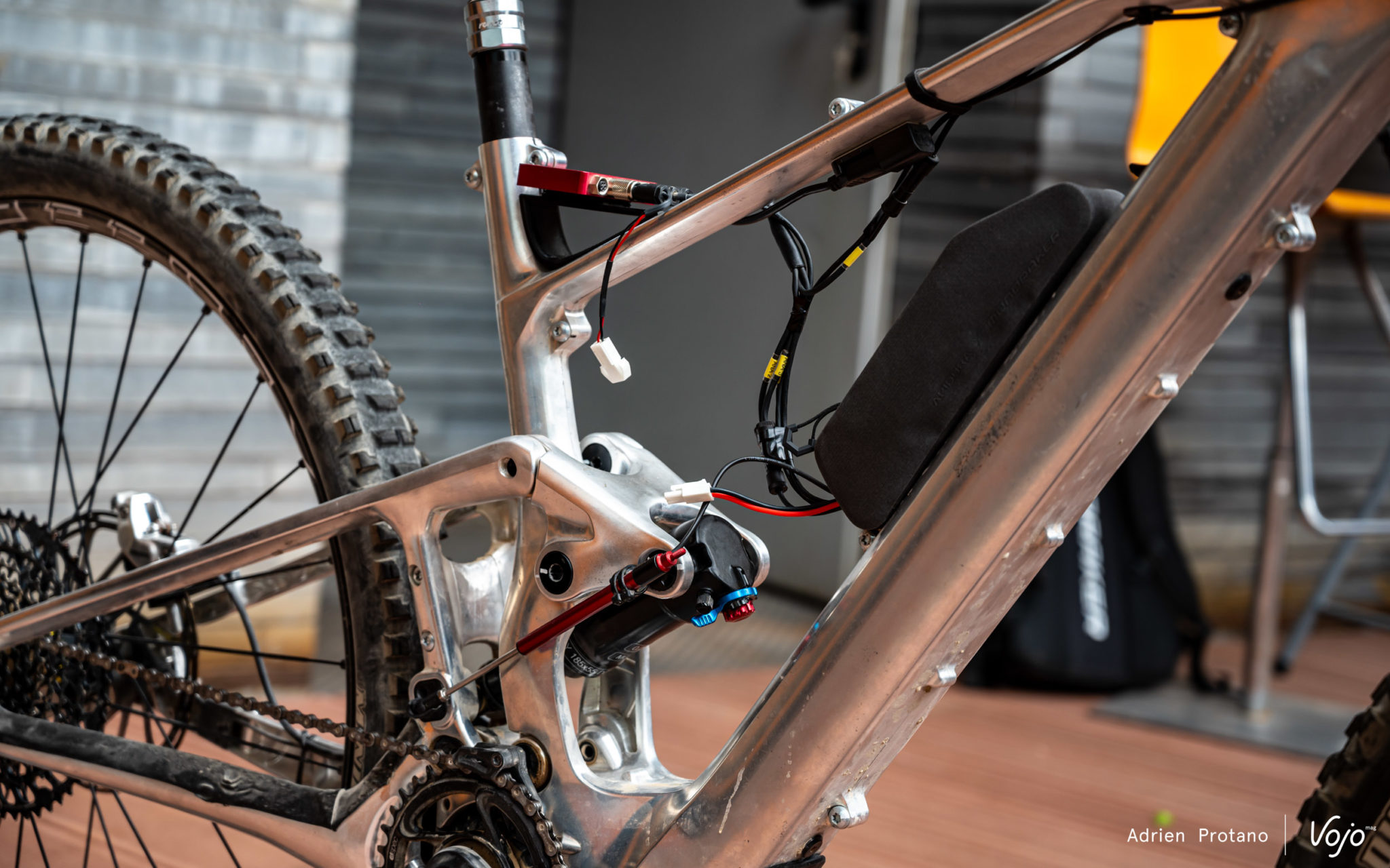Un important travail de prototypage et d’essai a été réalisé par les équipes de la marque, pour s’approcher au maximum des sensations que Mondraker désirait que sa nouvelle plateforme procure au pilote. La marque d’Alicante a mis au point un vélo mule destiné à développer la cinématique et pouvoir tester différentes cotes de géométrie. Celui-ci est réalisé à base d’un cadre usiné CNC sur lequel la marque a monté un système de télémétrie en collaboration avec une équipe directement venue des QG de chez Fox.
