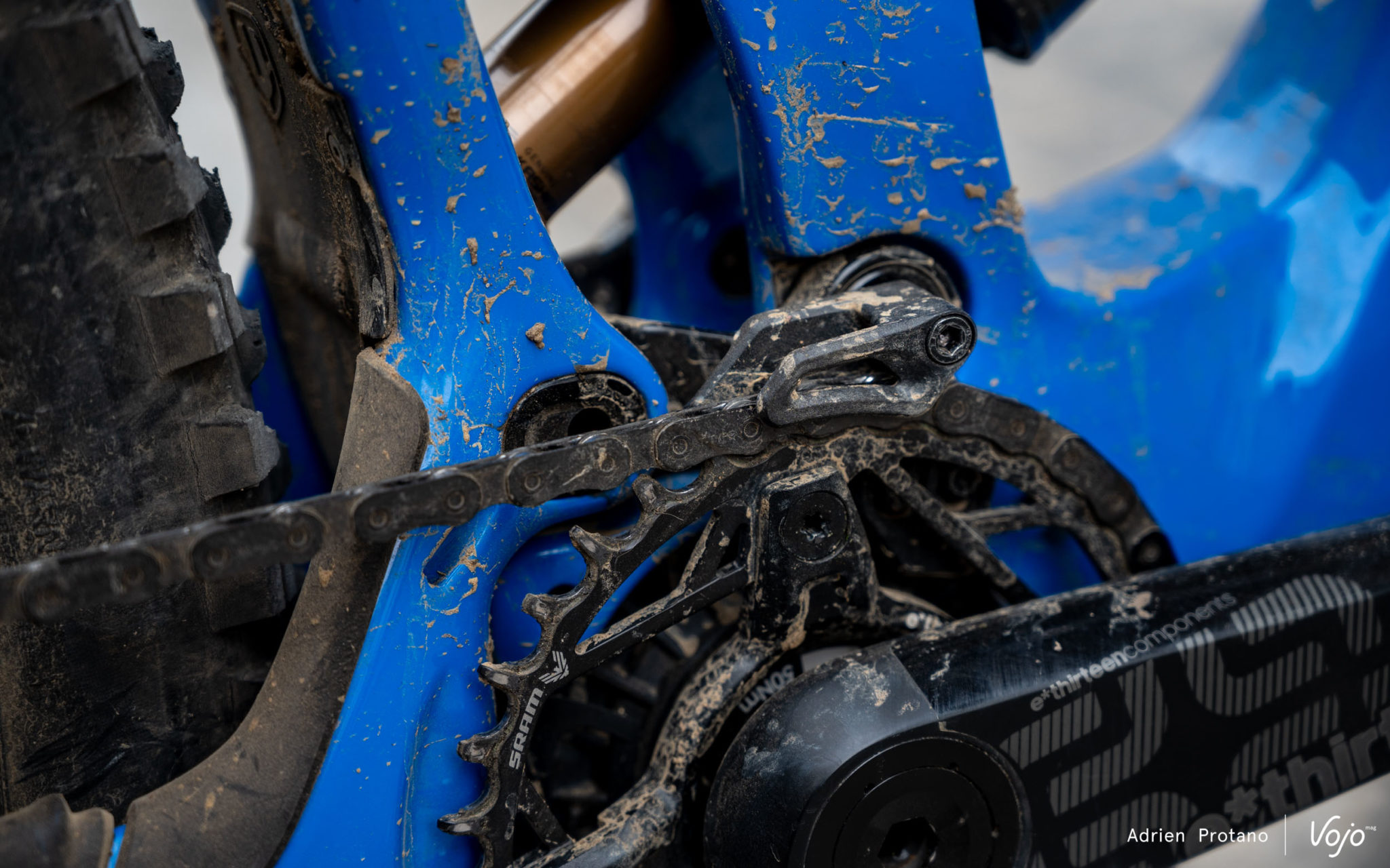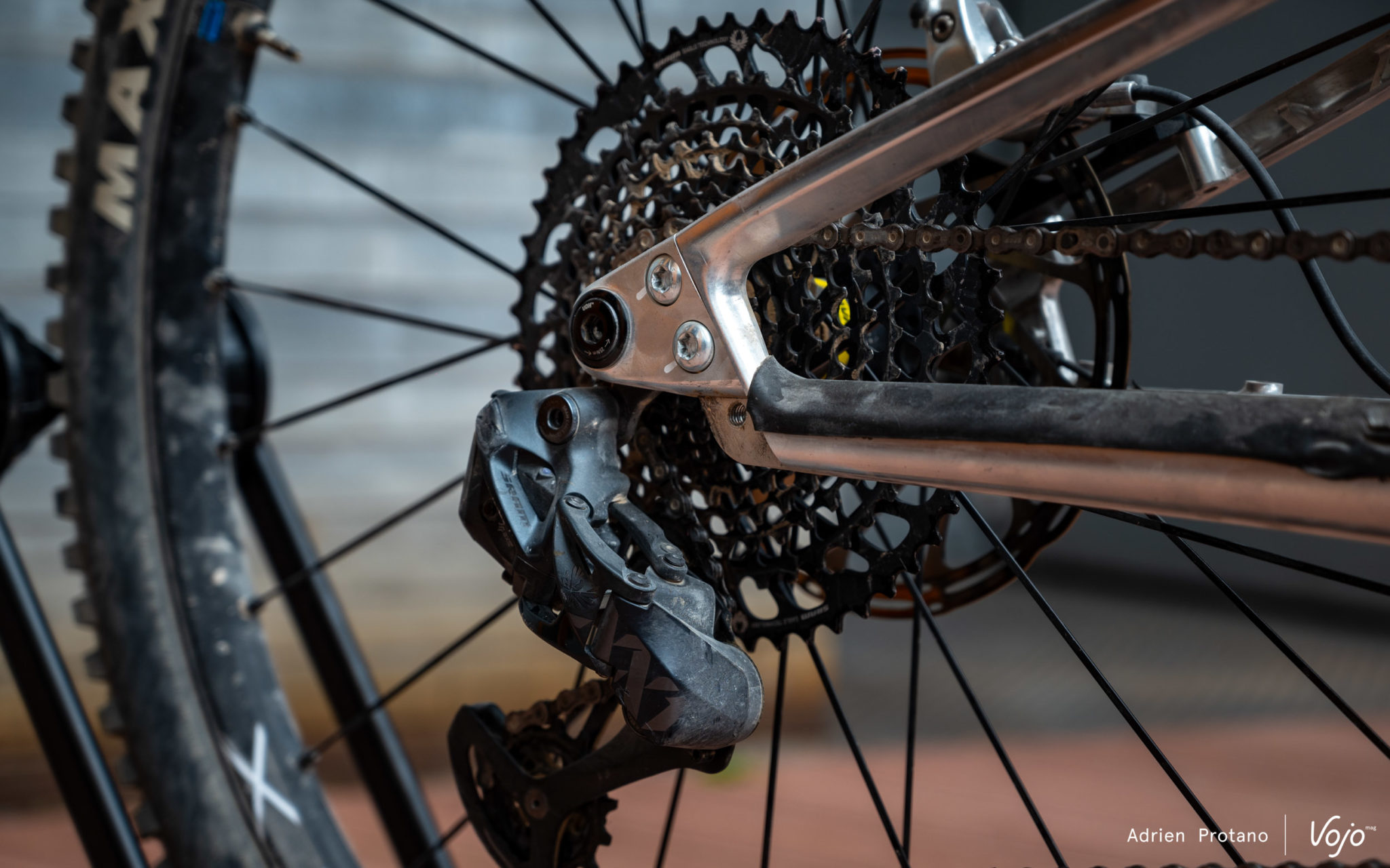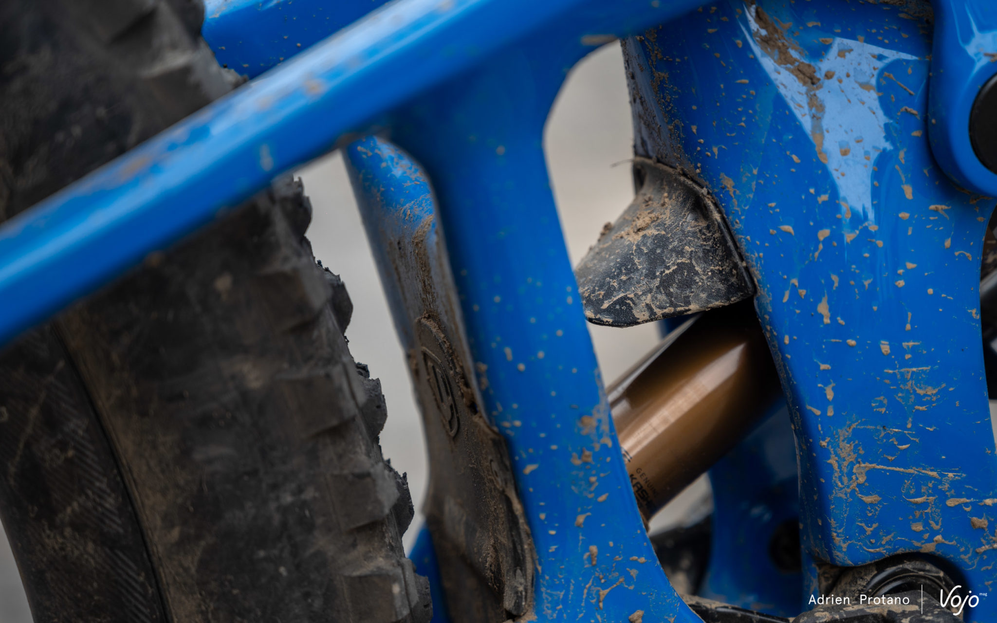 Ou encore au petit garde-boue situé juste au-dessus de l’amortisseur ainsi que du minimaliste système anti-déraillement monté de série.