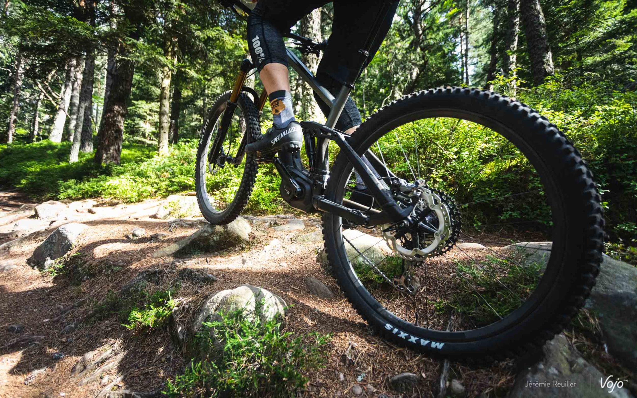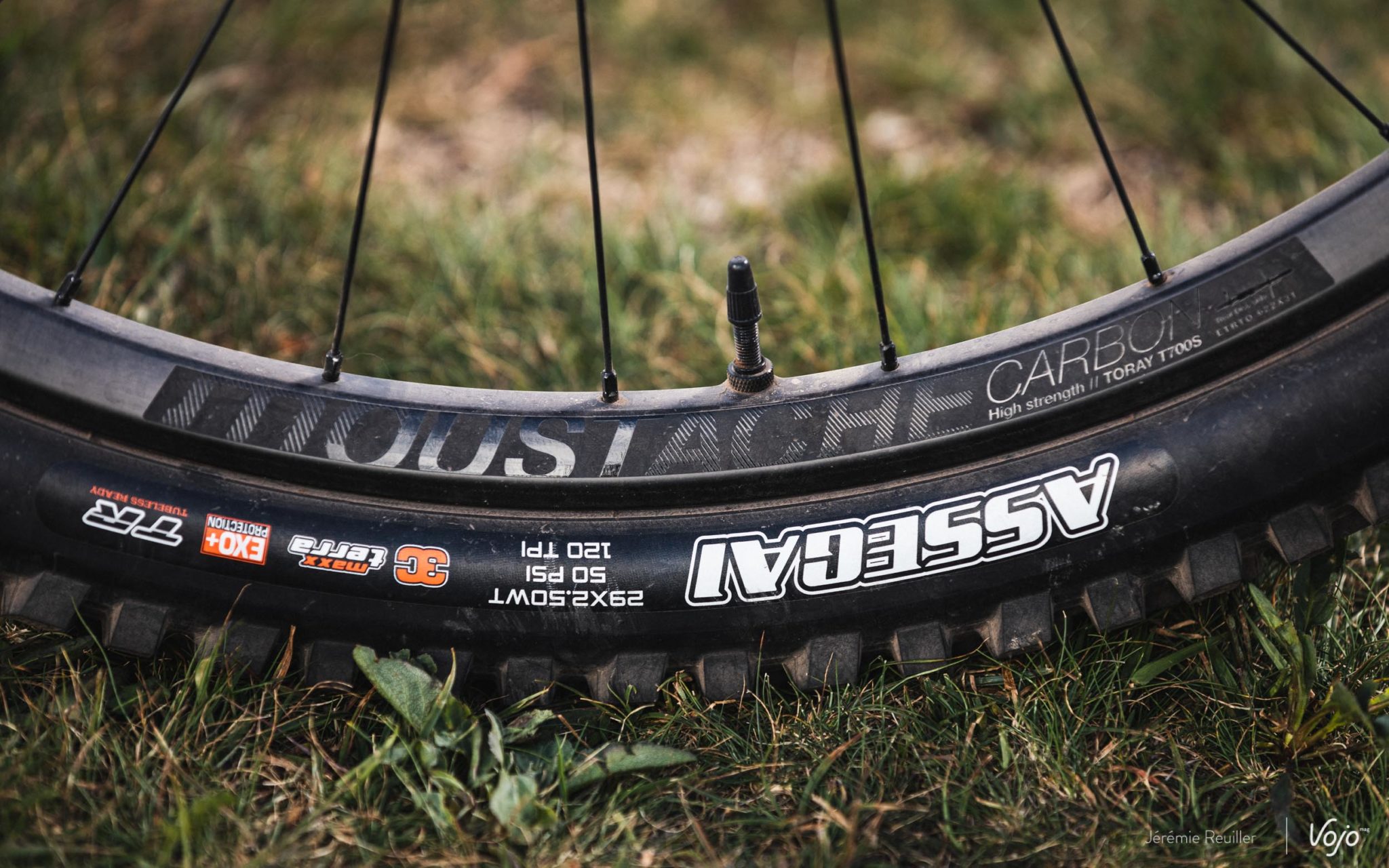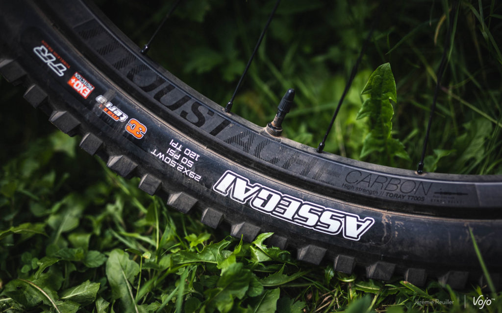 Ce passage au 29″ se fait avec des jantes maison, en 31mm de large. En alu sur le reste de la gamme, elles passent au carbone sur la version haut de gamme testée ici. Quant aux pneus, il s’agit des excellents, très accrocheurs et très polyvalents Maxxis Assegai en 2.5″ de section, carcasse Wide Trail Exo+ renforcée. Cette carcasse, plus solide que la « simple Exo » n’est montée que sur le Trail 10… et cela nous semble indispensable sur un e-bike. Clairement, c’est un petit upgrade qu’on aimerait voir en série sur le toute la gamme Trail, alors qu’il est actuellement réservé au Trail 10 et aux Game, les « gros » vélos de la famille.