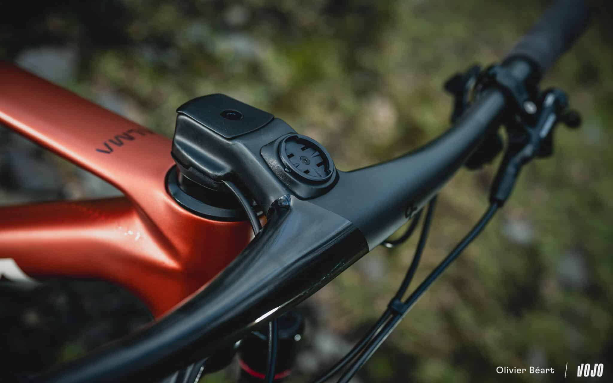 Au niveau du poste de pilotage, on trouve le nouveau combo carbone cintre-potence OC annoncé à 265 g en 760 mm de largeur et potence de 75 mm de long pour -17° d’angle. Très élégant, il intègre le passage des câbles par le jeu de direction et un support GPS de type Garmin. Il sera présent sur les trois montages les plus haut de gamme.
