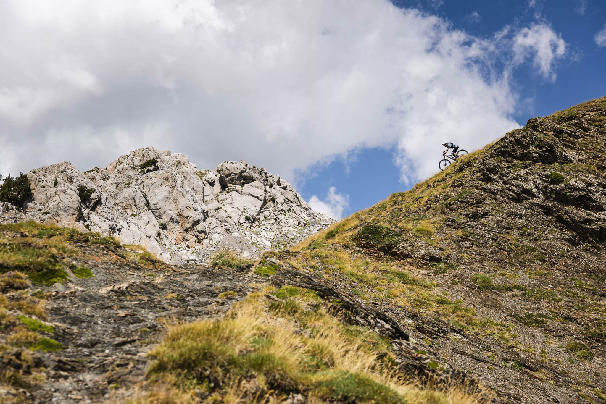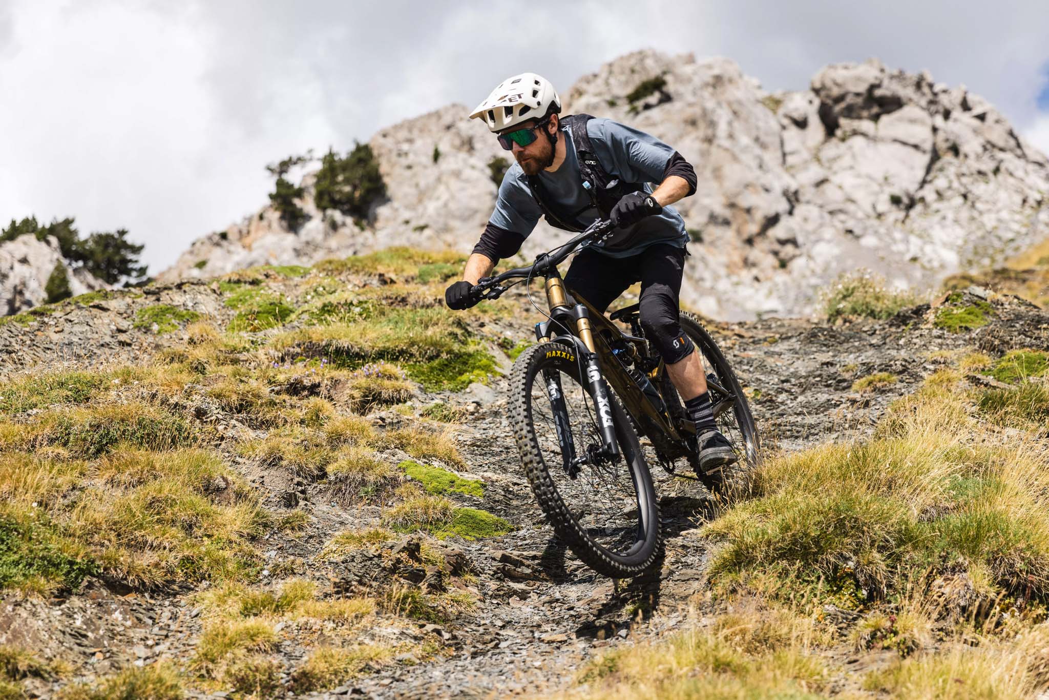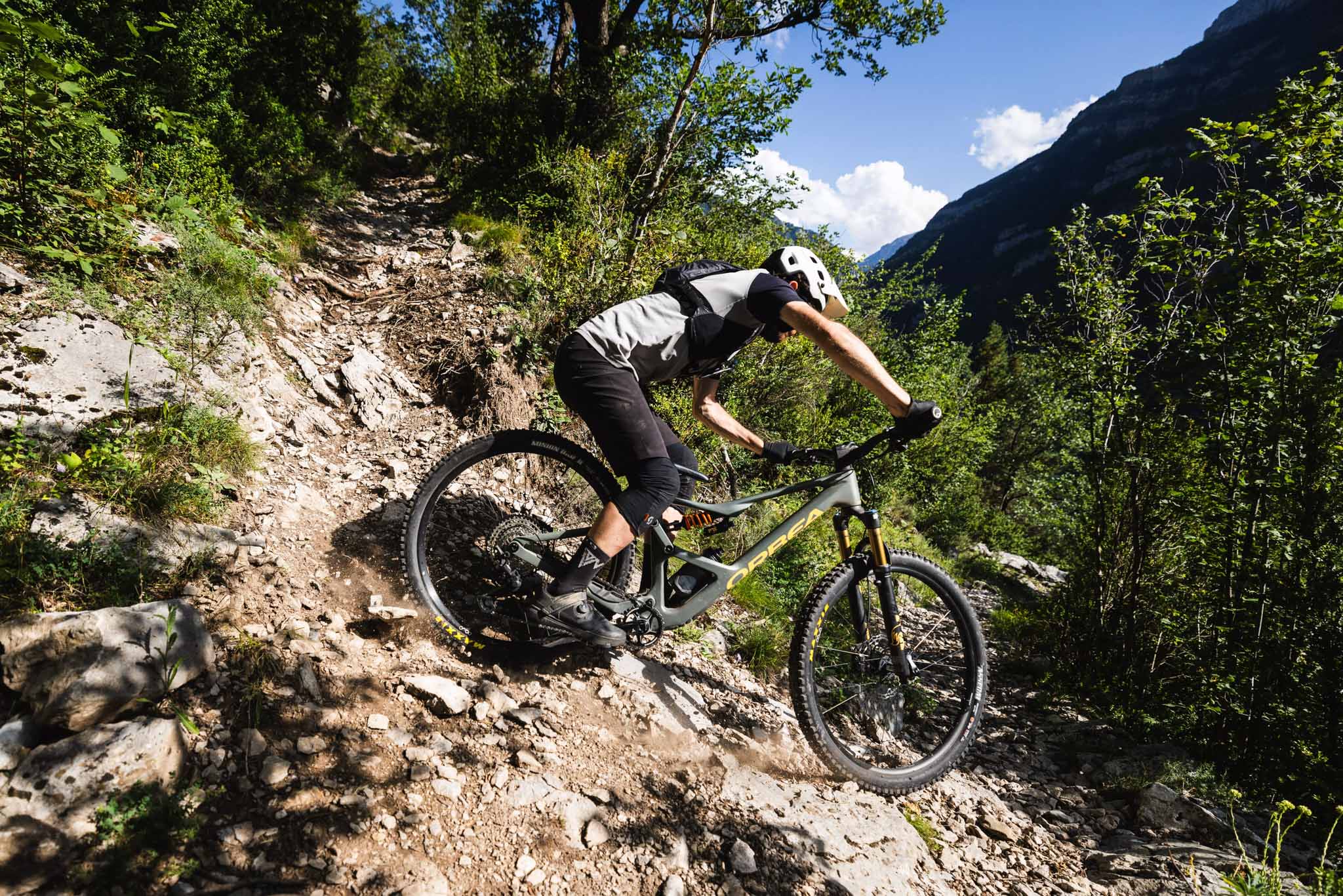 Côté suspension, la première descente depuis la crête du Pico Comodoto (2354 m) est compliquée. Avec le Float X et son réglage d’origine, le vélo n’a pas beaucoup de grip et l’arrière ne se pose pas comme je l’aimerais sur ces exigeants sentiers d’altitude. Rien de surprenant ceci dit : la cinématique est déjà très tournée vers le pédalage (on rappelle que l’anti-squat ne descend jamais sous les 100 %) et le surcroît de dynamisme apporté par le ressort air est de trop, j’ai l’impression d’avoir une suspension bien trop « XC » pour ce terrain de jeu. Dans le même temps, je talonne à plusieurs reprises sur la fin de descente, beaucoup plus joueuse et en forme de pumptrack géante.