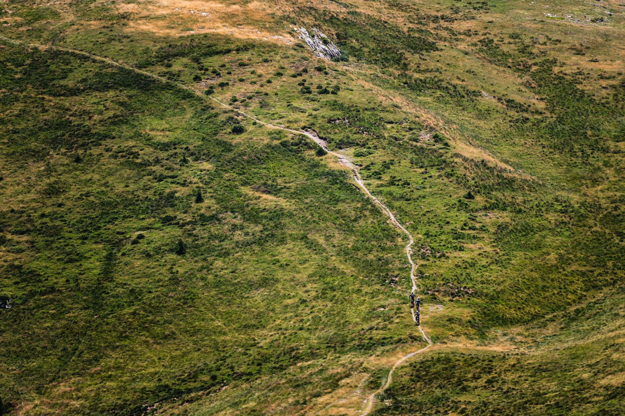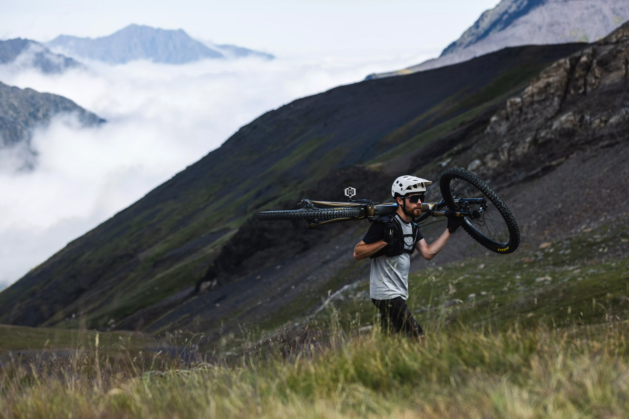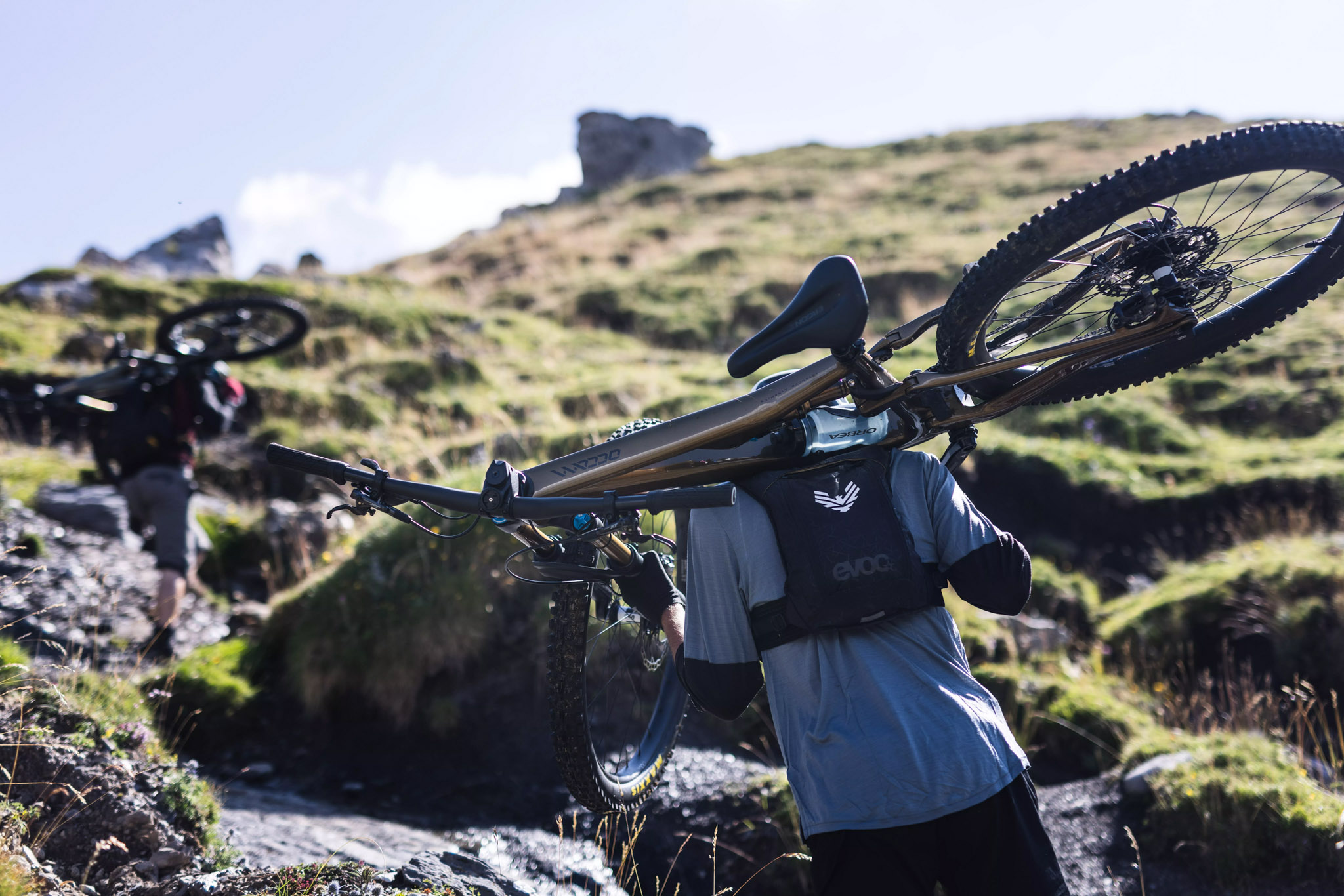 Avant de descendre toutefois, il faut monter ! Cela peut sembler futile mais, comme on a grimpé longtemps, on a remarqué que le gros tube diagonal se pose bien sur le dos et il n’y a pas besoin de tenir fort le cintre ou la manivelle pour empêcher le vélo de glisser. Et vu les portages que nous réservait l’itinéraire concocté par Basque MTB et Orbea, c’est une bonne chose !