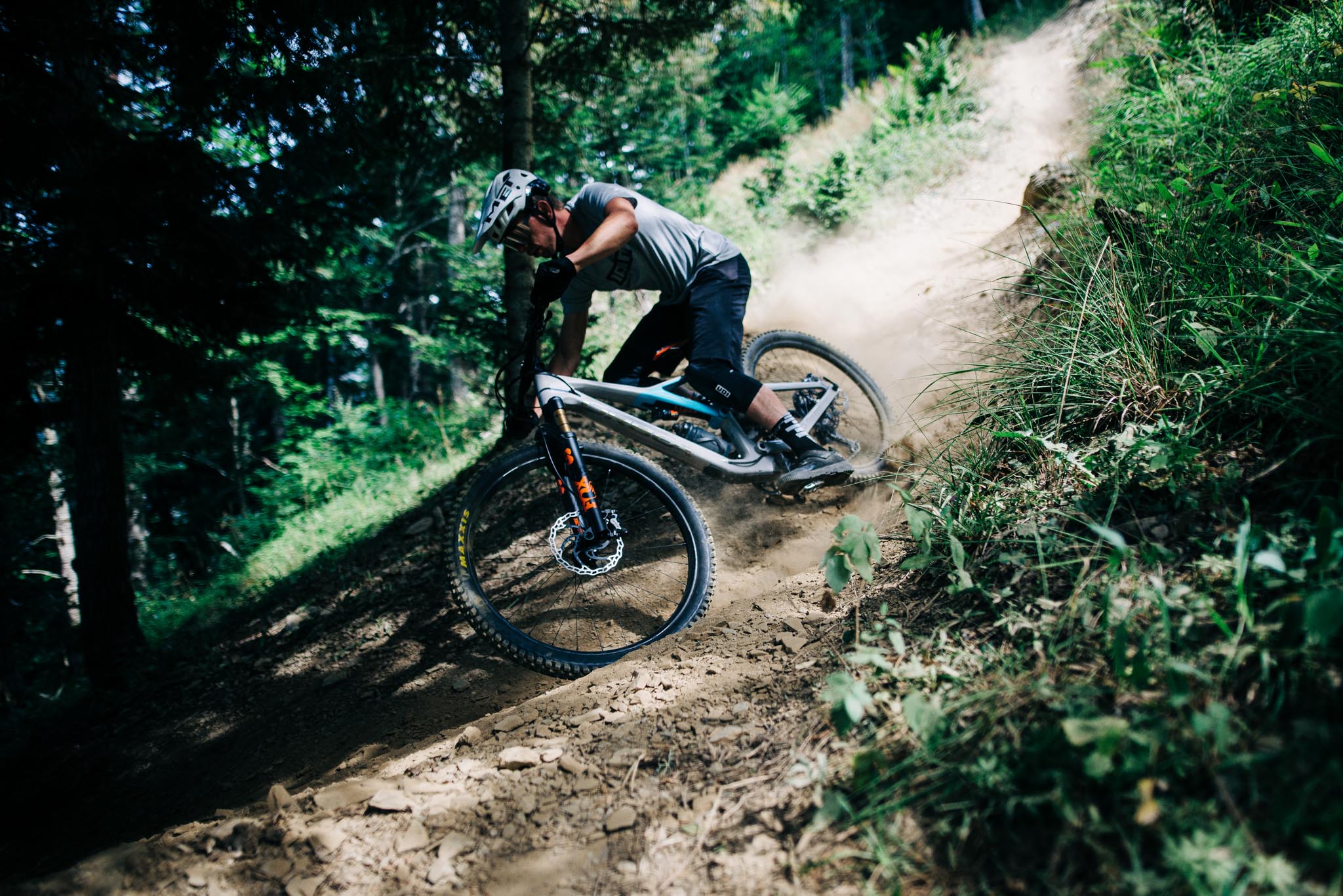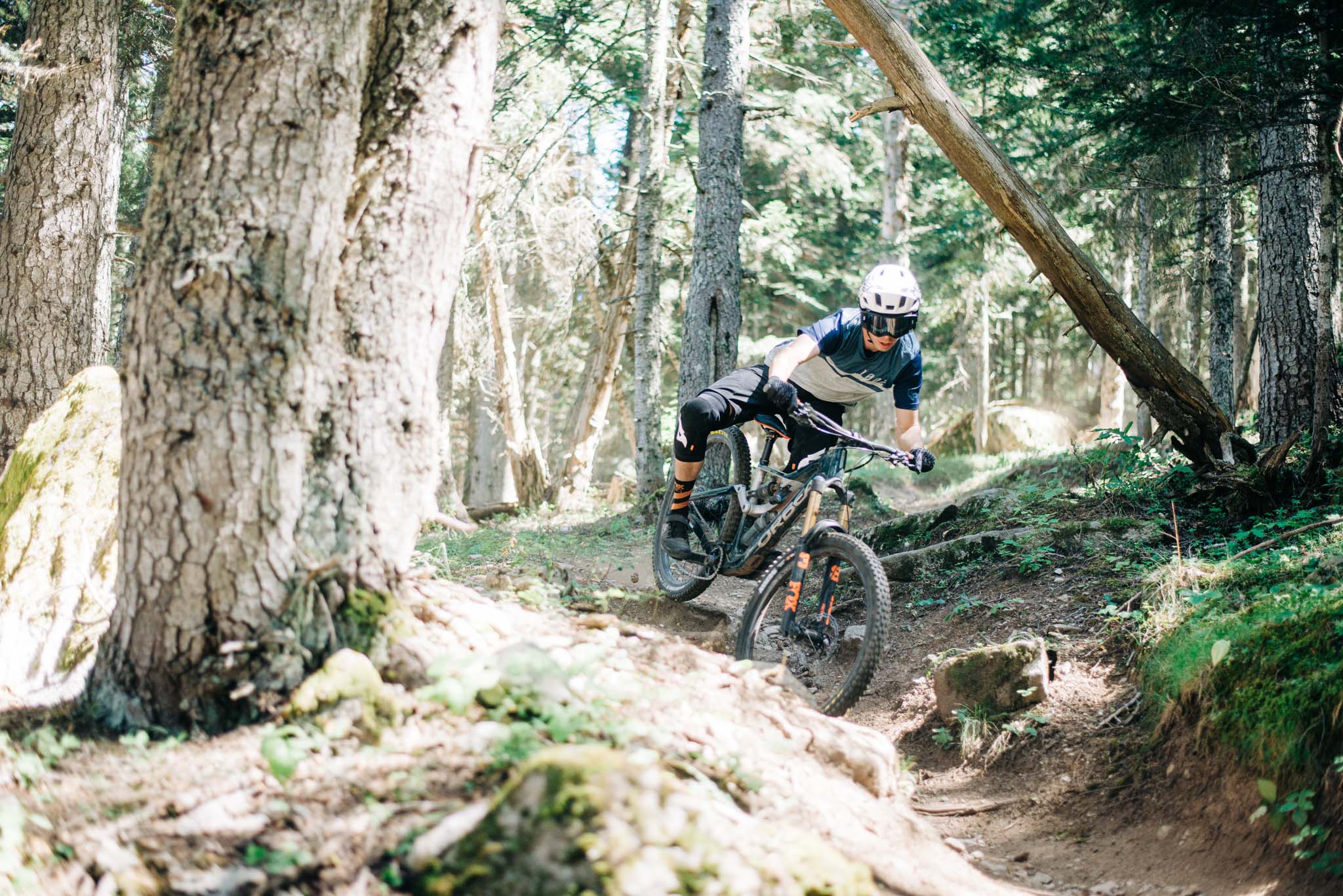 On passe ensuite au mullet sur un train de roues en aluminium. C’est ce dernier changement qui vient dans un premier temps nous séduire. Le vélo nous offre encore plus de grip et un comportement encore plus lisible. On évolue entre deux pistes pour tester différentes configurations et sur la première, très rapide, le montage mullet apporte un peu de fun, mais surtout un déséquilibre du train arrière qui a tendance à sortir plus rapidement de la ligne tracée par la roue avant.