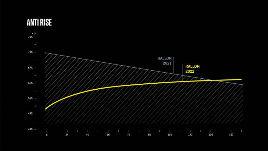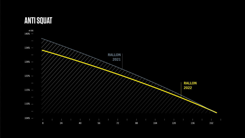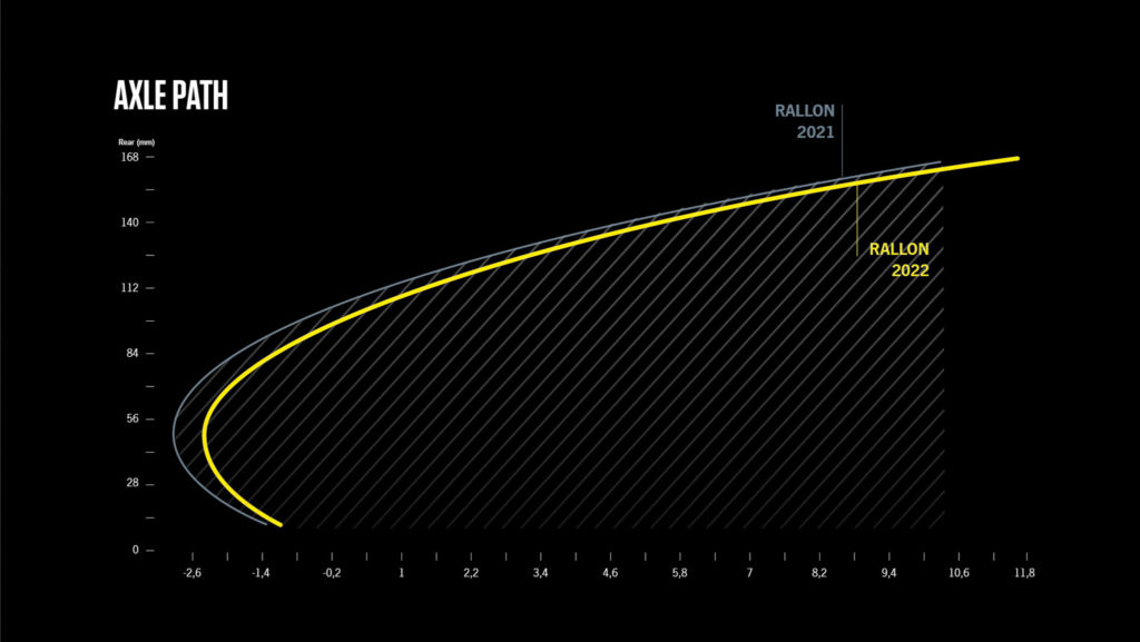 Côté cinématique et suspension, le débattement du Rallon R6 est de 160mm, associé à une fourche de 170mm. Le vélo se veut plus progressif pour un meilleur contrôle et plus stable avec un axe de roue arrière qui recule davantage quand la suspension se compresse. On découvre des valeurs d’anti-squat assez similaires au R5 et un anti-rise qui sépare un peu plus la suspension des effets du freinage.