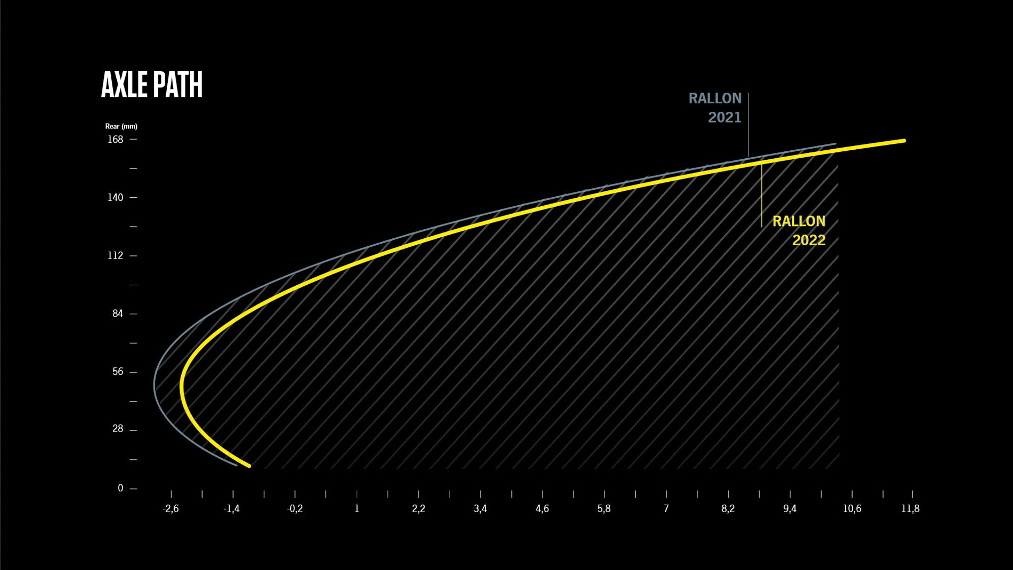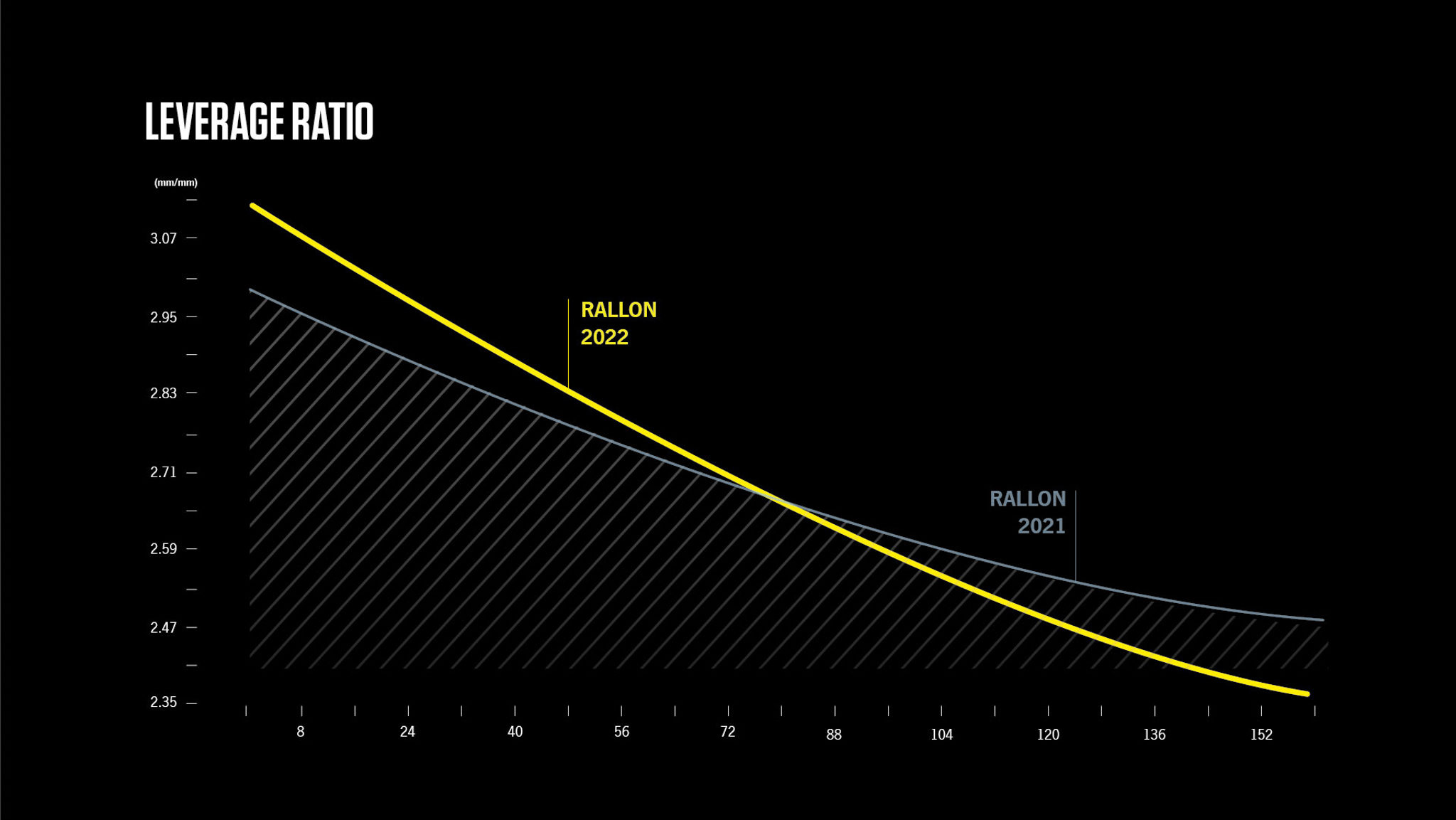Comme c’est de plus en plus commun, le vélo s’allonge et les bases du Rallon passent de 435 à 440mm de long pour un empattement global de 1260mm en taille L. Le reach augmente de près de 40mm en taille L pour passer de 455 à 485mm.