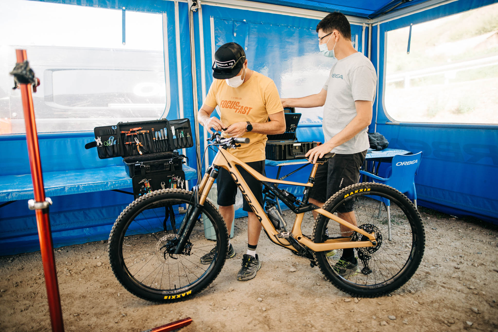 Grosse nouveauté également sur ce nouveau Rallon : il est compatible « mullet ». Comprenez une roue avant de 29 pouces associée à une roue arrière de 27,5 pouces. Au moment de la conception, la marque était tiraillée dans son choix de format de roue, et elle a finalement opté pour une double compatibilité moyennant le changement d’une pièce de la biellette (fournie avec chaque vélo) et d’une roue évidemment. Quel avantage ? La marque souhaite offrir les deux options à son équipe mais surtout à ses clients qui sont parfois demandeurs d’un vélo un peu plus joueur du train arrière et facile à faire tourner dans la pente. Est-ce que c’est le montage le plus rapide en toute circonstance ? L’équipe Orbea-Fox pourra probablement nous prouver le contraire.