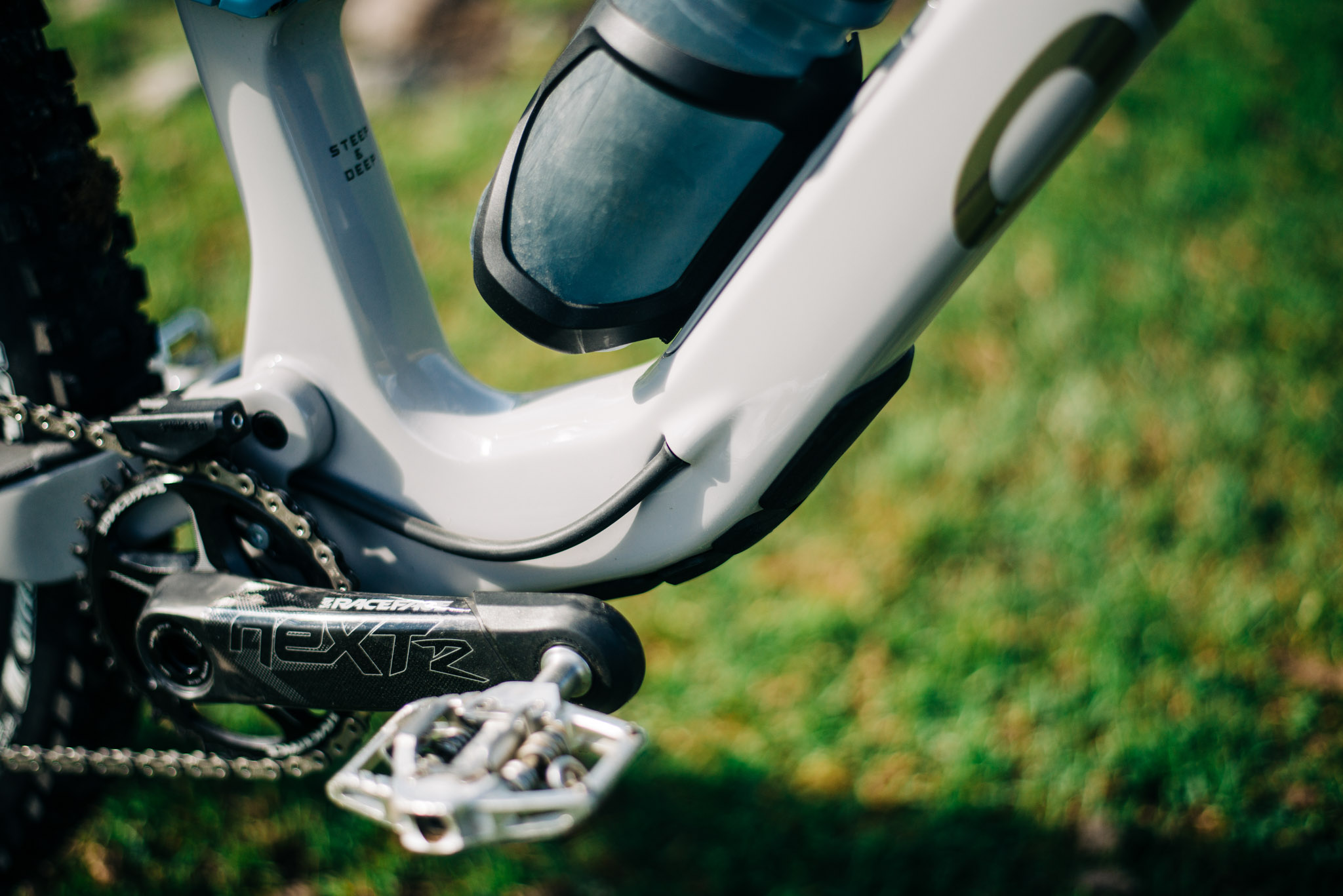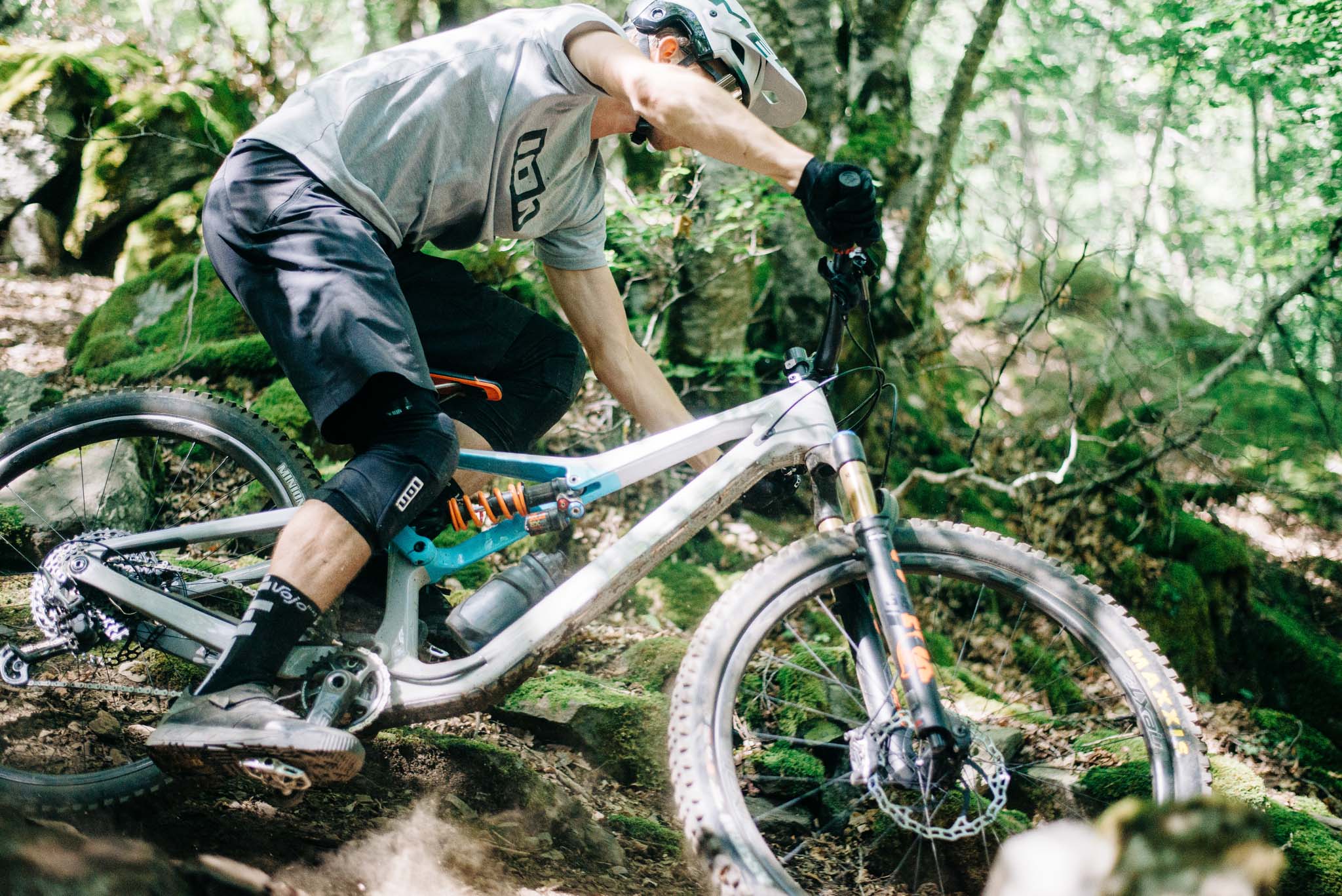 Première modification faite sur le vélo, on bascule sur un amortisseur à ressort qui vient directement « poser » encore plus le vélo en descente. Il n’y a pas besoin de charger l’avant outre-mesure pour faire virer la machine mais on se sent encore plus en confiance dans les portions défoncées qui s’enchaînent. La différence n’est pas radicale, mais on commence à trouver les caractéristiques d’un vélo qui pourra faire face à n’importe quelle situation en descente.