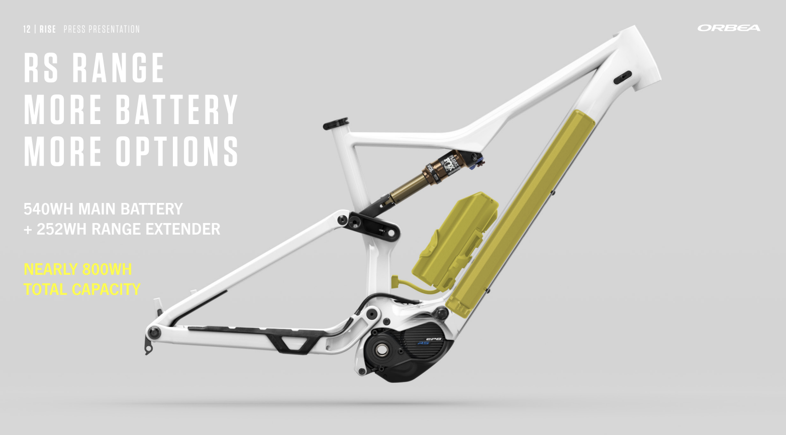 Avec cette batterie plus grande, mais qui reste relativement légère (2,7kg), Orbea a aussi voulu offrir un critère de différenciation supplémentaire entre les châssis carbone et alu, en donnant un côté plus rando au long cours/aventure/marathon au Rise alu, tout en renforçant le profil plus sportif du Rise carbone. Nous avons déjà pu faire plus de 175km et 4000m de d+ avec le Rise carbone, sa petite batterie, et le range extender (+250Wh), et on se demande donc quelles seraient les limites avec la version alu ! C’est l’occasion de souligner que le châssis alu est, lui aussi, compatible avec le range extender, mais il semble qu’il sera moins vite nécessaire que sur le modèle en carbone.