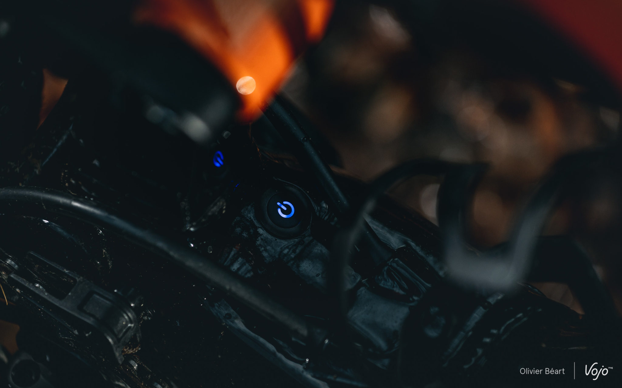 Toujours dans cet esprit de vélo très naturel et pas trop électrique, le poste de pilotage est très épuré et se passe, comme sur la version carbone, de tout écran de contrôle. On retrouve tout juste la commande au guidon à main gauche pour naviguer dans les trois modes d’assistance, et un minuscule indicateur accroché aux câbles devant le poste de pilotage pour montrer à l’aide de petites diodes dans quel mode on se trouve et l’état de la batterie. Même si nous aimons le côté sobre, c’est à notre sens trop minimaliste et l’affichage du niveau de batterie manque vraiment de finesse (diode verte, orange puis rouge) pour donner une idée correcte du niveau de batterie restante. Heureusement, comme nous le verrons plus loin, l’Orbea Rise alu est particulièrement frugal et le risque de panne sèche est plus limité qu’avec d’autres modèles. Il y a aussi toujours l’application « Rider Connect », qui permet d’afficher plus d’infos sur un terminal Garmin (GPS, montre, etc). Mais cela nécessite un investissement supplémentaire.
