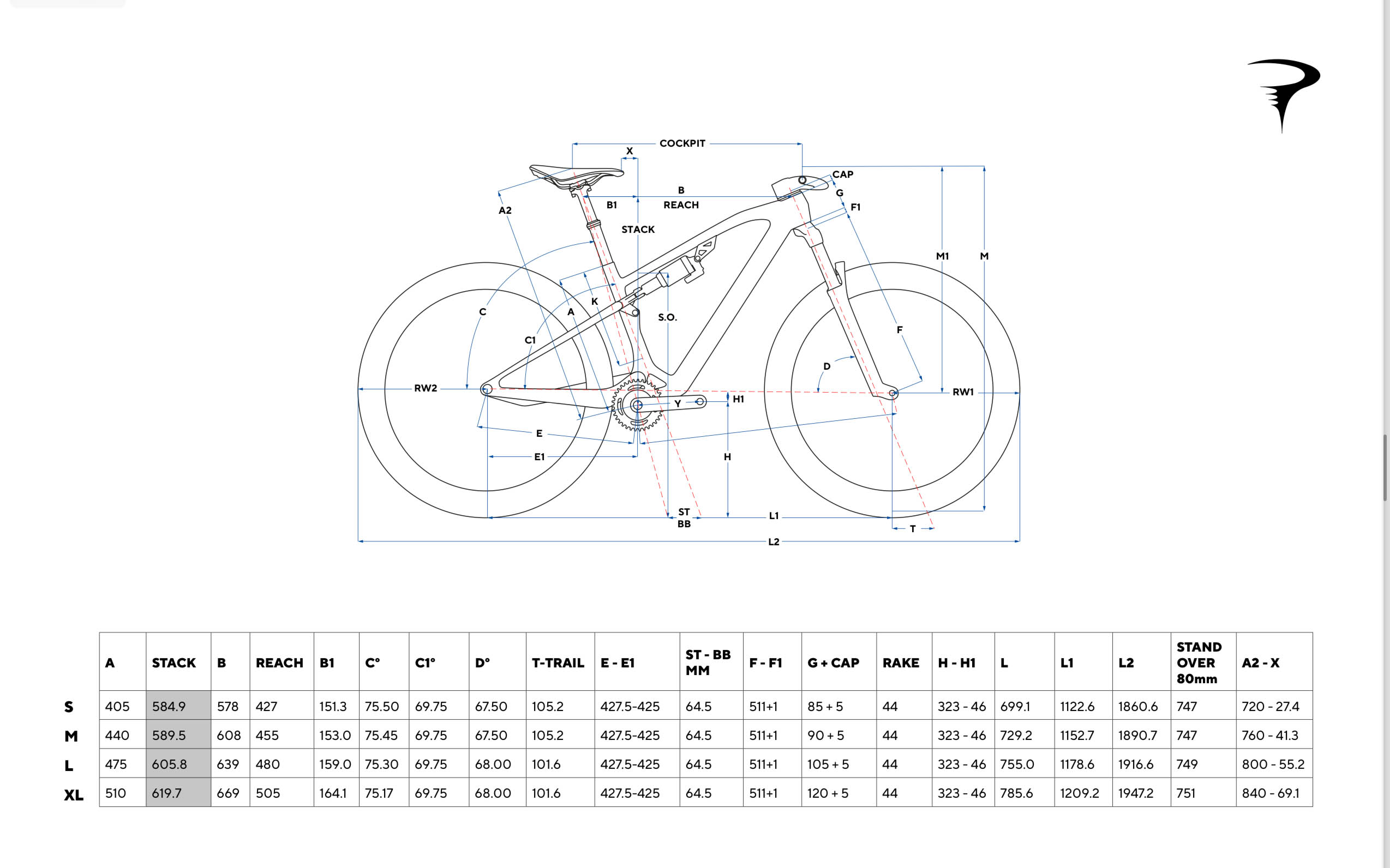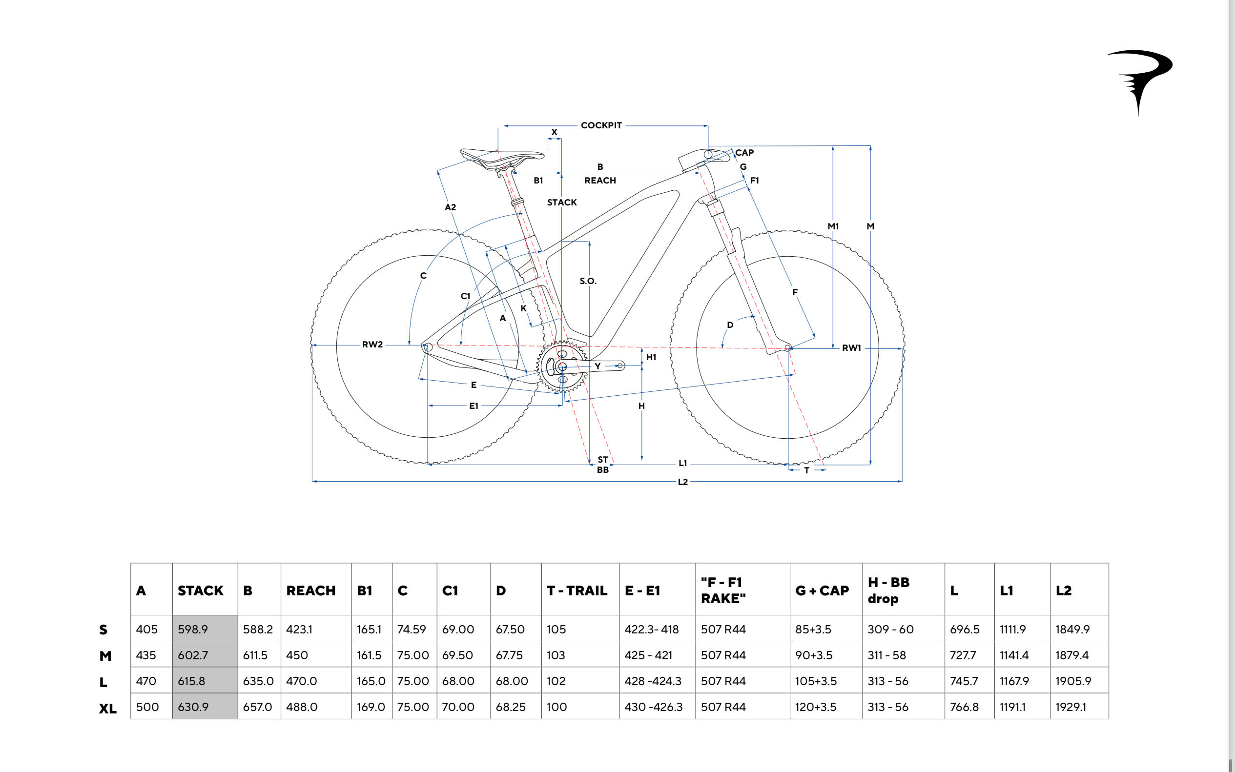 Les cotes sont un mélange de valeurs très contemporaine (reach important) avec d’autres plus conservatrices (angle de direction à 67,5/68° selon la taille) et certaines plutôt radicales (comme les bases en 427,5mm sur le tout-suspendu et comprises entre 422 et 430 mm selon les tailles sur le semi-rigide). Quatre tailles seront disponibles, du S au XL.