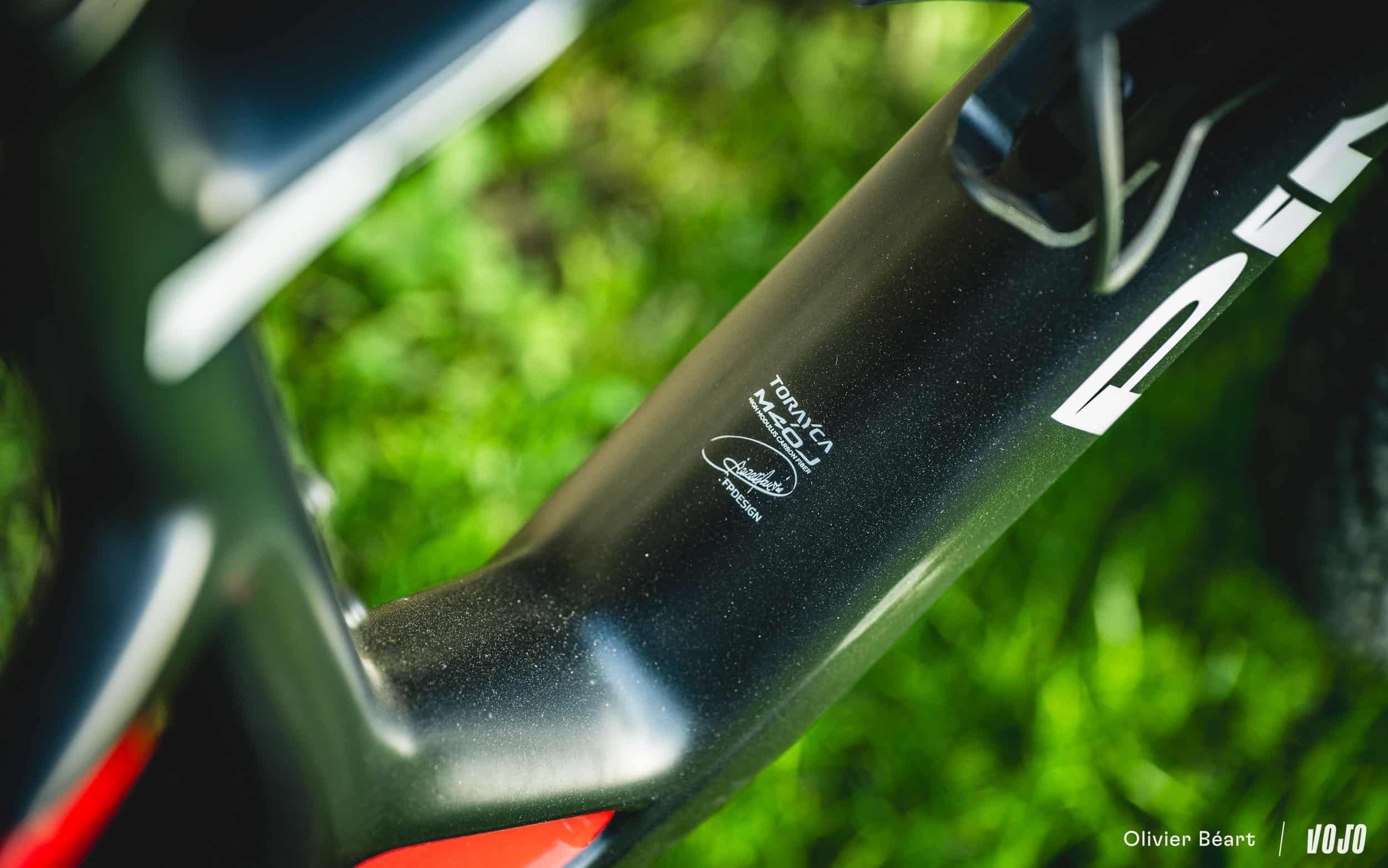 Pour arriver à ce poids, la marque Italienne a utilisé les fibres M40J, les plus haut de gamme de son partenaire habituel Toray. Ces fibres ne sont utilisées que sur le montage haut de gamme et sur le kit cadre. Il existera une deuxième version un peu plus lourde (+ 50 g seulement) et moins chère. Le vélo complet de série le plus léger est annoncé à 10,2 kg. A noter aussi que ces cadres Pinarello VTT sont tous fabriqués au Portugal.