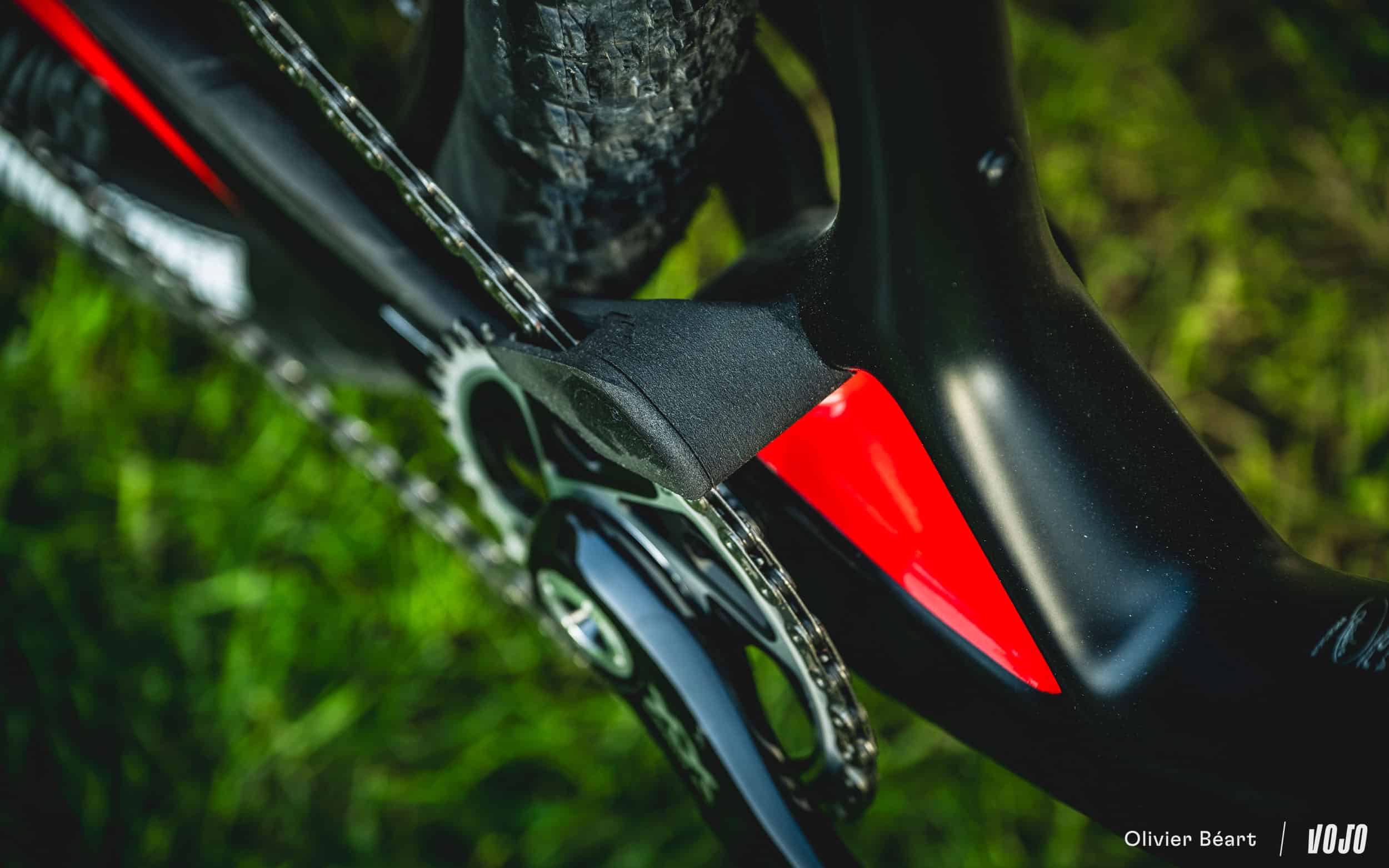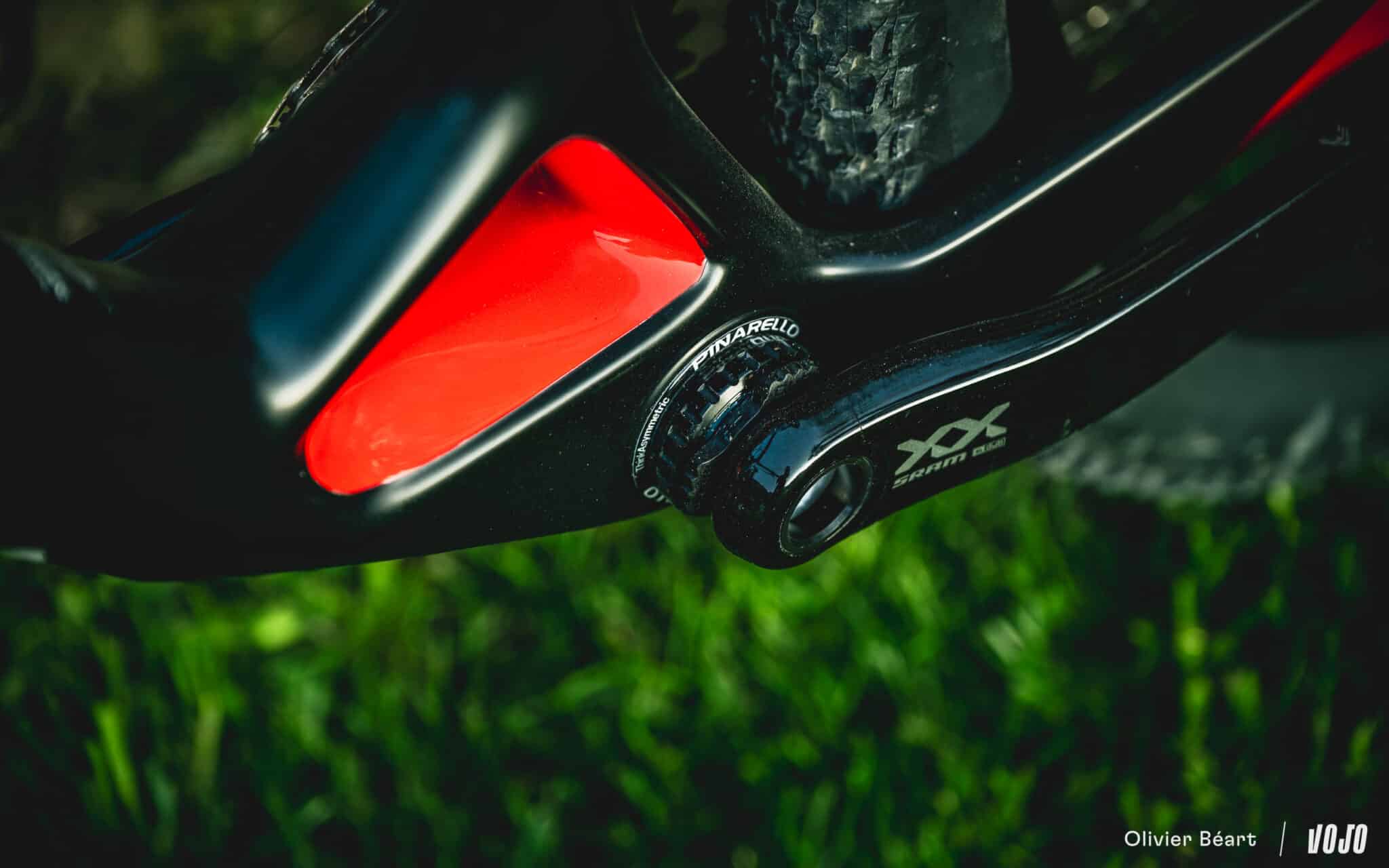 On remarque aussi que le triangle arrière est asymétrique, une marque de fabrique de Pinarello. L’ingénieur en charge du projet nous explique : « Les cadres Pinarello sont asymétriques depuis longtemps. Les précédents VTT l’étaient aussi. C’est une évidence pour nous car la transmission génère des efforts particuliers du côté droit du cadre, et une rigidité dosée de manière optimale passe selon nous par cette asymétrie. »