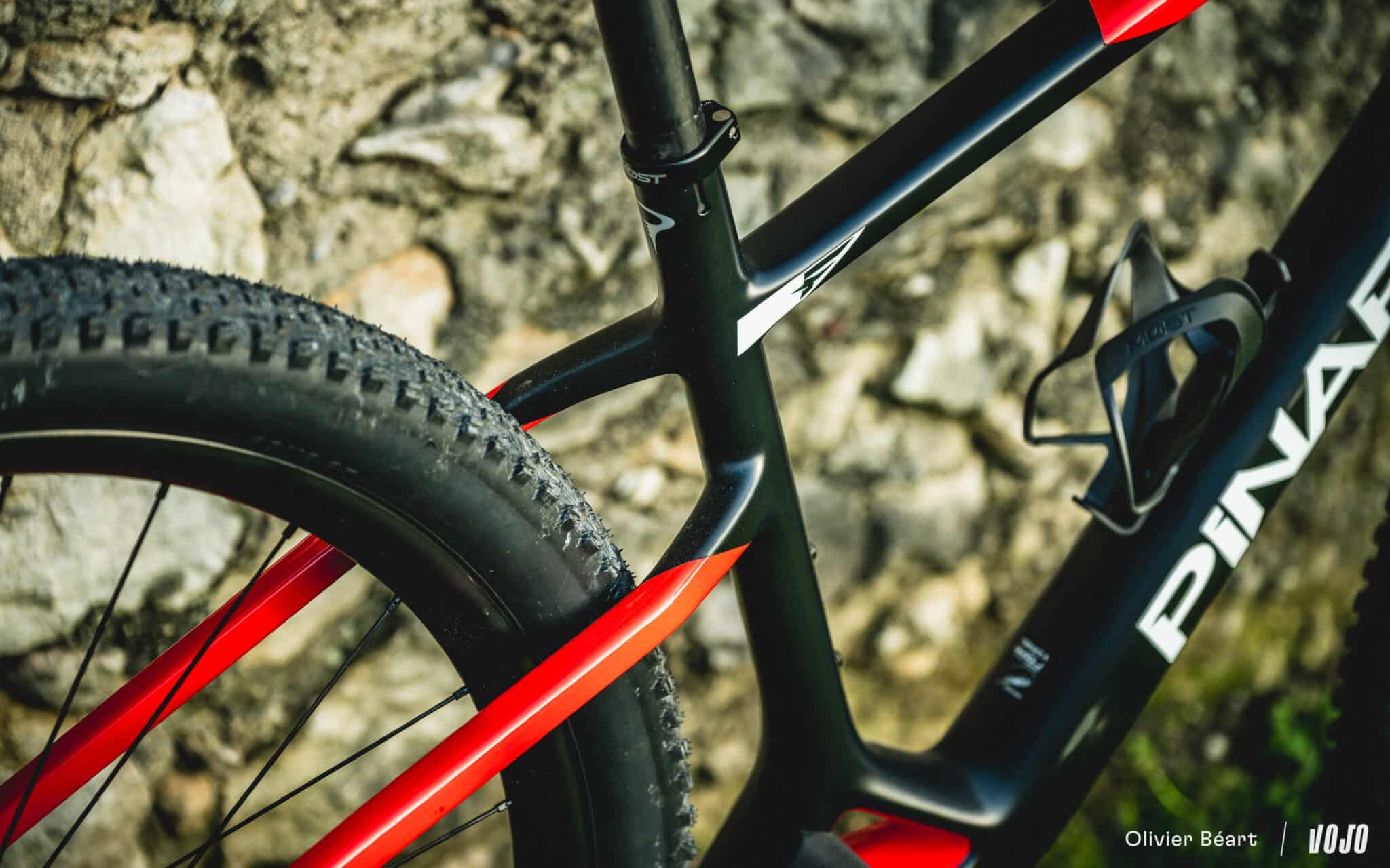 Pour conserver une rigidité optimale, le point de pivot principal est très généreusement dimensionné et l’axe en deux parties (breveté) est moulé directement sur le bras arrière. Il en résulte, selon Pinarello, une conception à la fois très légère et vraiment rigide. On notera aussi qu’il n’y a pas de point de pivot arrière et que la marque joue sur la flexibilité du carbone au niveau des haubans pour s’en passer, comme la plupart des XC du marché à l’heure actuelle.