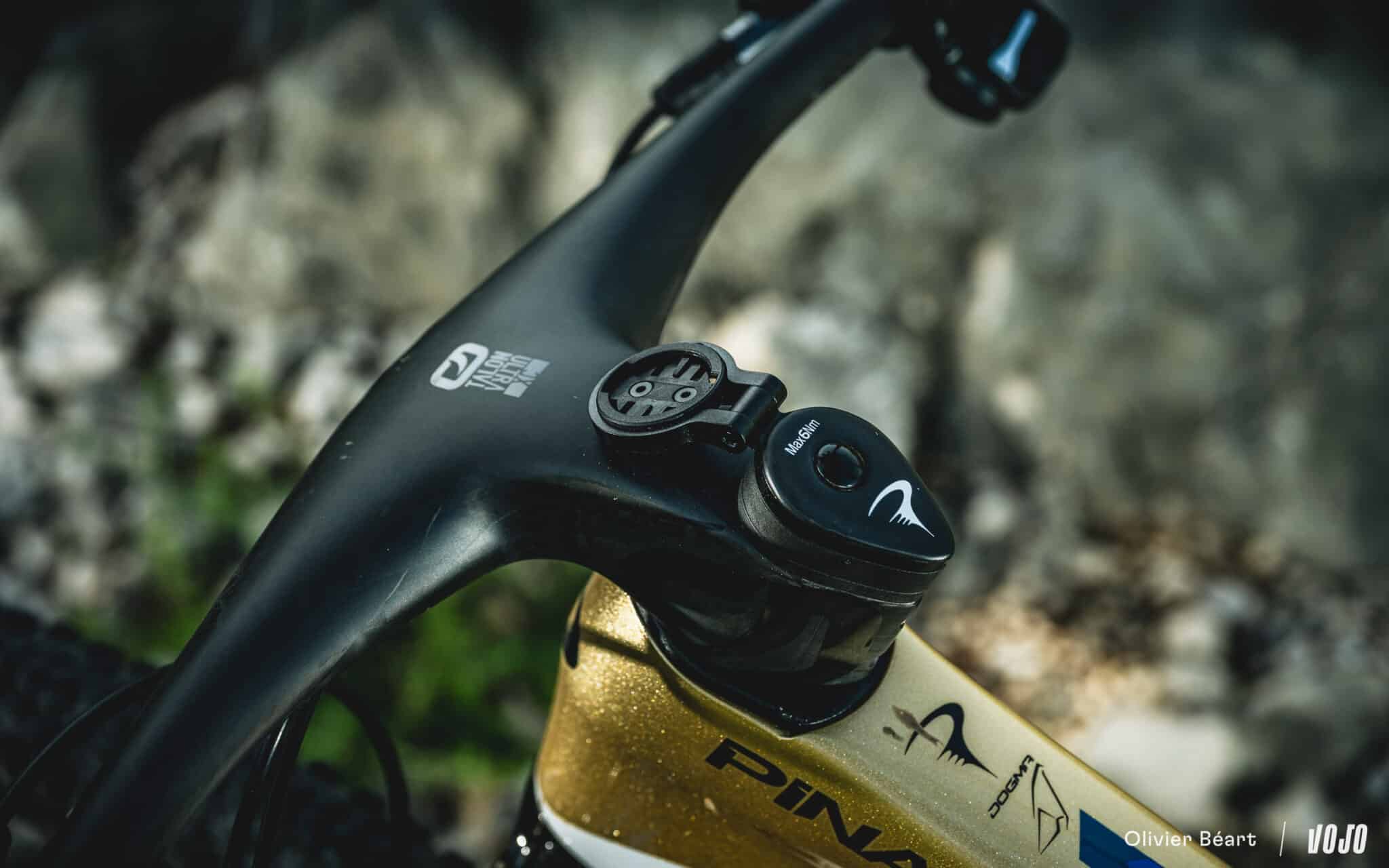 Large de 760mm, il sera disponible en longueur de potence de 60 et 80mm avec, signe de sa radicalité, un angle plongeant de -18° ! Il faut souligner la bonne initiative de Pinarello, qui livre un porte-GPS bien intégré avec son combo, et qui l’a étudié pour qu’il soit facilement ajustable en hauteur grâce à des cales différentes qui se placent en haut ou en bas de la potence. Il intègre aussi un blocage à 60° d’angle de rotation du guidon à partir de la position neutre (120° entre les deux extrêmes, donc) pour éviter les impacts avec le tube supérieur. En soi c’est une bonne idée, mais 60° de rotation c’est très peu et cela nous a perturbé dans certains virages très serrés (épingles) et dans des manœuvres à basse vitesse.