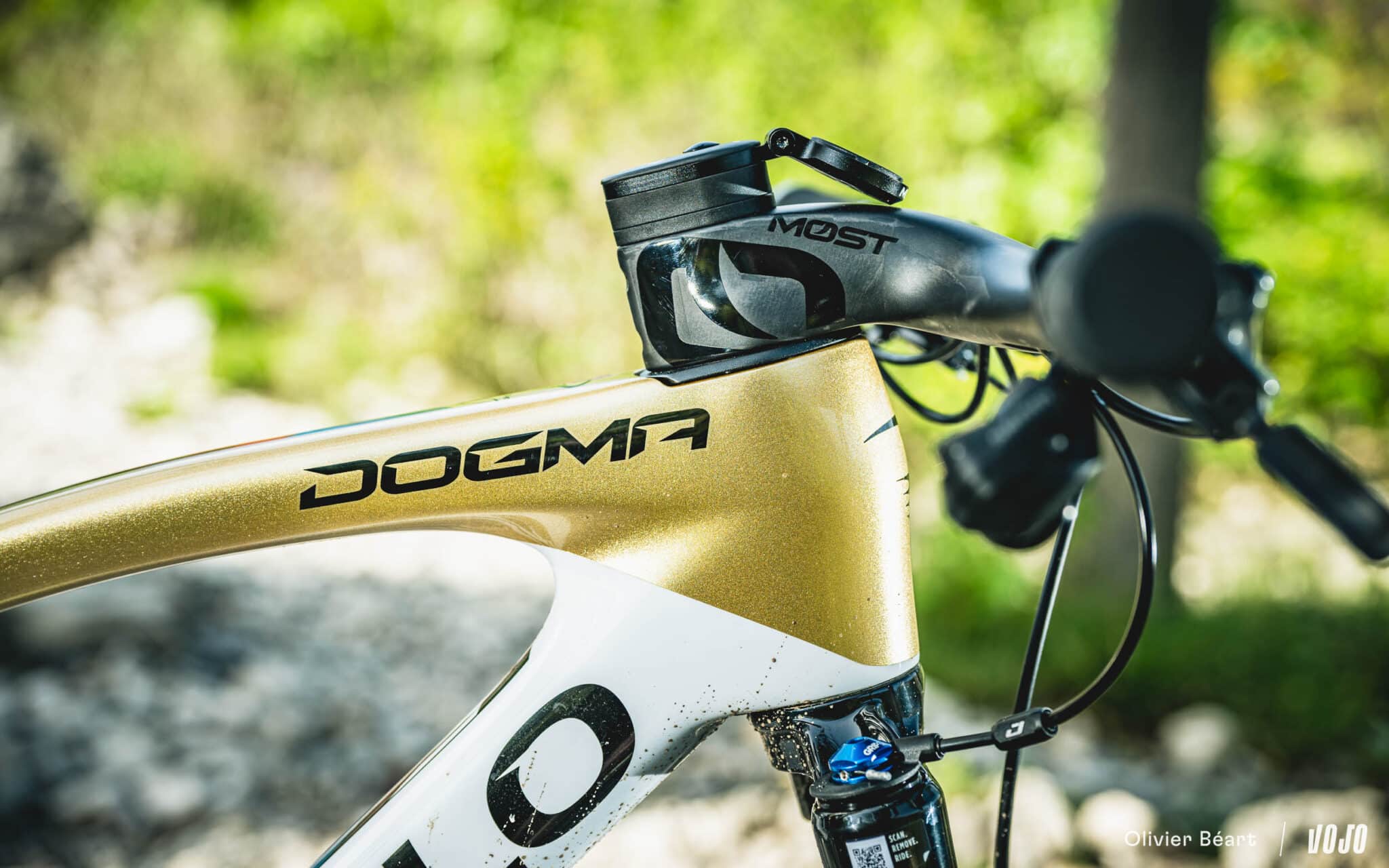 Pour le reste, Pinarello a dû avoir recours à des composants plus classiques que sur les vélos du team Ineos. Exit par exemple les roues P1 qui sont remplacées par des DT Swiss 1501 carbone. Exit aussi les suspensions Suntour Tact électroniques. Le chef produit s’explique : « Nous croyons vraiment en ce système, et le vélo a été développé en pensant à lui, mais ce n’est pas encore disponible à la vente pour des vélos de série. Nous sommes donc partis vers ce qui, selon nous, se fait de mieux en produits de grande série à tous les niveaux. »