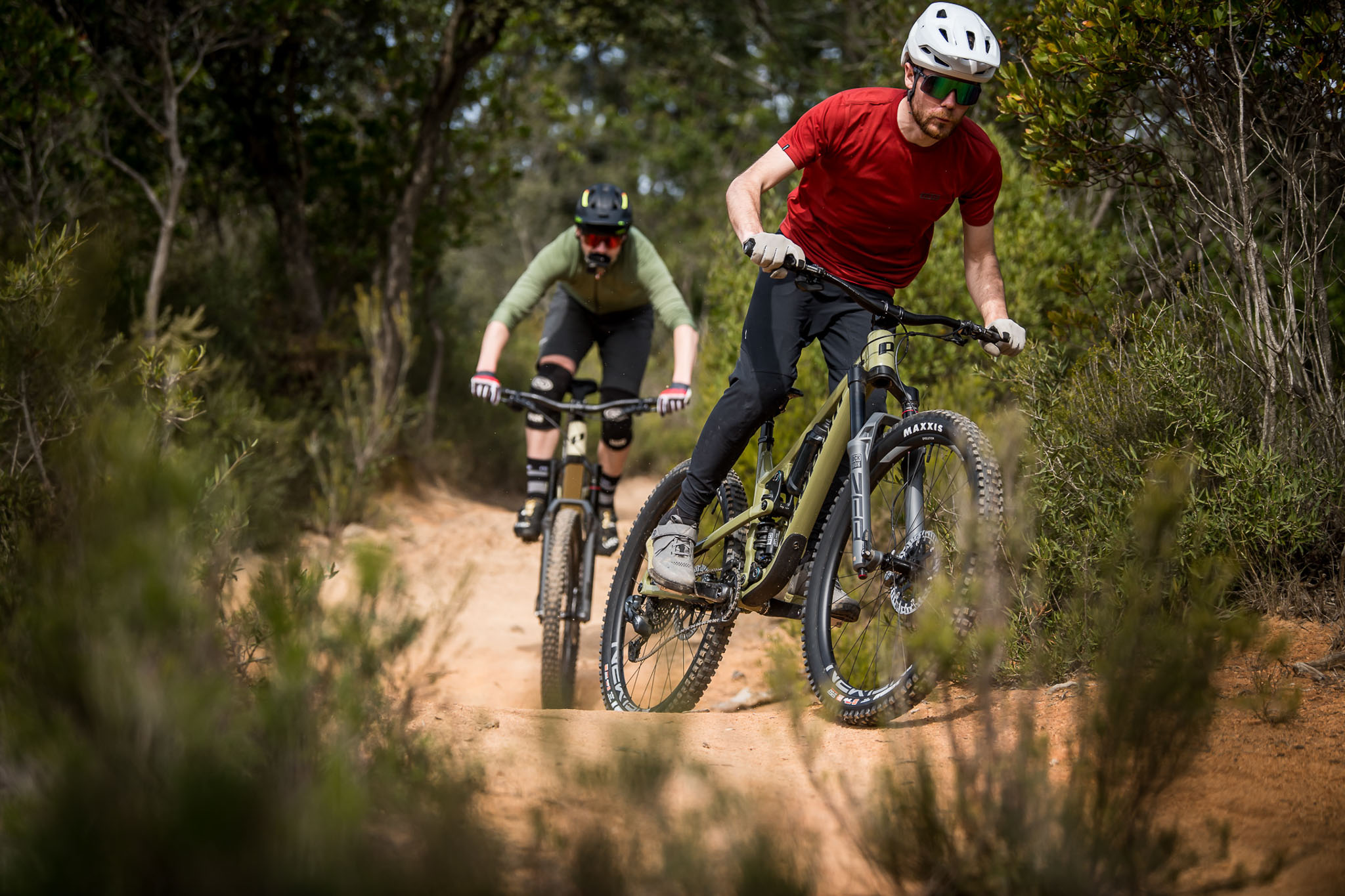 Une fois n’est pas coutume, ce n’est pas sur un mais sur deux vélos que nous avons réalisé cette prise en main. Propain avait en effet à cœur de mettre en avant l’éventail de possibilités offert par son configurateur et nous avait mis à disposition des montages bien différents afin d’expérimenter avec la polyvalence du Tyee. Pendant deux jours, nous avons donc alterné entre un Tyee AL avec fourche en 170 mm et amortisseur à ressort hélicoïdal (RockShox Zeb Ultimate / SuperDeluxe Coil Ultimate) et un Tyee CF en fourche 160 mm et amortisseur à ressort air (RockShox Lyrik Ultimate Flight Attendant / SuperDeluxe Ultimate Flight Attendant), les deux en taille M et 29″.