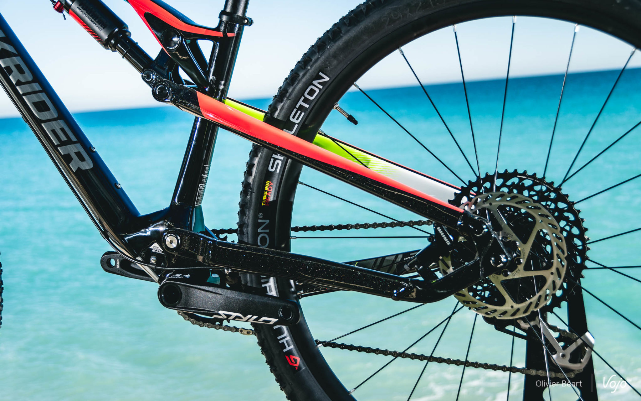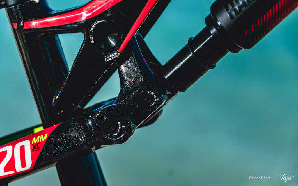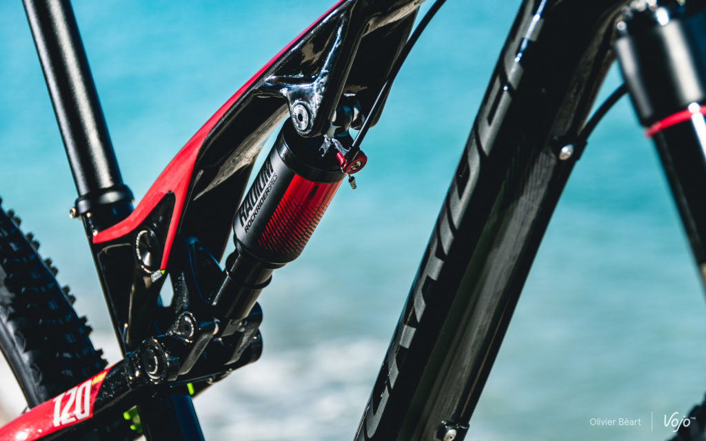 Côté suspension, exit la cinématique NEUF, on retrouve ici un plus classique monopivot + biellette, comme sur le XC100S alu sorti l’an dernier et avec qui il partage son bras arrière en alu comme dit un peu plus haut. Mais la biellette est différente et la cinématique a été optimisée pour un usage plus sportif et orienté compétition/performance.