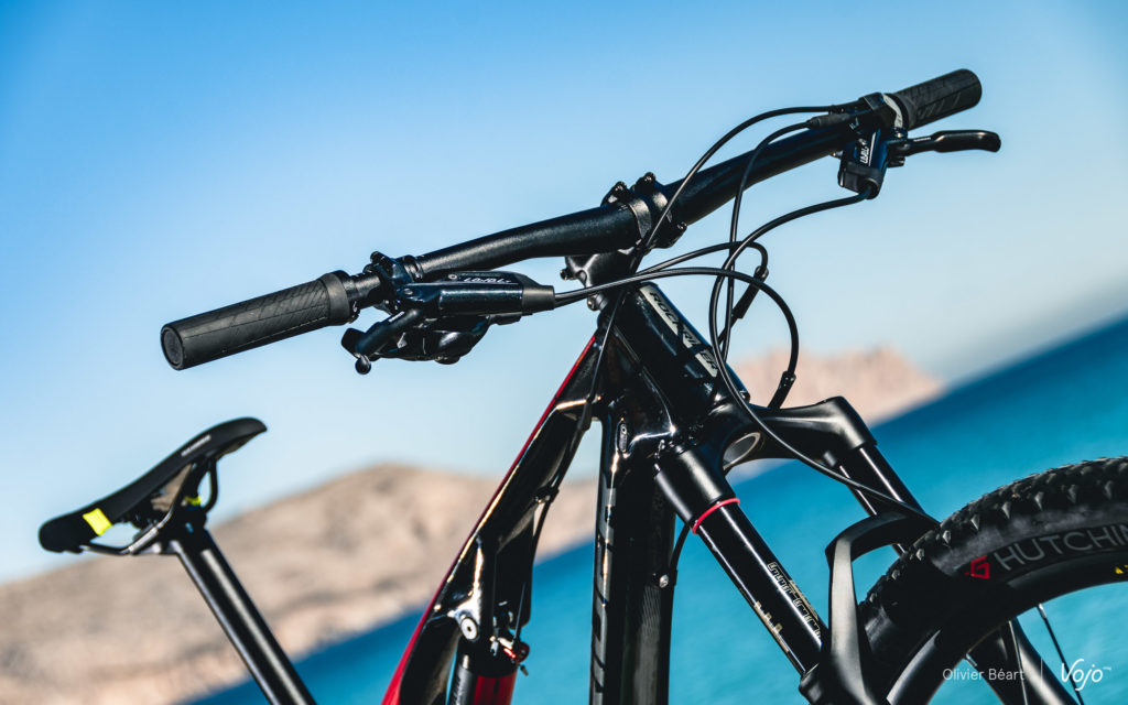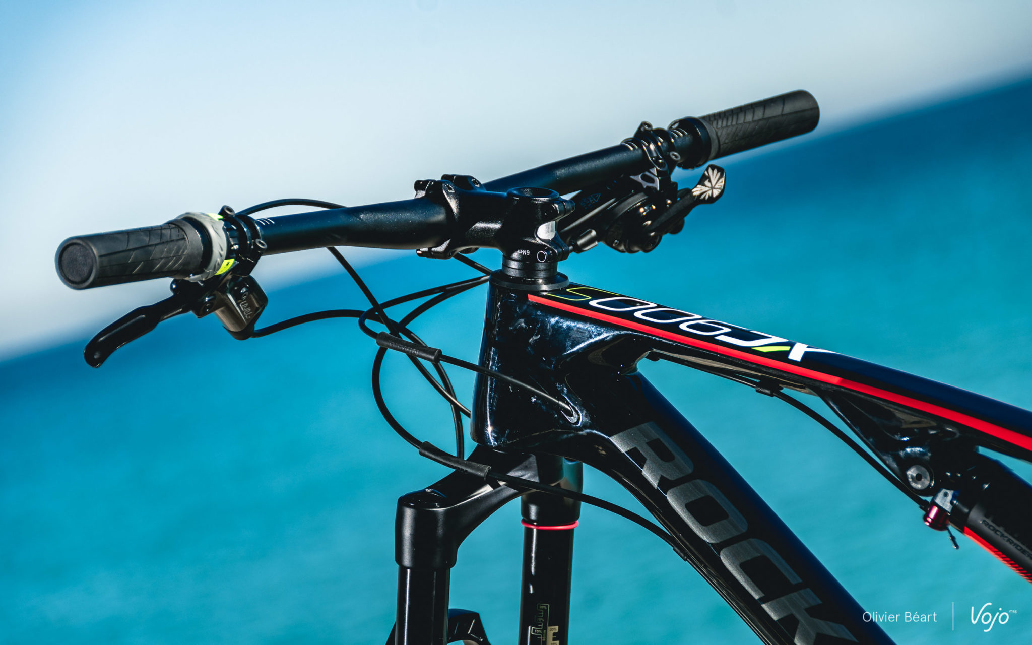Le reste des équipements est maison, avec un cintre alu en 720mm très classique, une belle potence en 70mm sur les vélos en taille S et M, 80mm en L et 90mm en XL. La tige de selle en alu avec recul pourra être (comme le cintre) avantageusement remplacée par un modèle en carbone dans le cadre d’upgrades futurs sur la machine. Ou alors on peut opter pour une tige de selle télescopique, qui peut s’avérer être un très bon choix pour le plaisir de pilotage, la sécurité et l’efficacité. A noter que la selle d’origine, développée par Rockrider, se montre plutôt très agréable pour le fessier, avec un beau compromis performance/confort.