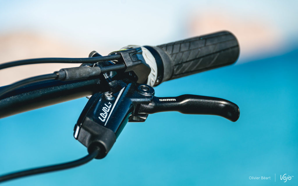 La fourche RockShox Reba RL est en 120mm et équipée d’un blocage au guidon à 3 positions, qui s’actionne simultanément avec l’amortisseur. Les freins proviennent également du groupe Sram, avec les Level T, basiques et pas hyper puissants, mais qui seront néanmoins suffisants pour beaucoup et qui permettent déjà de disposer de leviers avec une bonne ergonomie. Ils pourront néanmoins faire l’objet d’un upgrade par la suite.