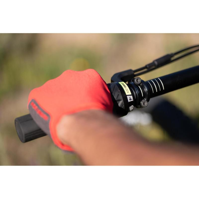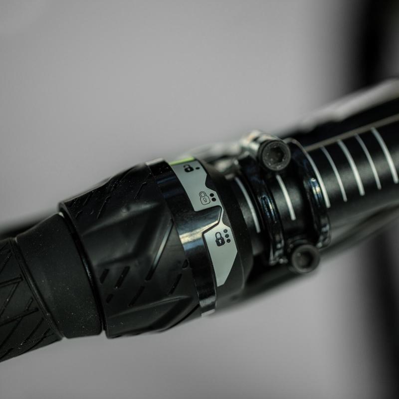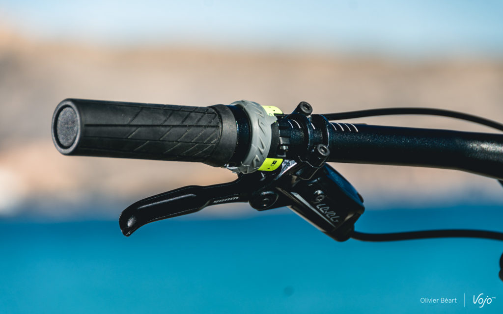 Au niveau de l’amortisseur, Rockrider reste fidèle à Manitou avec le Radium équipé d’un blocage au guidon à 3 positions. Il s’agit toujours de la fameuse poignée tournante développée par Rockrider, mais c’est une nouvelle version plus ergonomique qui équipera les versions de série (nos modèles d’essai pour la présentation étaient encore équipés de l’ancienne commande dont nous avons déjà à plusieurs reprise critiqué la forme et la prise en main).