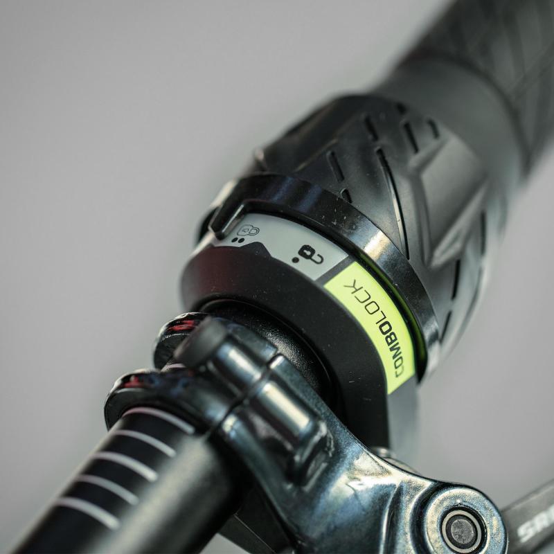 Cette nouvelle commande, toujours sous forme de poignée tournante mais plus large, actionne simultanément le blocage de l’amortisseur et de la fourche en mode ouvert/plateforme de pédalage (compression plus ferme mais pas bloquée)/blocage complet. Pour ceux qui connaissent, il s’agit d’un système très proche de celui lancé par RockShox il y a déjà deux saisons… mais dont Rockrider aurait la primeur et la paternité au niveau du brevet.