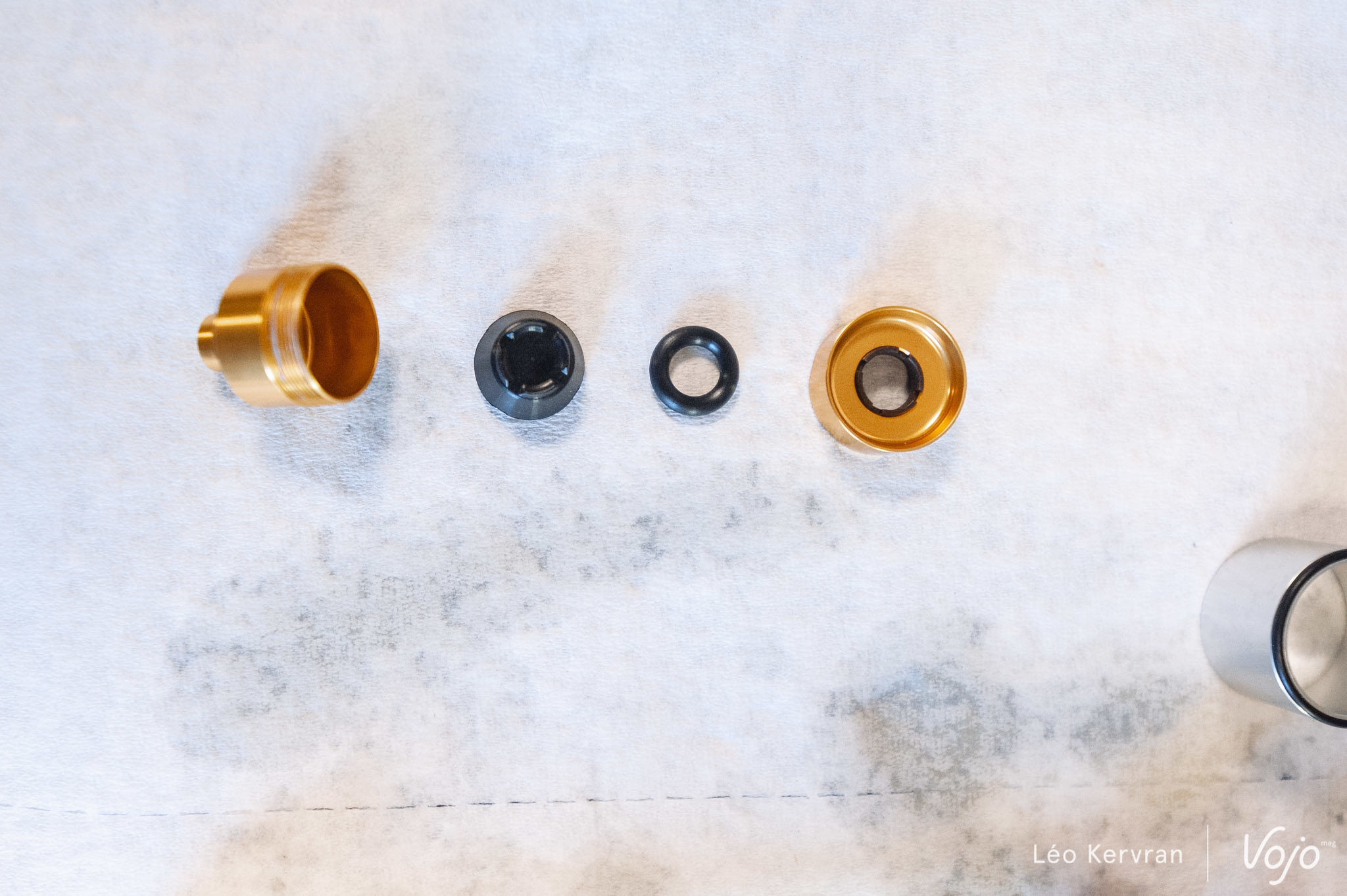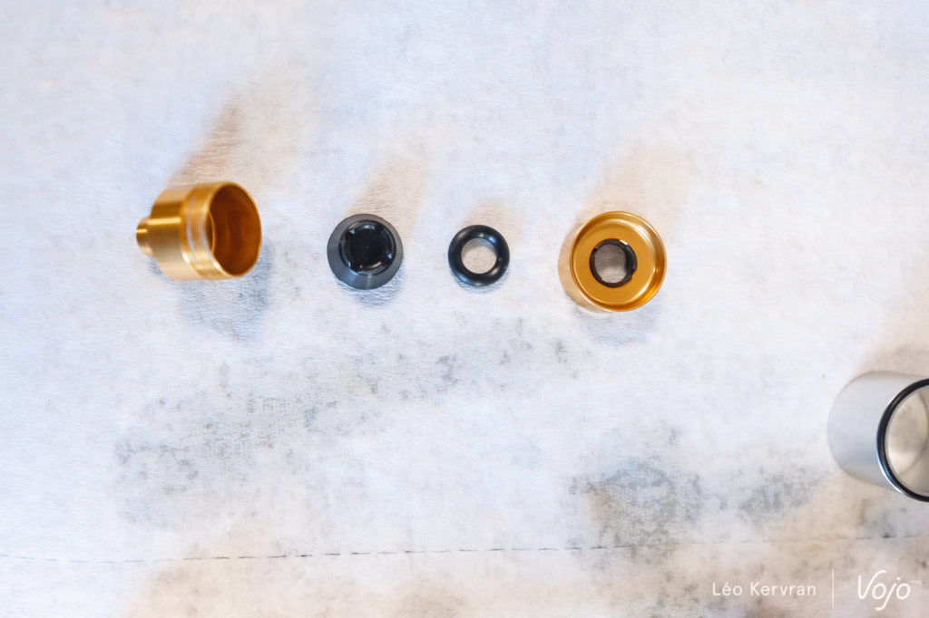 Enfin, tout ce petit monde est monté sur les ButterCups. Kézako ? Rien de plus que des silentblocs d’une vingtaine de grammes chacun, placés de chaque côté entre la tige du piston et le fond du fourreau. A l’intérieur de la petite boîte dorée, la tige du piston est coincée entre deux élastomères qui permettent jusqu’à 4 mm de déplacement.